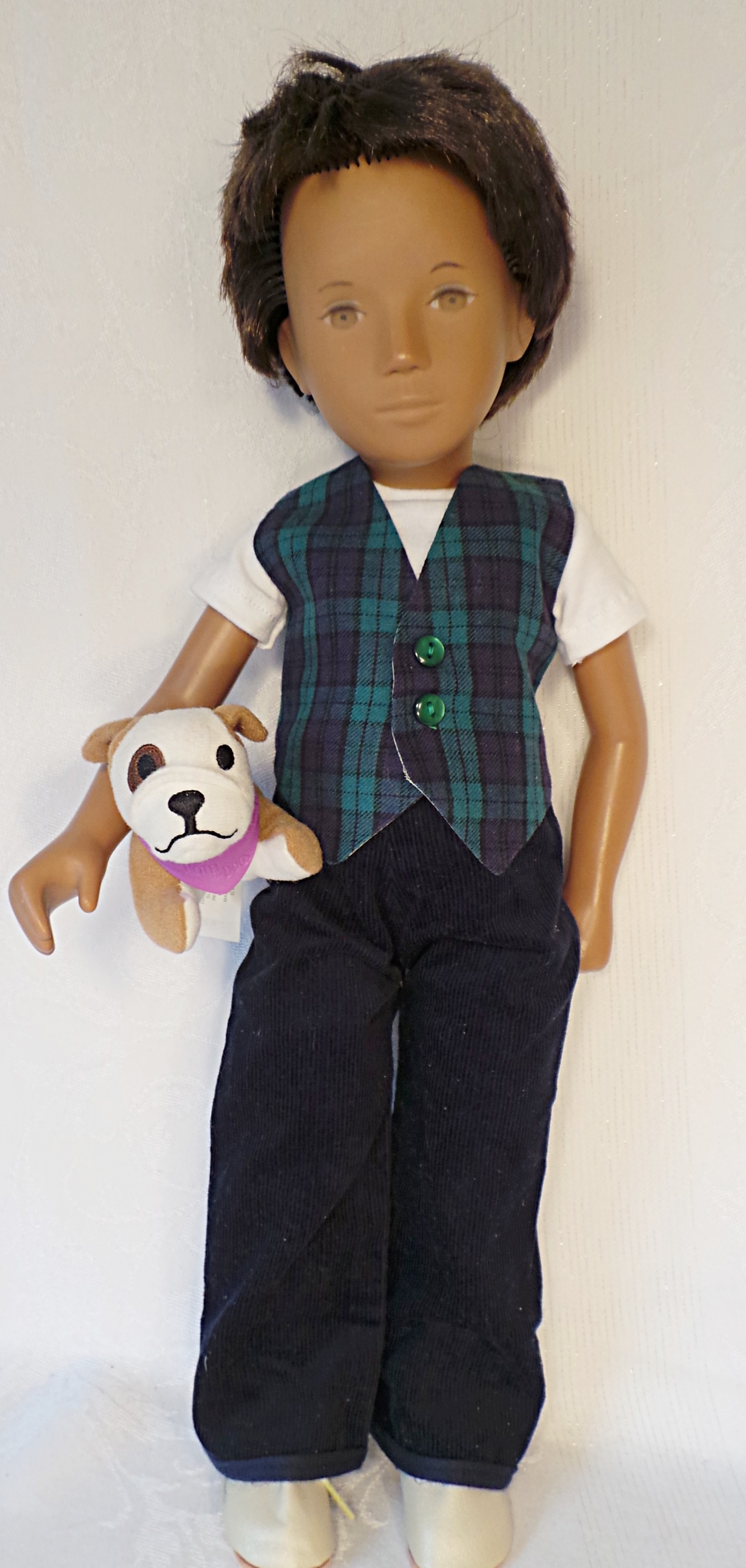 This handsome boy is Hans. I bought him from Jackie Kraemer at the Sasha Festival last year. Hans is another of those “happy mistakes” with his brunette hair and nice blue eyes. I just think he is so pretty but he does not like to be called pretty ;). He is a denim boy from 1974 and was a factory experiment that was not continued. He came in his original outfit which is stored away for him.