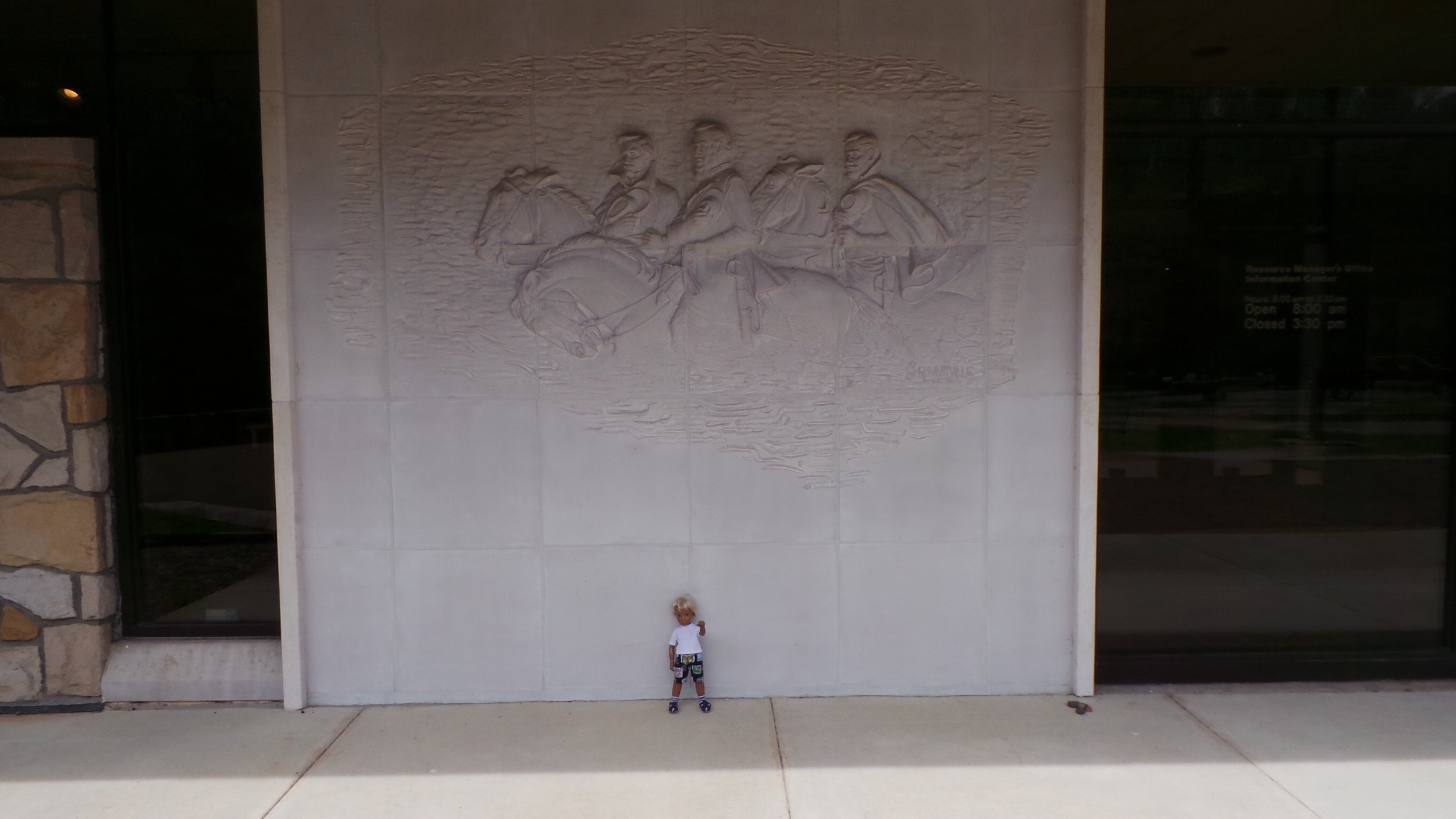 On the outside if the building, Finn poses under a relief of General Stonewall Jackson on horse.
