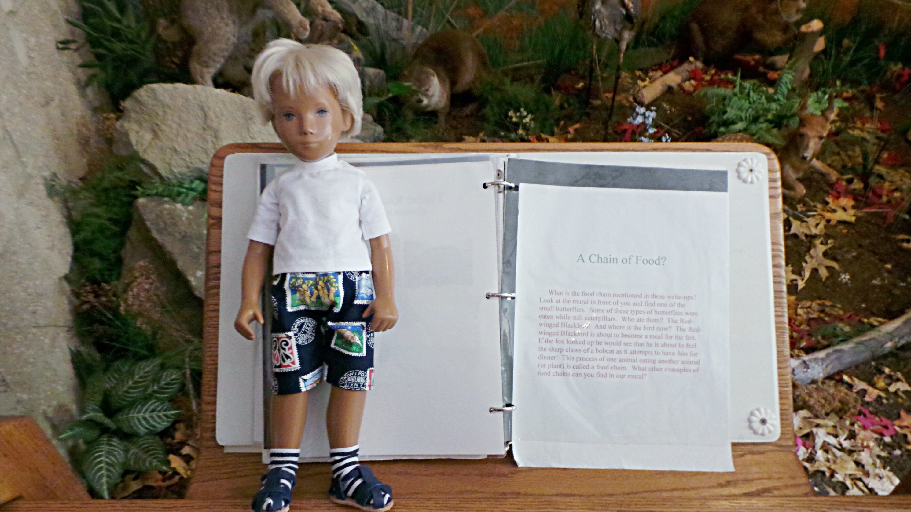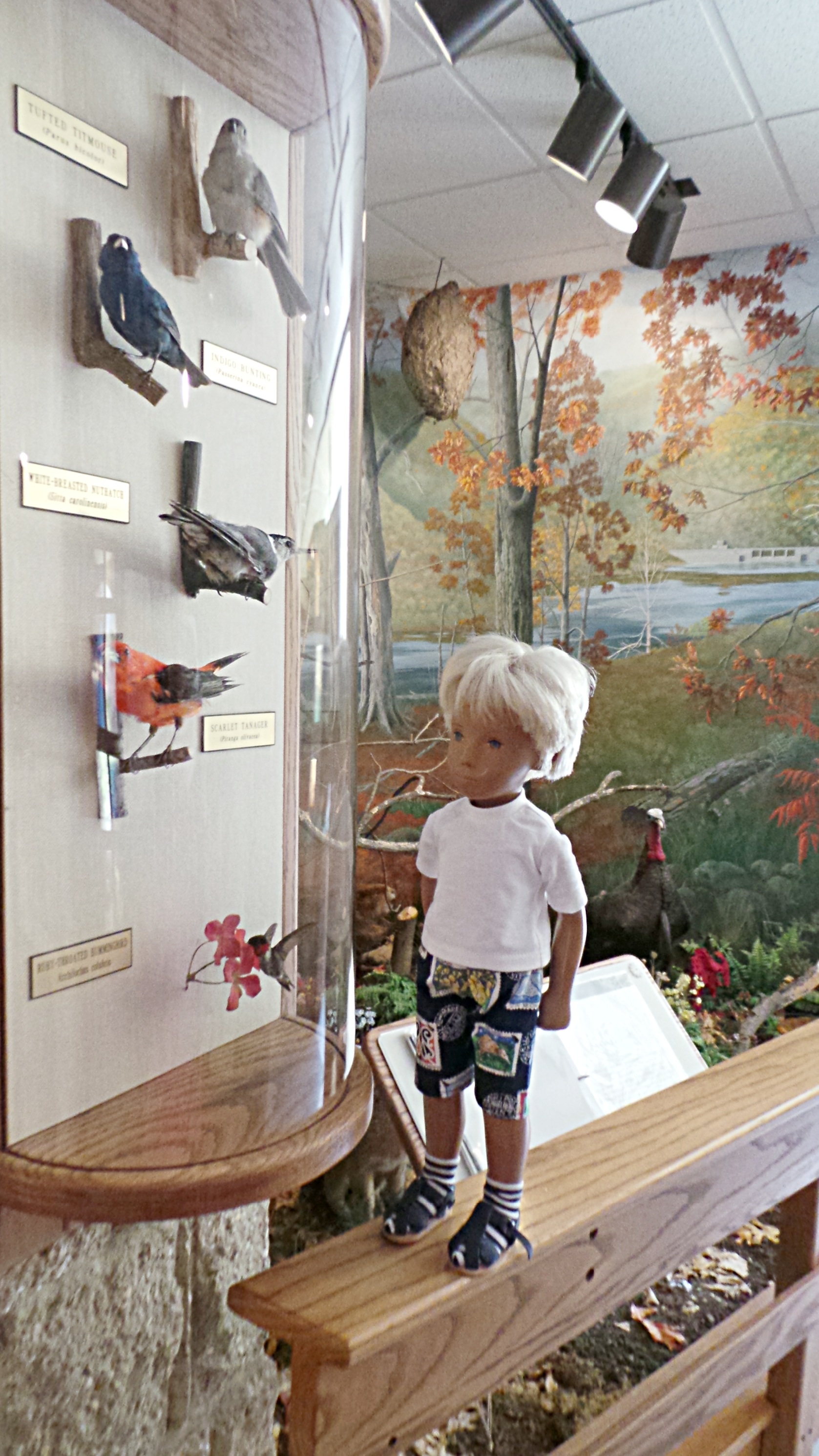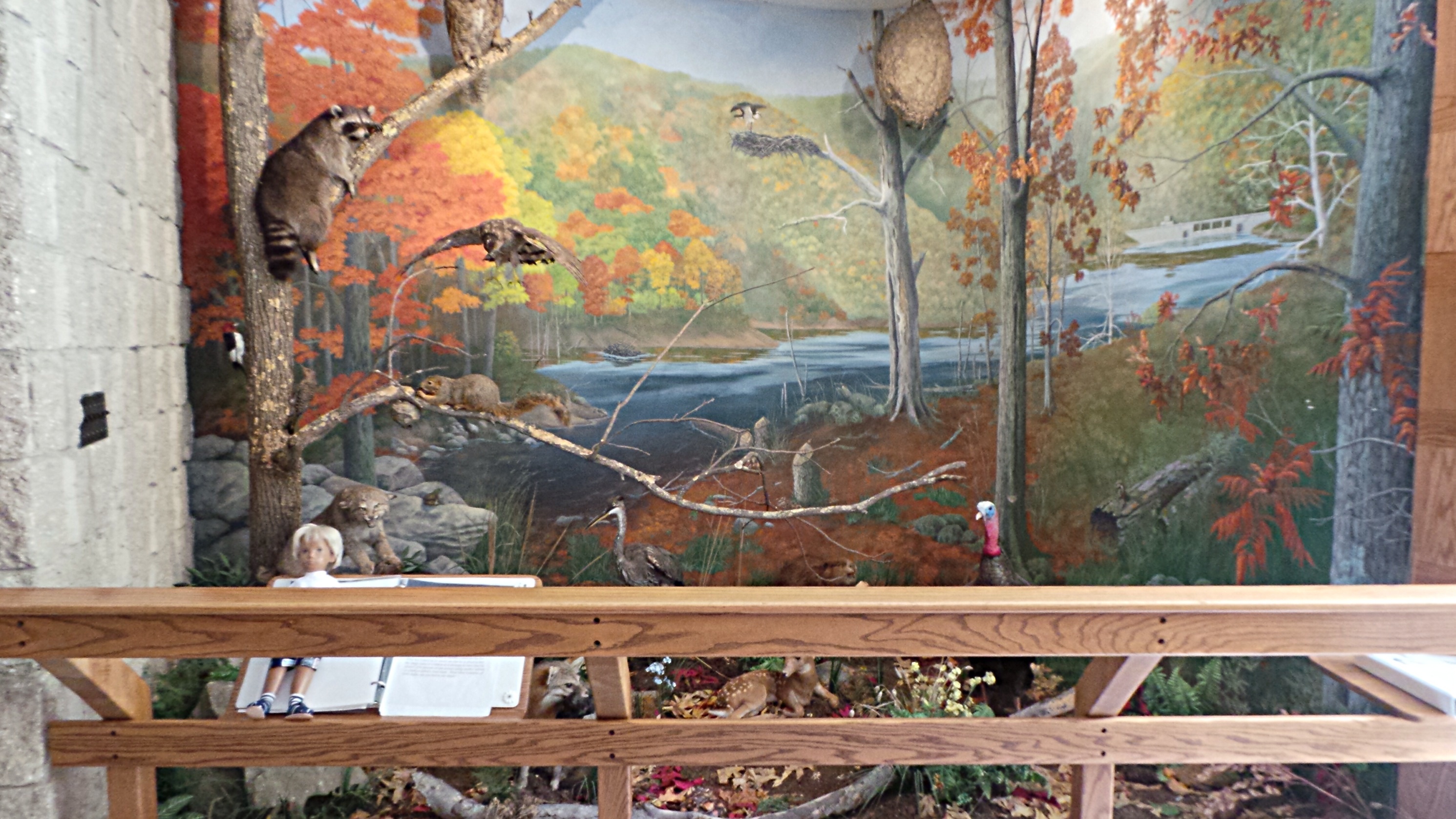 The mural was painted to show a Fall scene of the dam area. The birds and animals on display were either painted or preserved by taxidermy. The birds and animals were found deceased and preserved to help educate people and to increase their appreciation of the outdoors and the creatures that live there. It was a lot to take in but we tried πŸ™‚