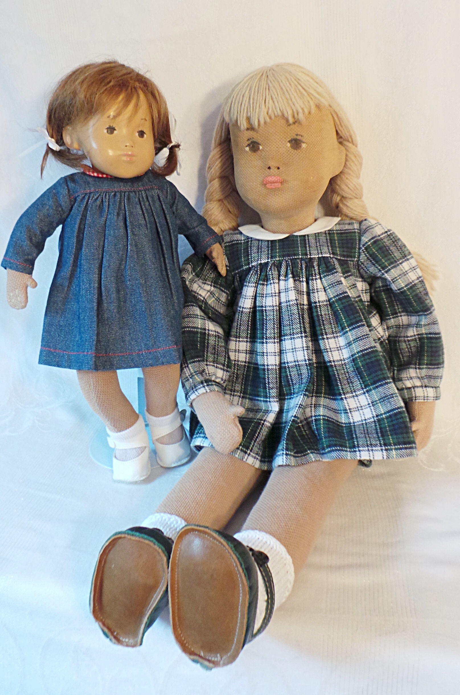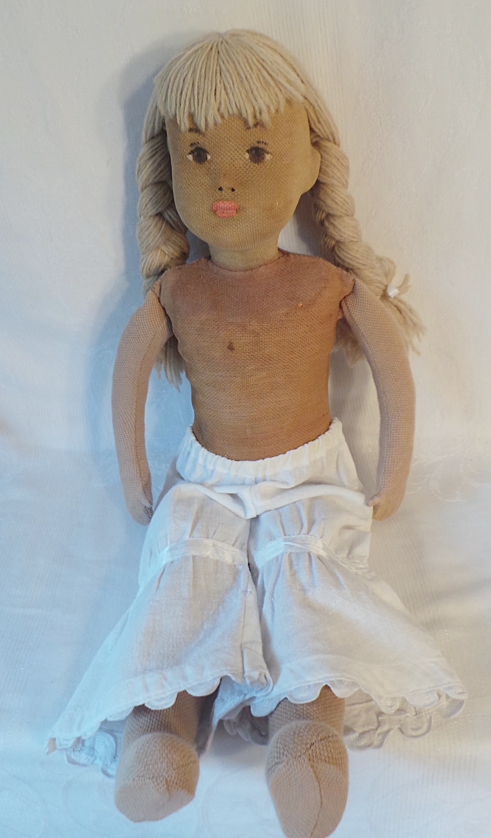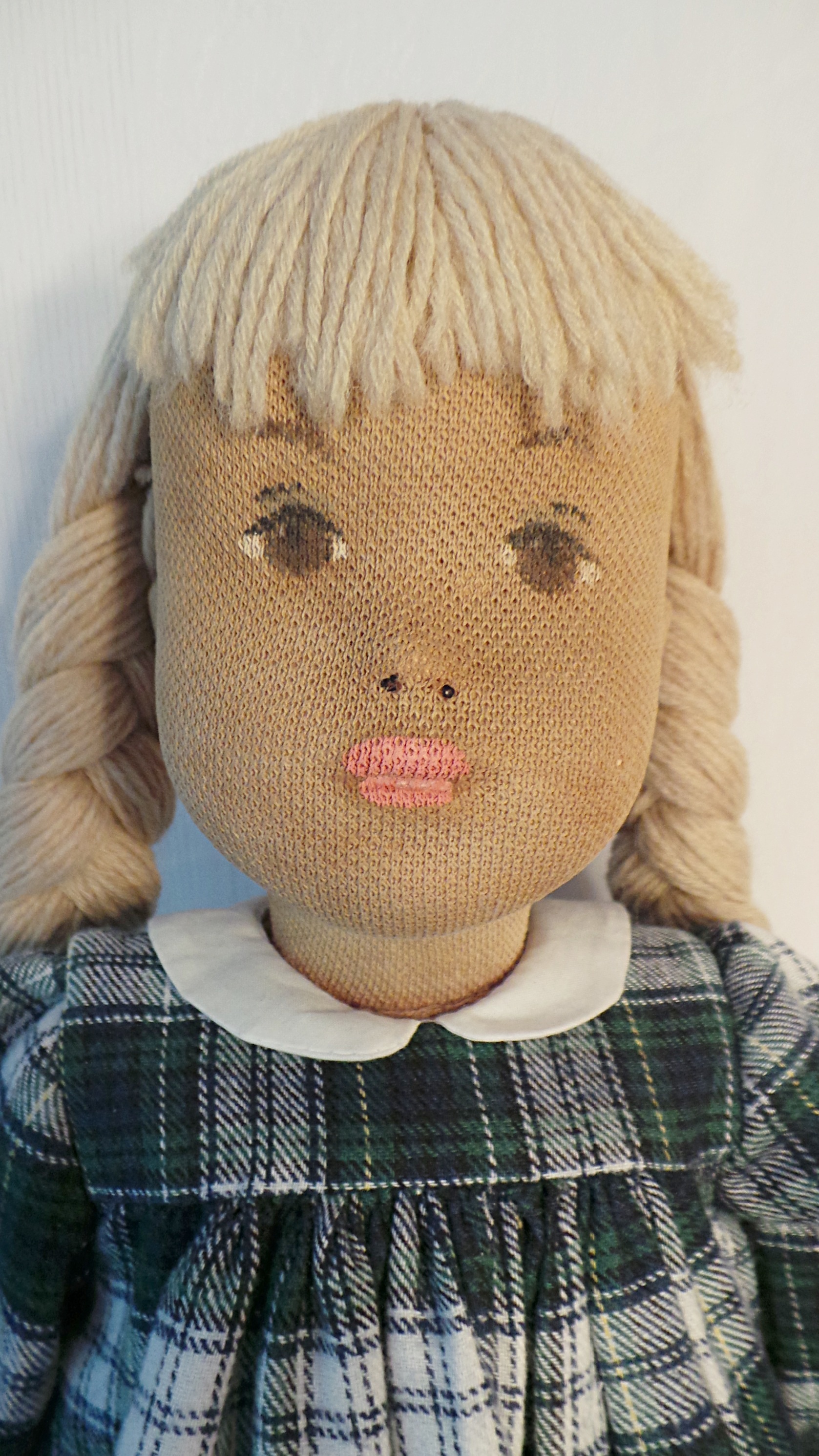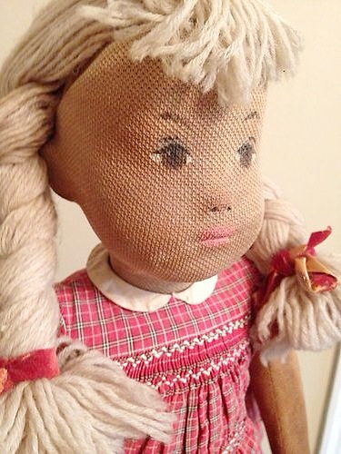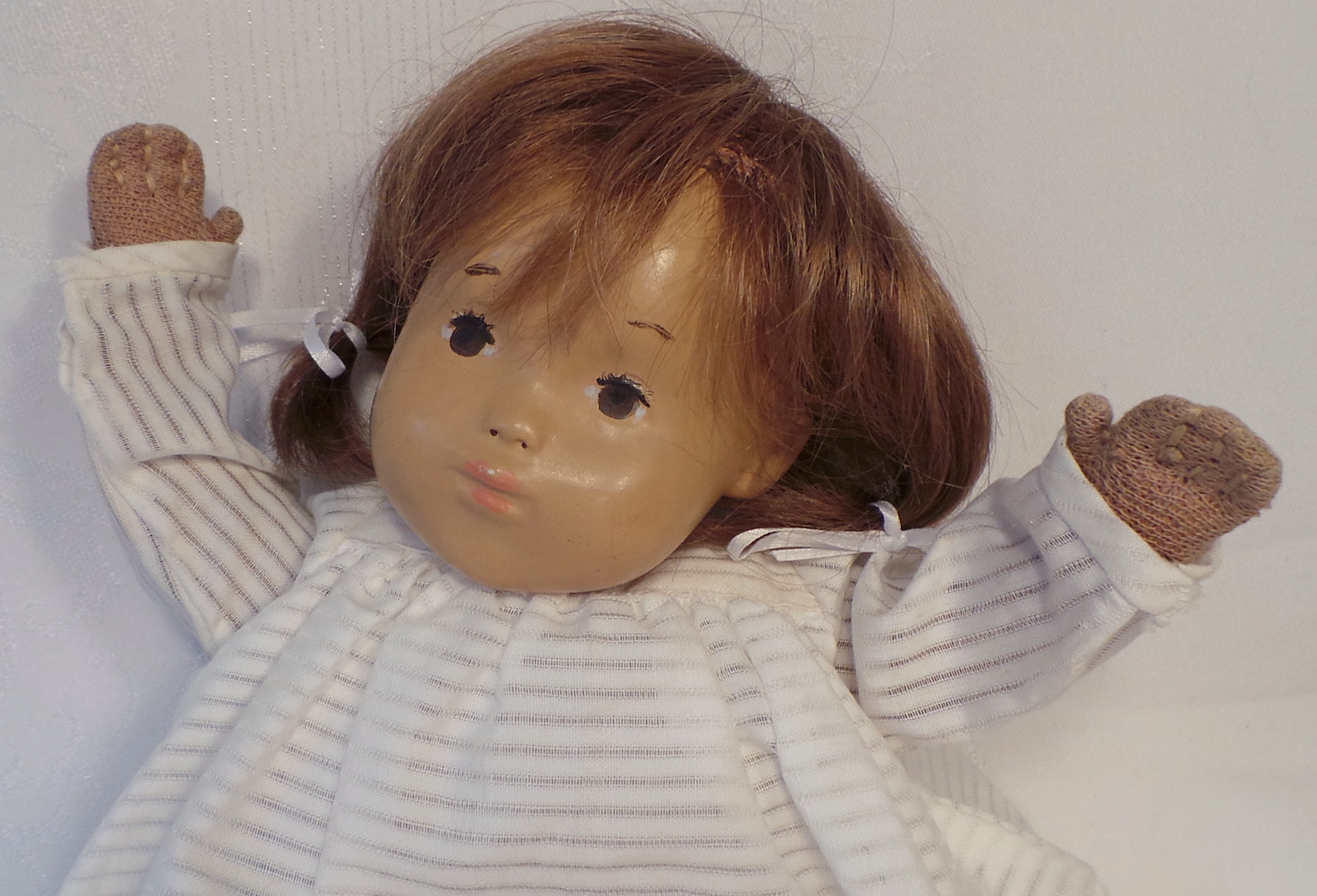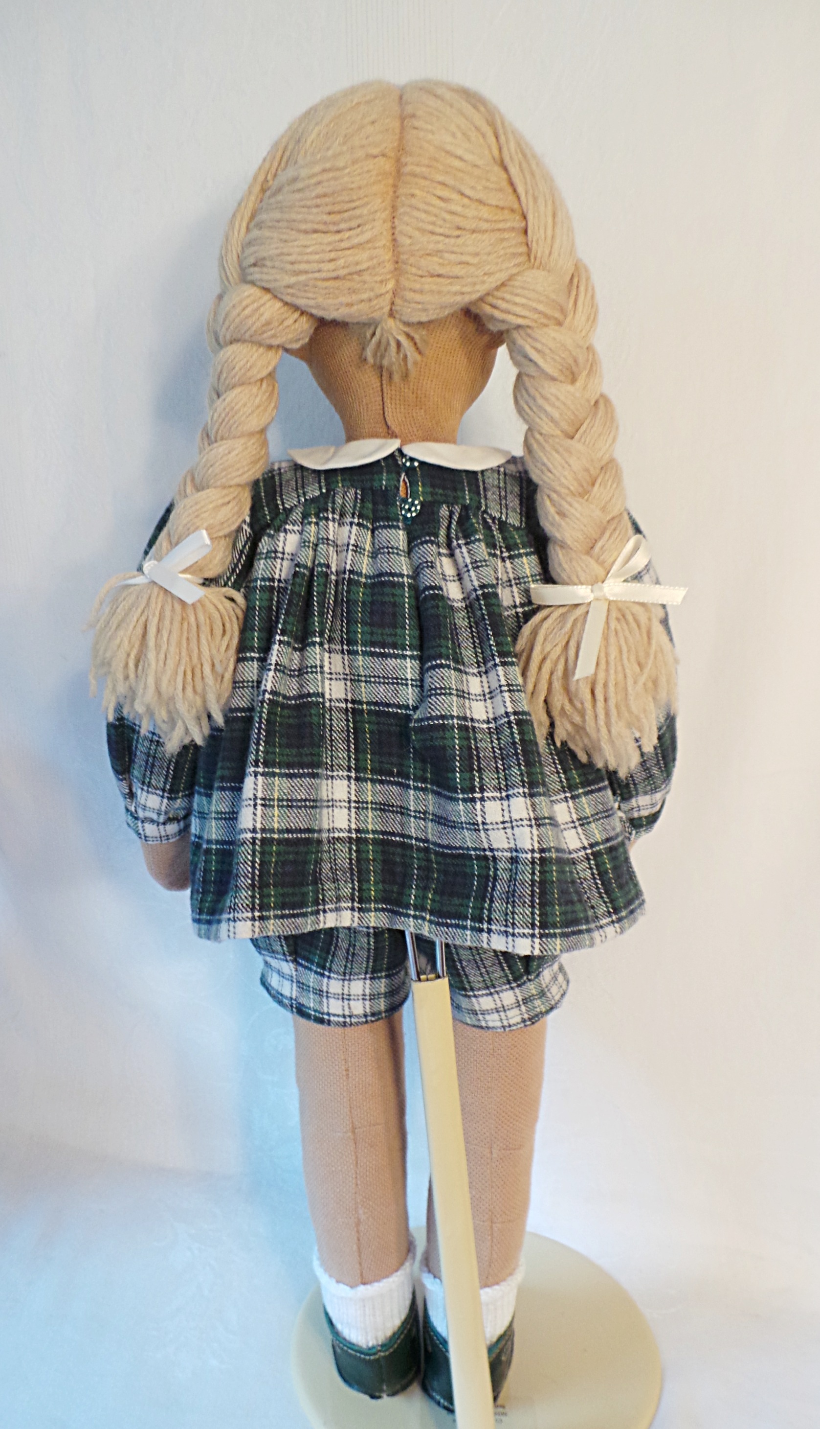 Abby loves to hold me and she reads stories to me all the time. Mummy reads to me too. She read to me that Abby was probably made from a kit. This means Abby’s head, wig, and face painting were done by Sasha, and the rest of Abby was made by a person using patterns and materials supplied in the kit. Don’t you think it is wonderful that Sasha looked for so manys ways to put her dolls into the arms of children?  Abby’s wool yarn wig and the cork shavings in her arms and legs helped to identify that she is from Sasha’s early years in dollmaking.