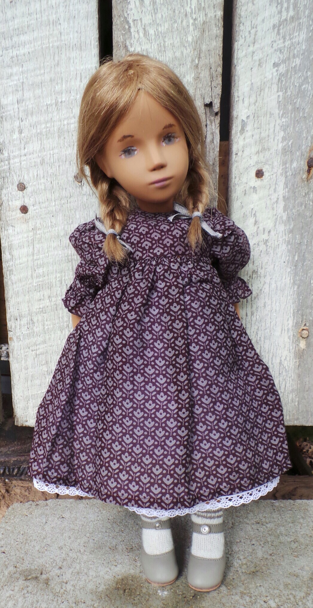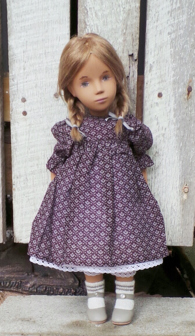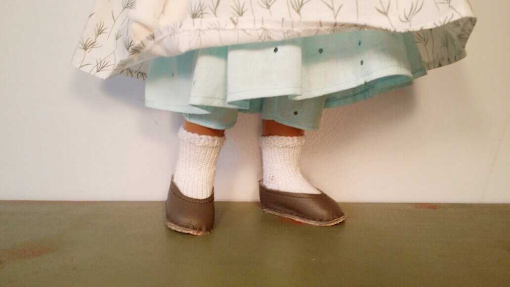 Gertie wearing her new dress. Her leather slip on shoes were made by Janet and were on another doll that my dear husband, upon a close inspection of the new repainted dolls, affectionally named “Smootch”. So, our sweet Smootch loaned her shoes to Gertie. πŸ™‚