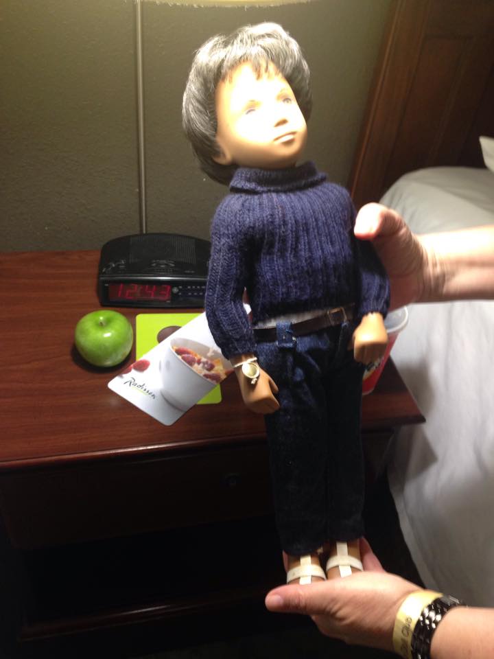 On Saturday, September 19th, I traveled to Cincinnati, Ohio to meet Laura Ward on our planned mini trip to attend the Triple Crown Doll Show scheduled to be held at the Radisson hotel and to begin at 10:00 am on Sunday, September 20th. We were so happy that Heidi Wheeler met us for dinner Saturday night and this photo was taken by Laura from the 18th floor of our hotel where the 360 Restaurant tops the hotel building. I am on the left and Heidi is on the right side of the photo. The bright outside light dimmed our faces a bit. 🙂