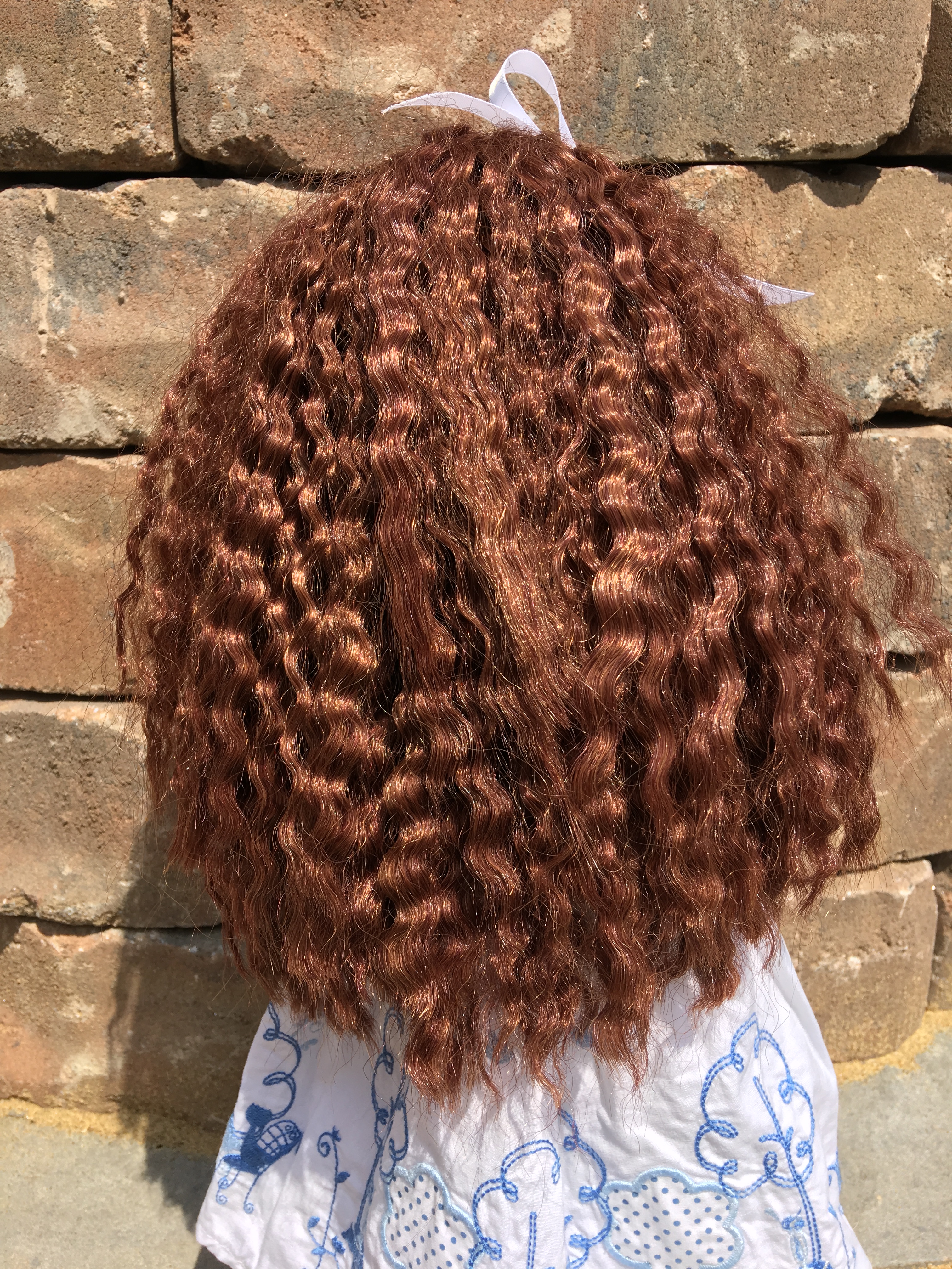 Zayna was rerooted and lightly repainted by the very talented Jackie Rydstrom. Her amazing eyes are a deep, smokey blue color and her amazing hair is very wavy, has red highlights, and is very soft. I am smitten with this unique girl. ❤️