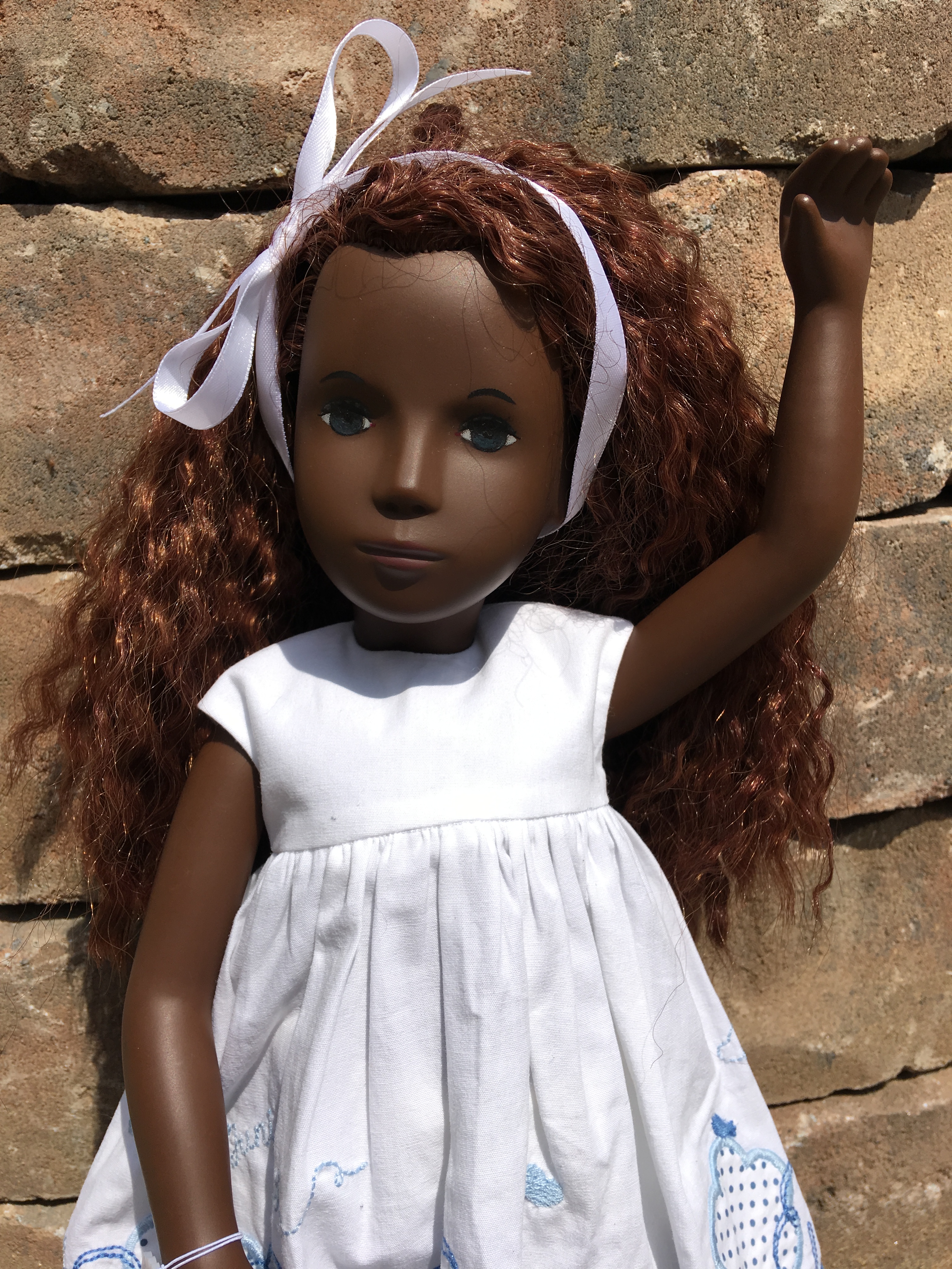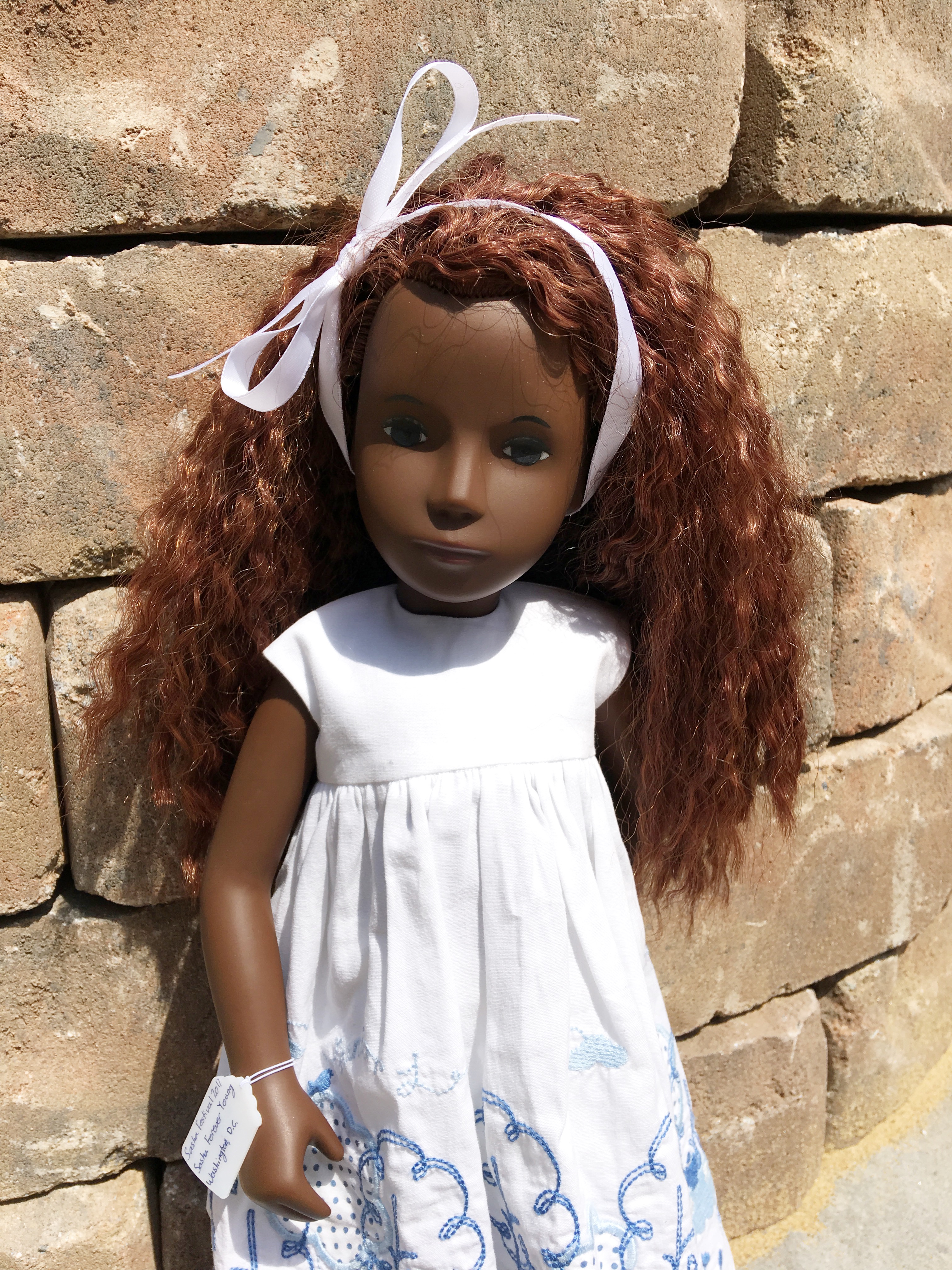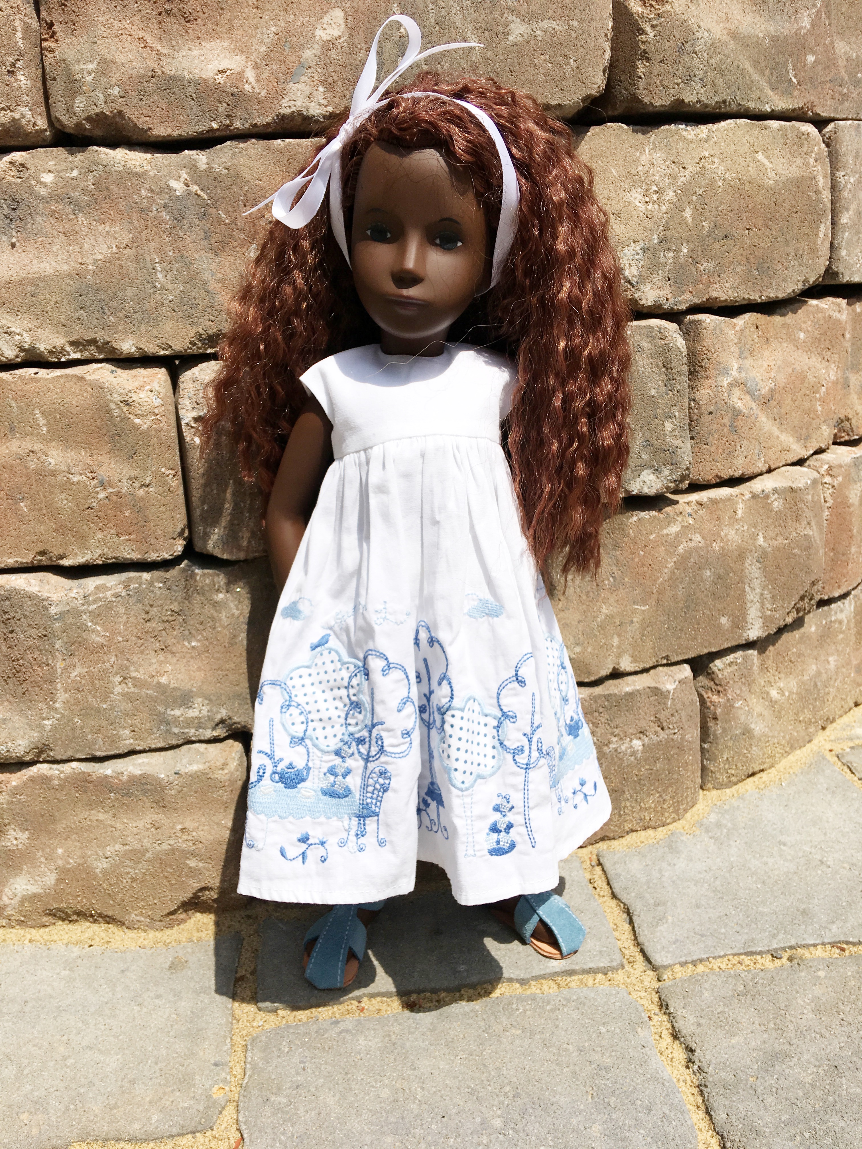 Some of you might have seen Zayna on Facebook because people were snapping her photos at the Festival.  I have dressed her in a lovely long white dress with blue embroidery and it was made by Petrana.  Zayna wears blue suede sandals made by Jean Jensen.