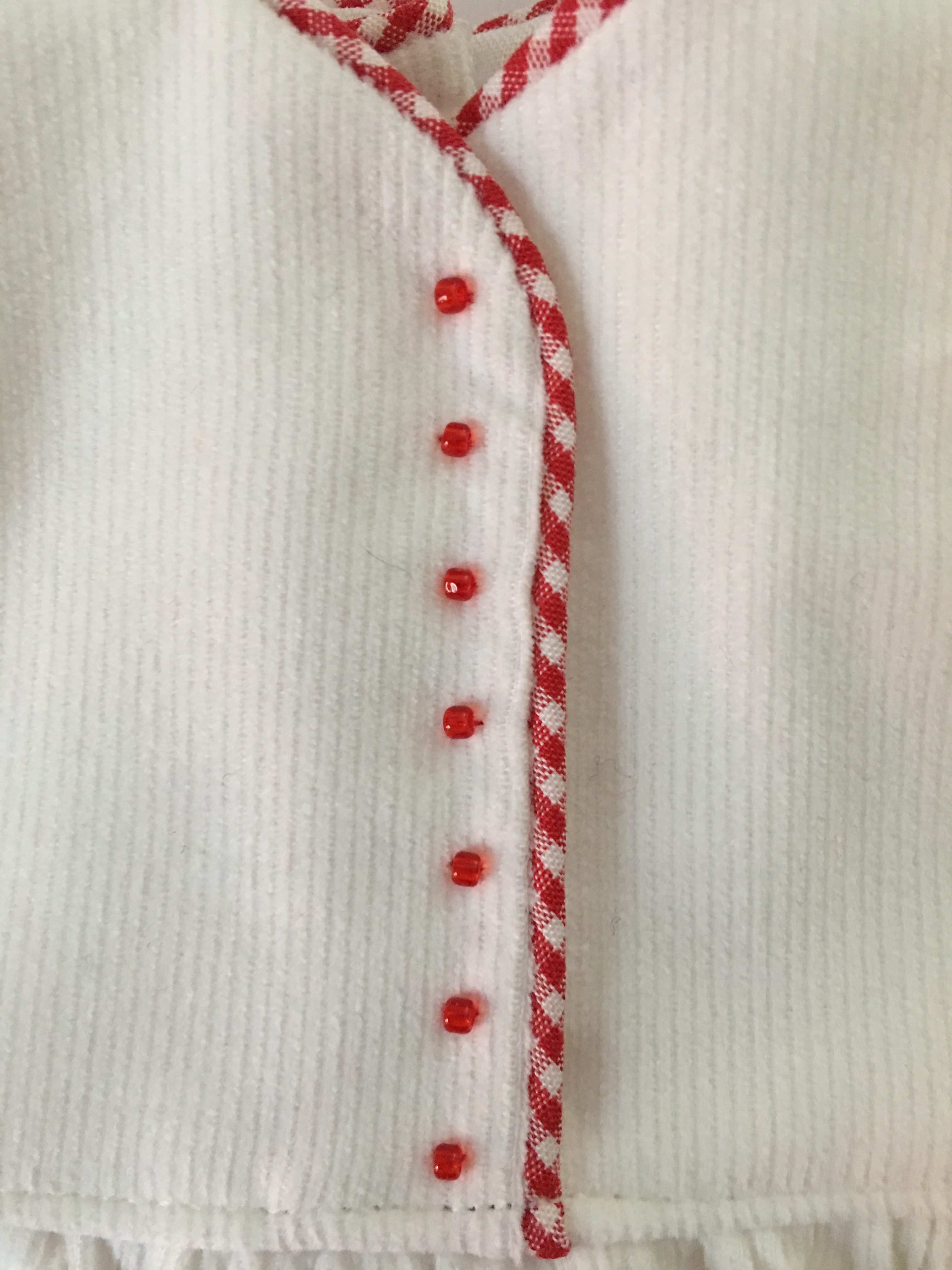 A very fine corduroy material, a gingham trim and the tiniest of buttons. ❤️