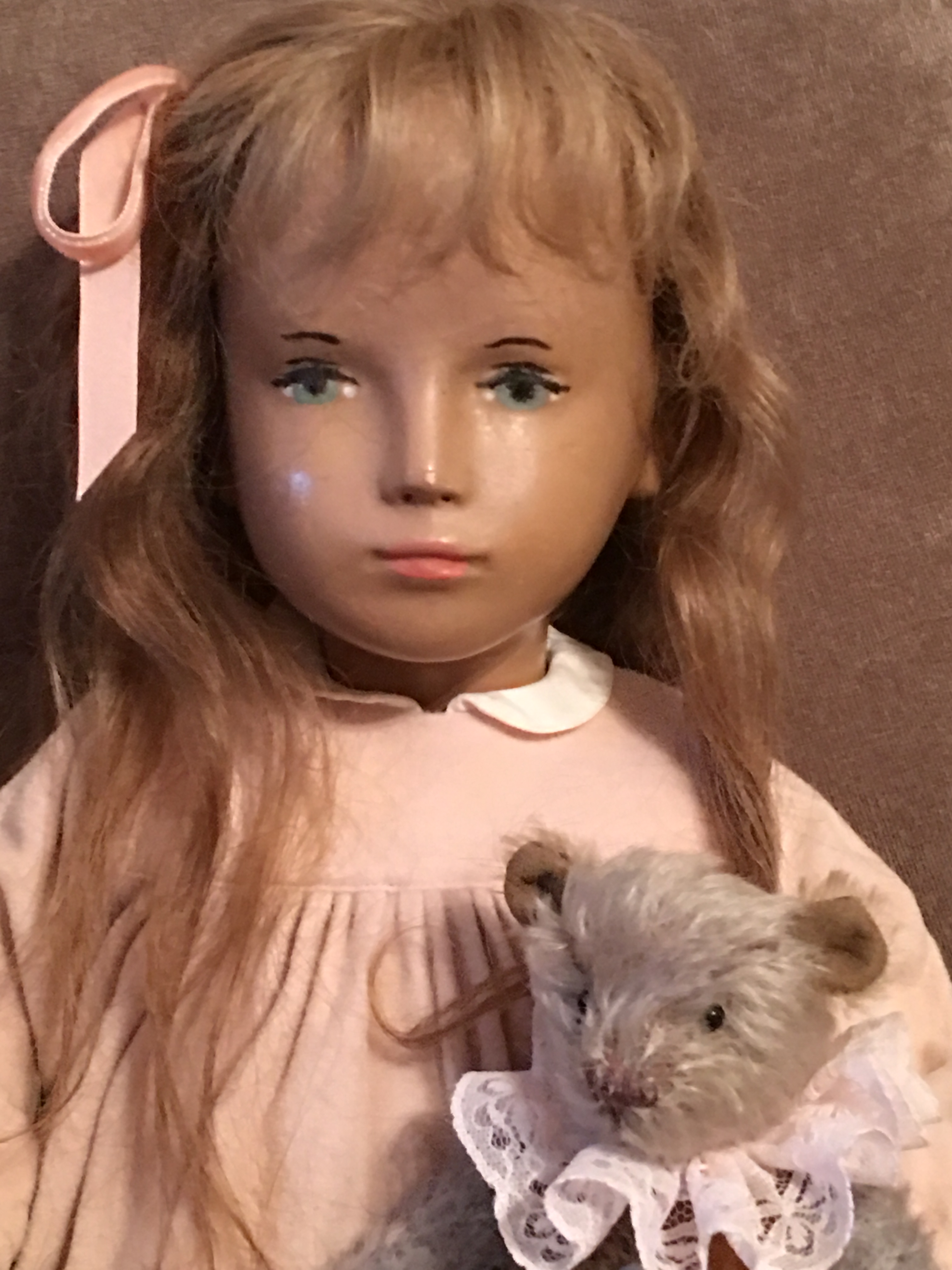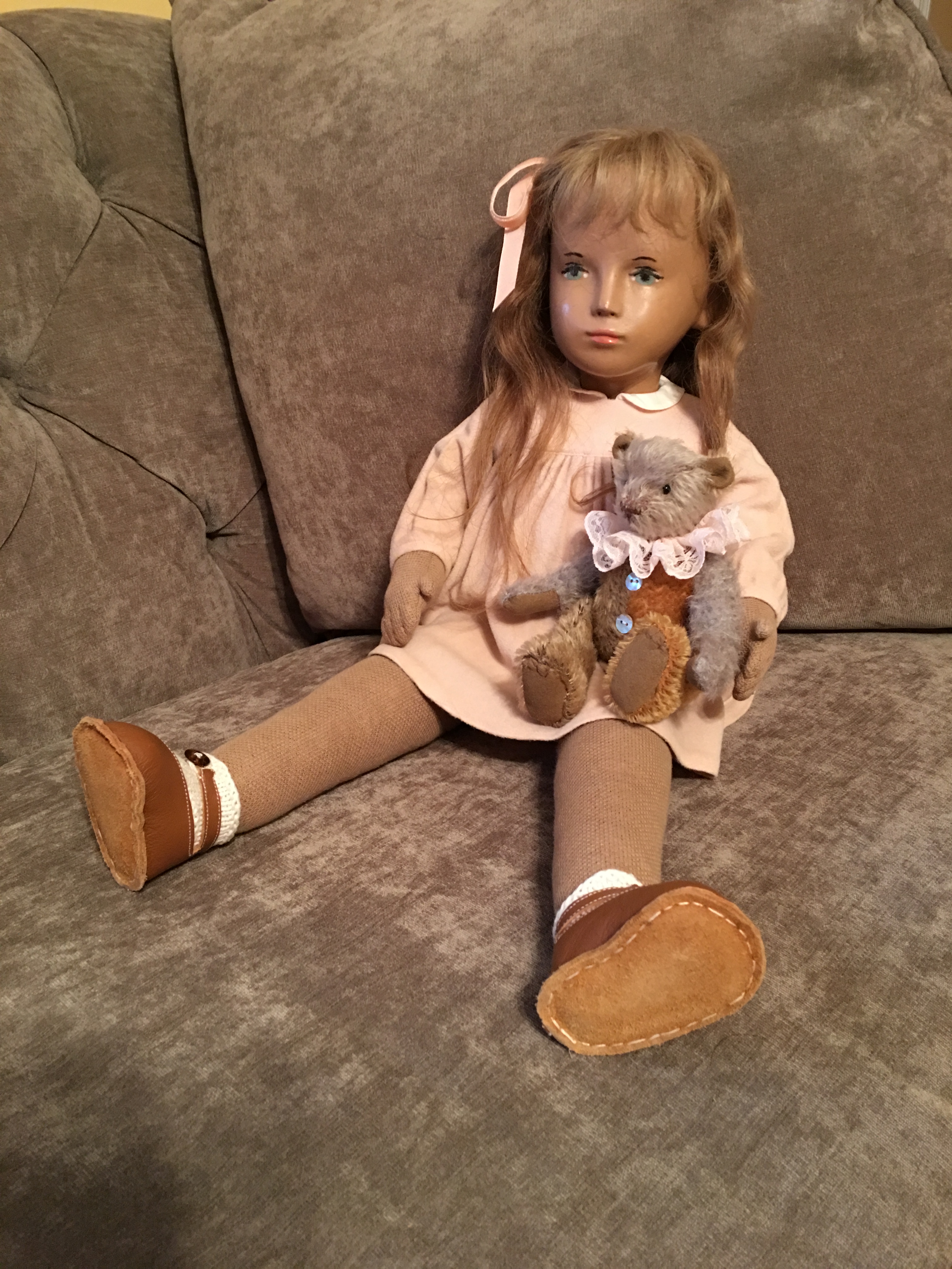 Audra came wearing her tagged studio dress and having her original socks and undergarments too.  The lovely seller gave her a pair of shoes that were a tad big for her so I borrowed this lovely leather pair from a sister and these were made by Brigitte.  Audra’s wonderful mohair harlequin bear was made by Janet. 😊