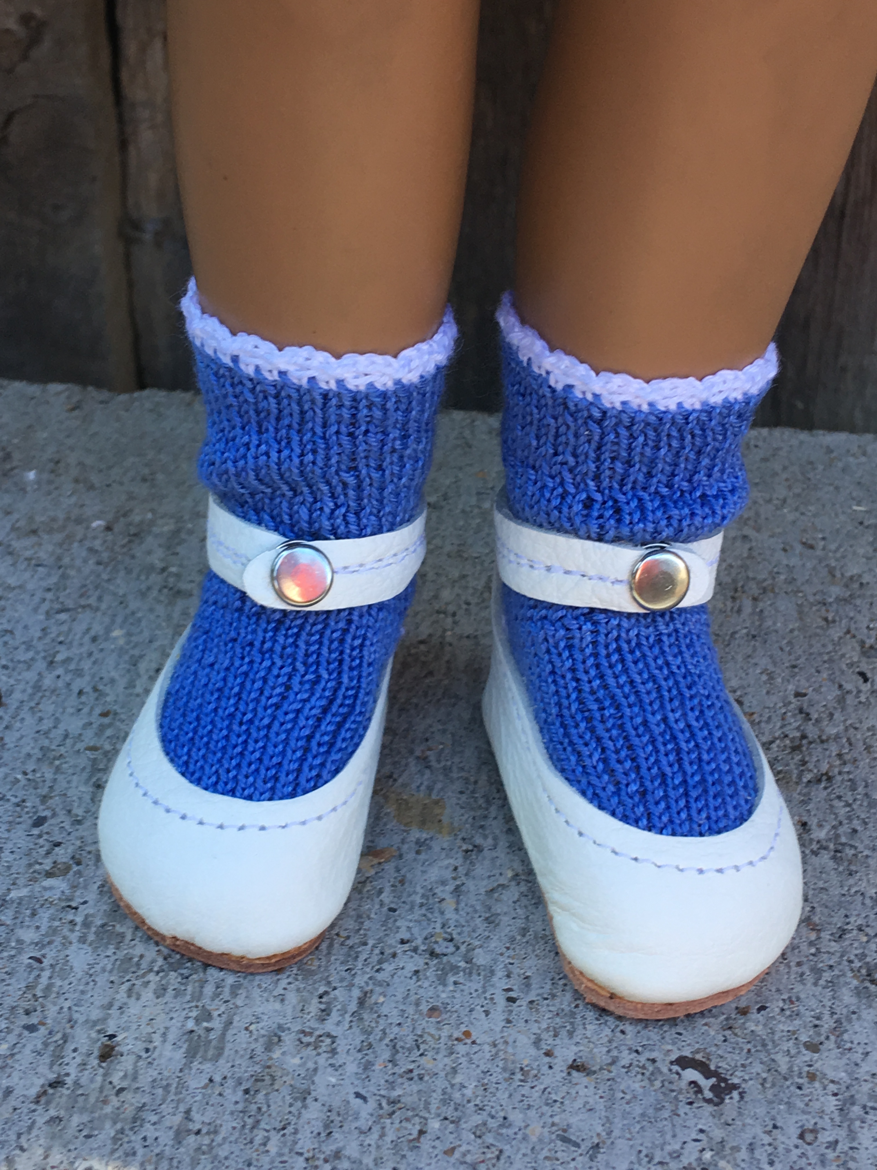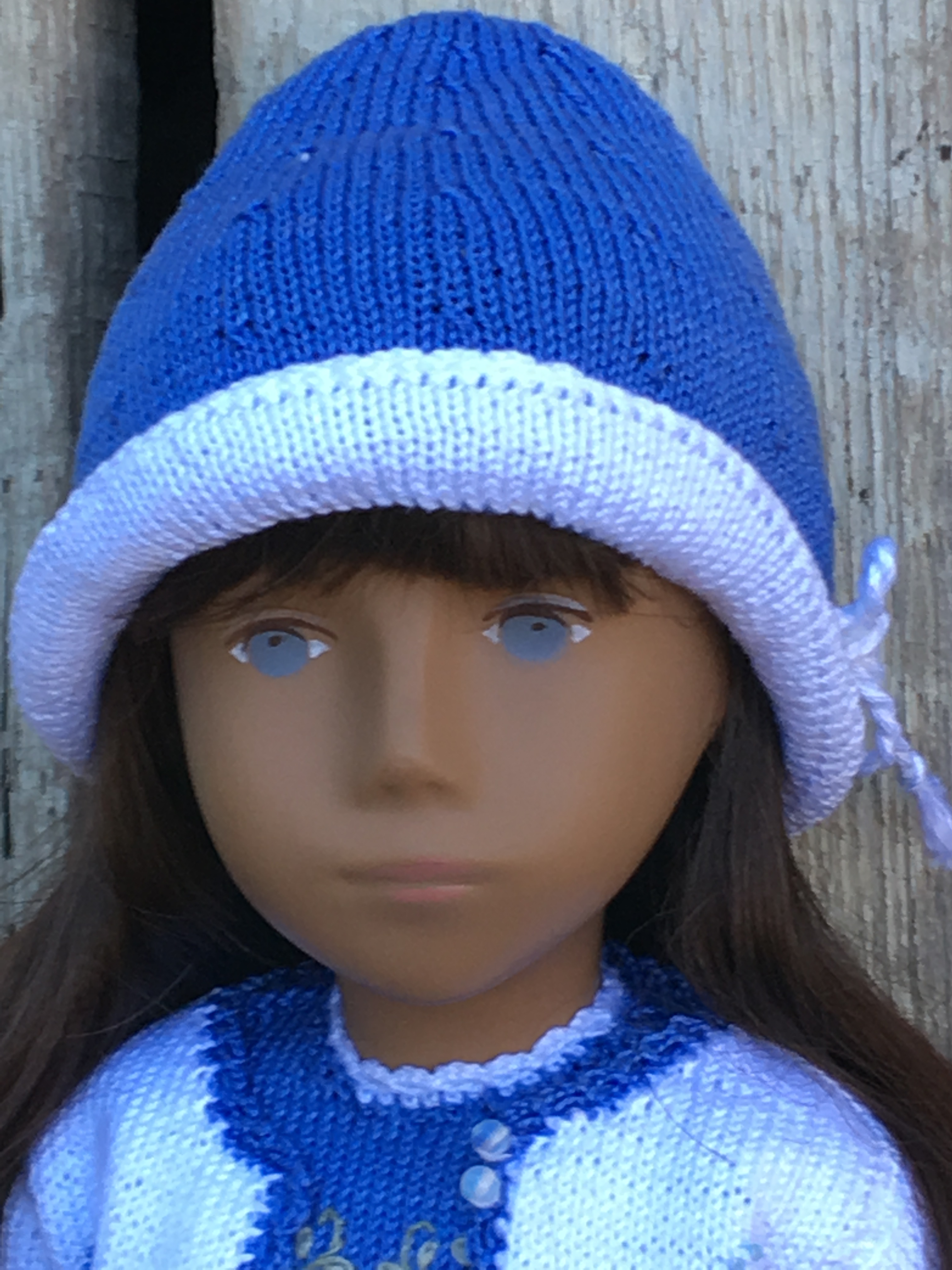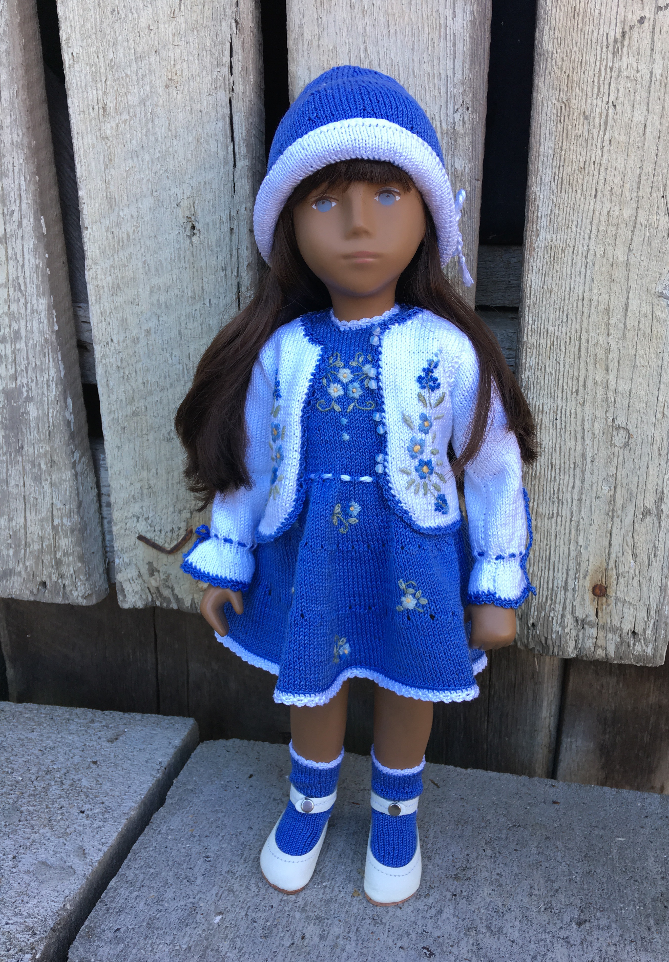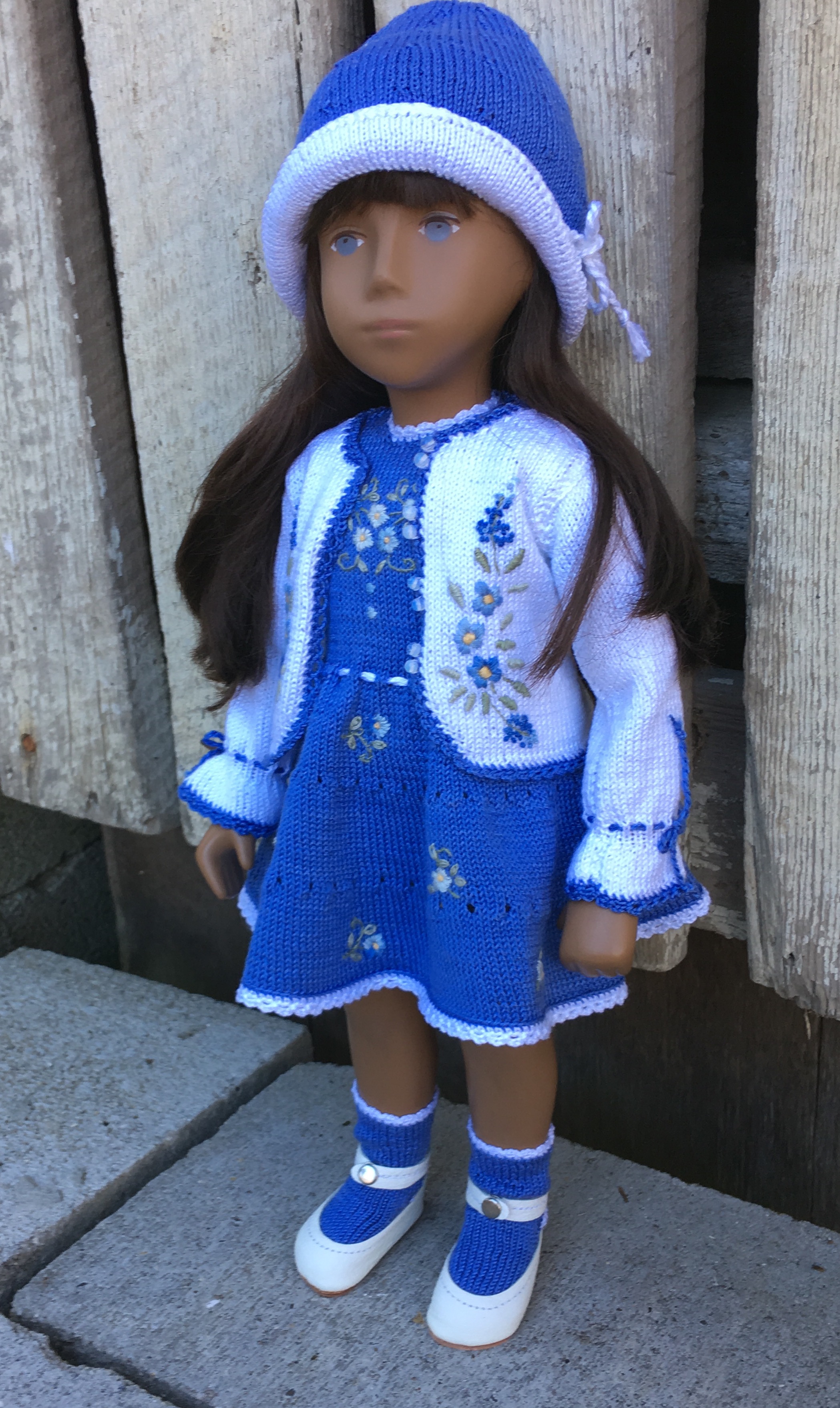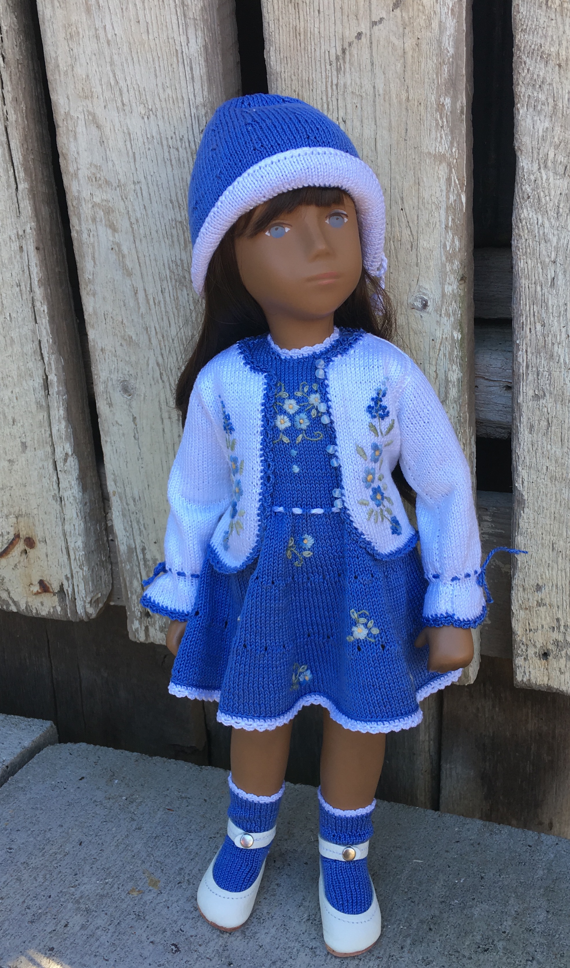 Her blue and white outfit consists of a dress, jacket, pants, hat and socks. I added a pair of later Gotz leather shoes.