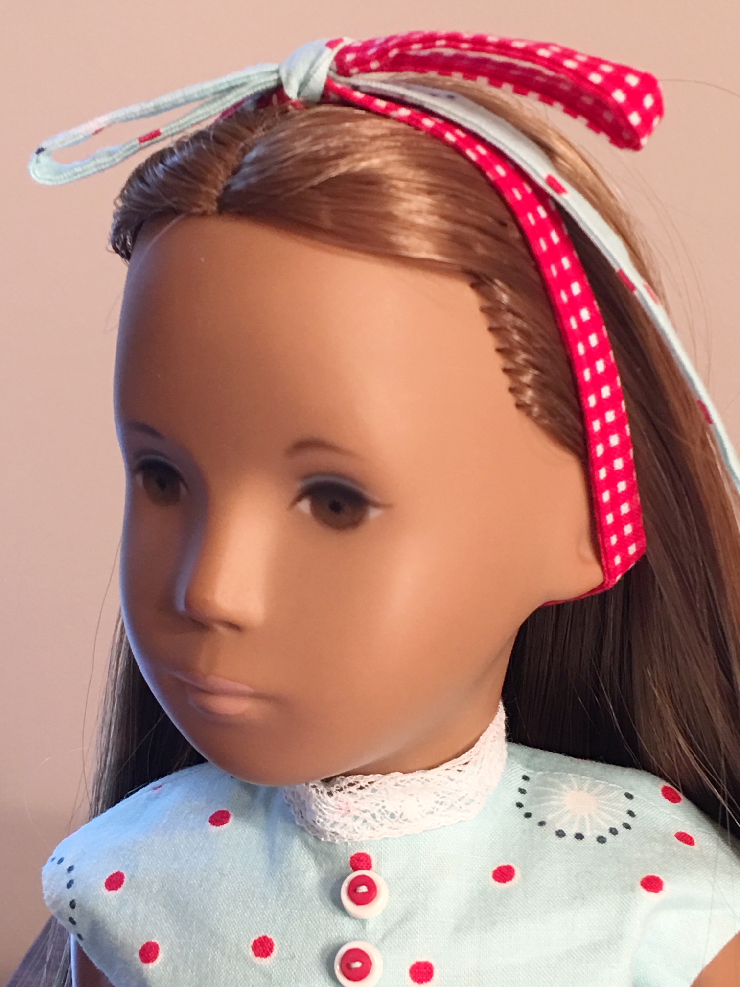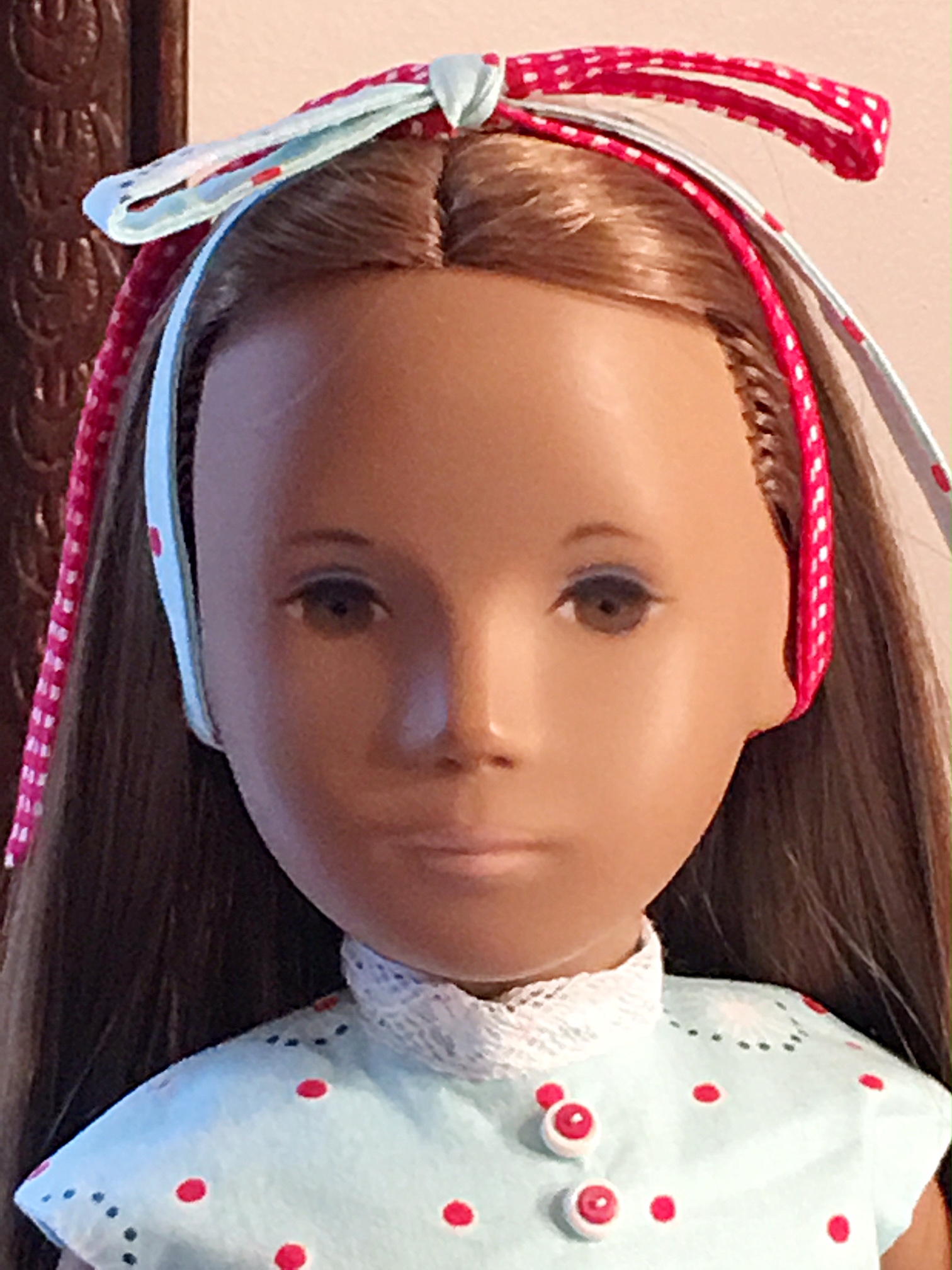 Lucy is wearing a fantastic outfit made by the talented seamstress Maureen Hallenbeck. I love this outfit from the top of her headband, to the bottom of her pant’s hem. A dainty lace trimmed collar and pants cuffs are a very feminine touch and aren’t the buttons just the best! ❤