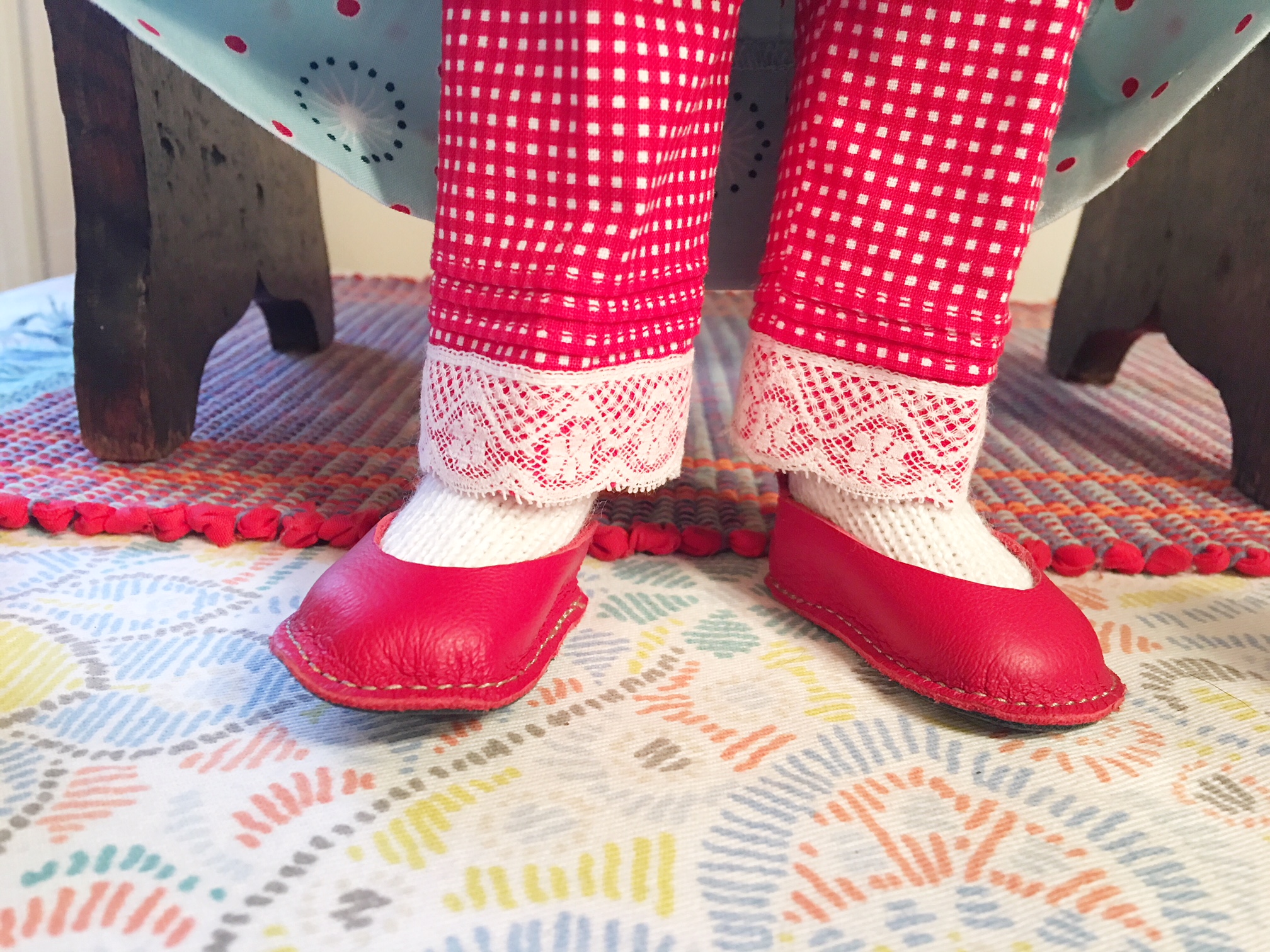 Beautiful pants with tuck pleating and lace trimming. Maureen’s attention to detail is much appreciated. ❤ Lucy’s red leather shoes and white socks are from Ruthdolls.  ❤