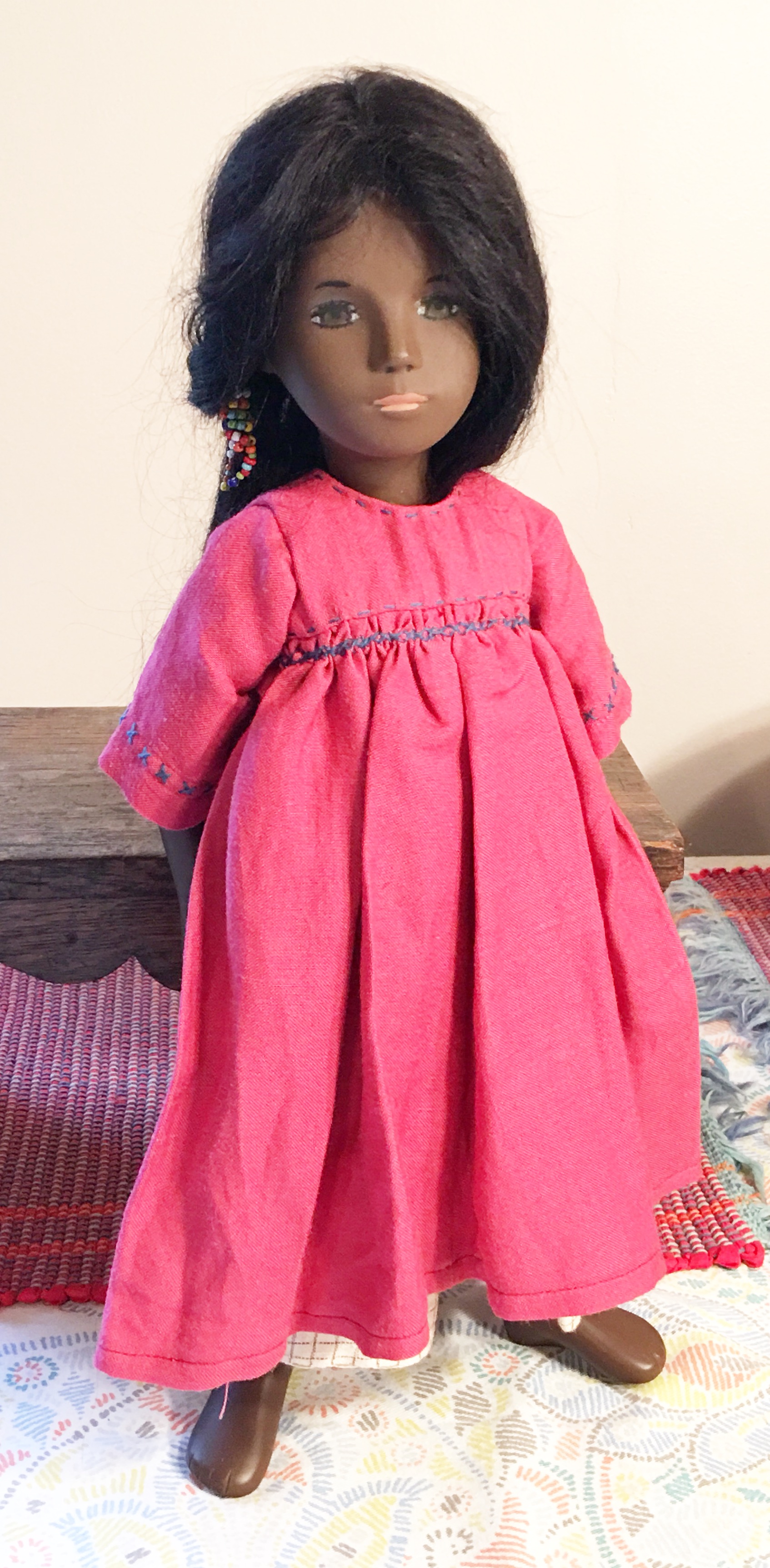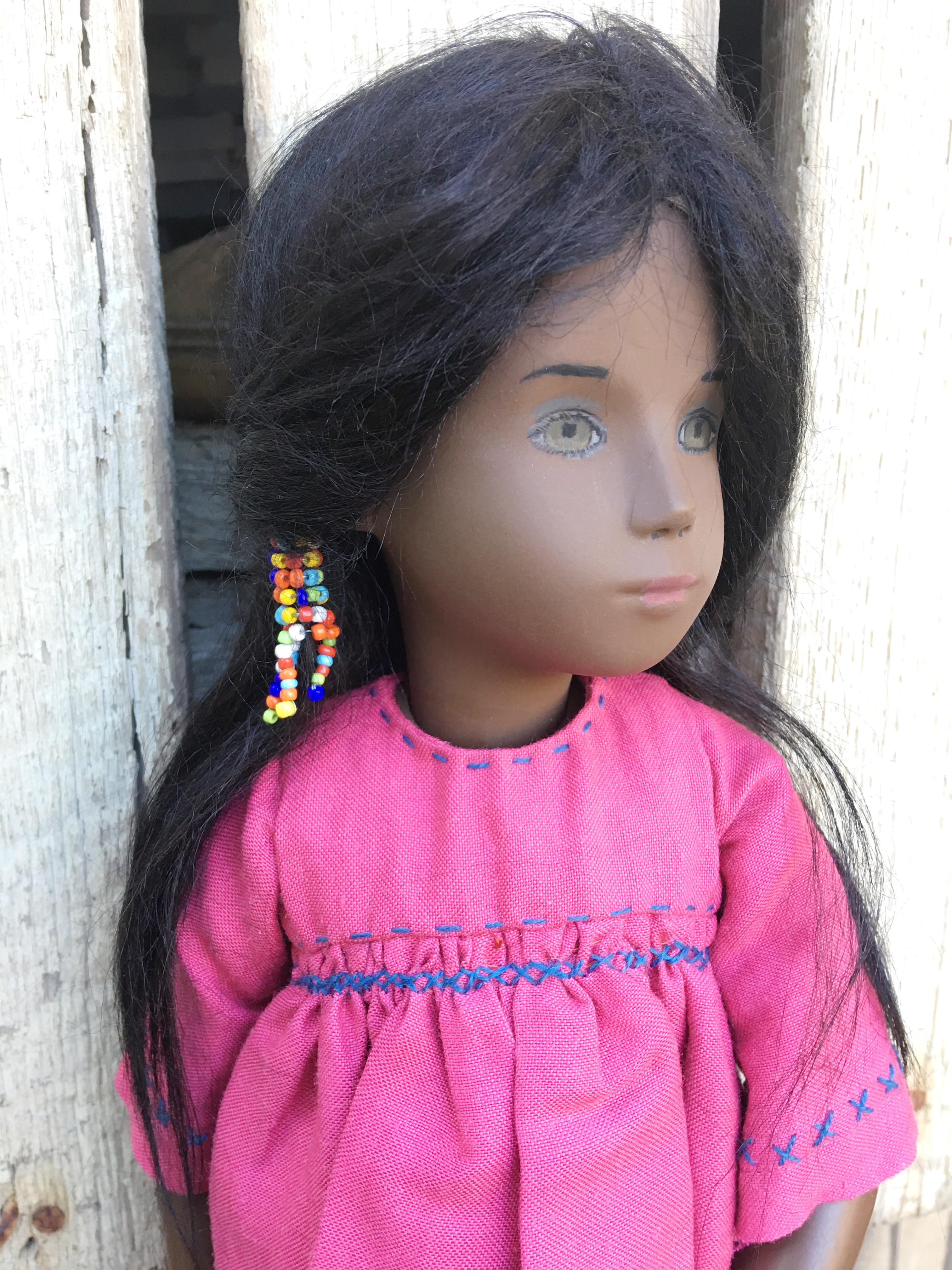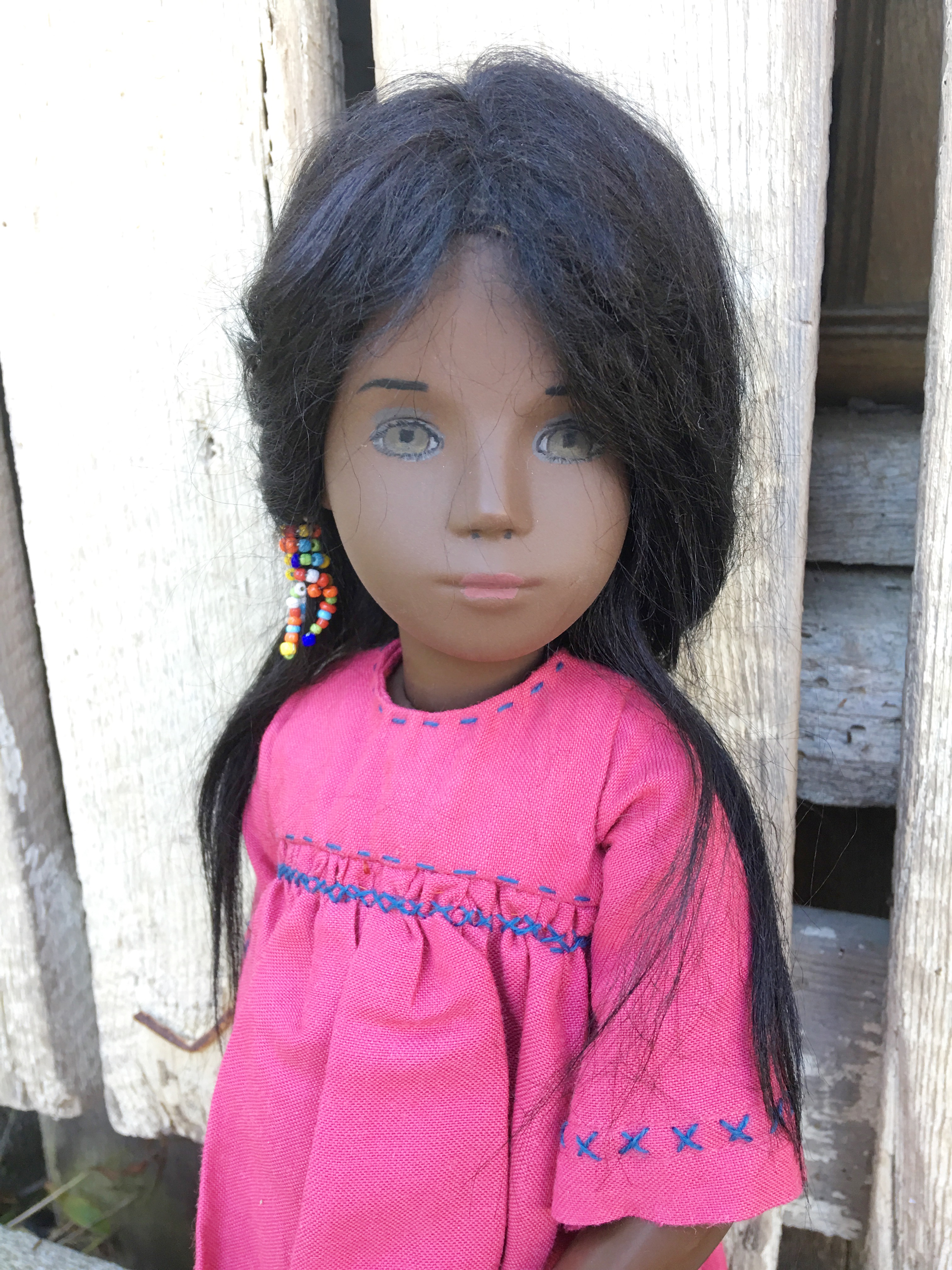 A couple of years ago when Janet Myhill-Dabbs let me know this beauty was up for adoption, I could not adopt this beautiful girl quickly enough.  When Janet visited last Fall, she offered to enhance her eye painting to be more in keeping with the original studio doll and less of the previous owner’s request. I was happy to see how her new eyes might look though I liked her eyes before and everything about her.  The first two outdoor photos were taken when she first arrived and are on the blog. 😊