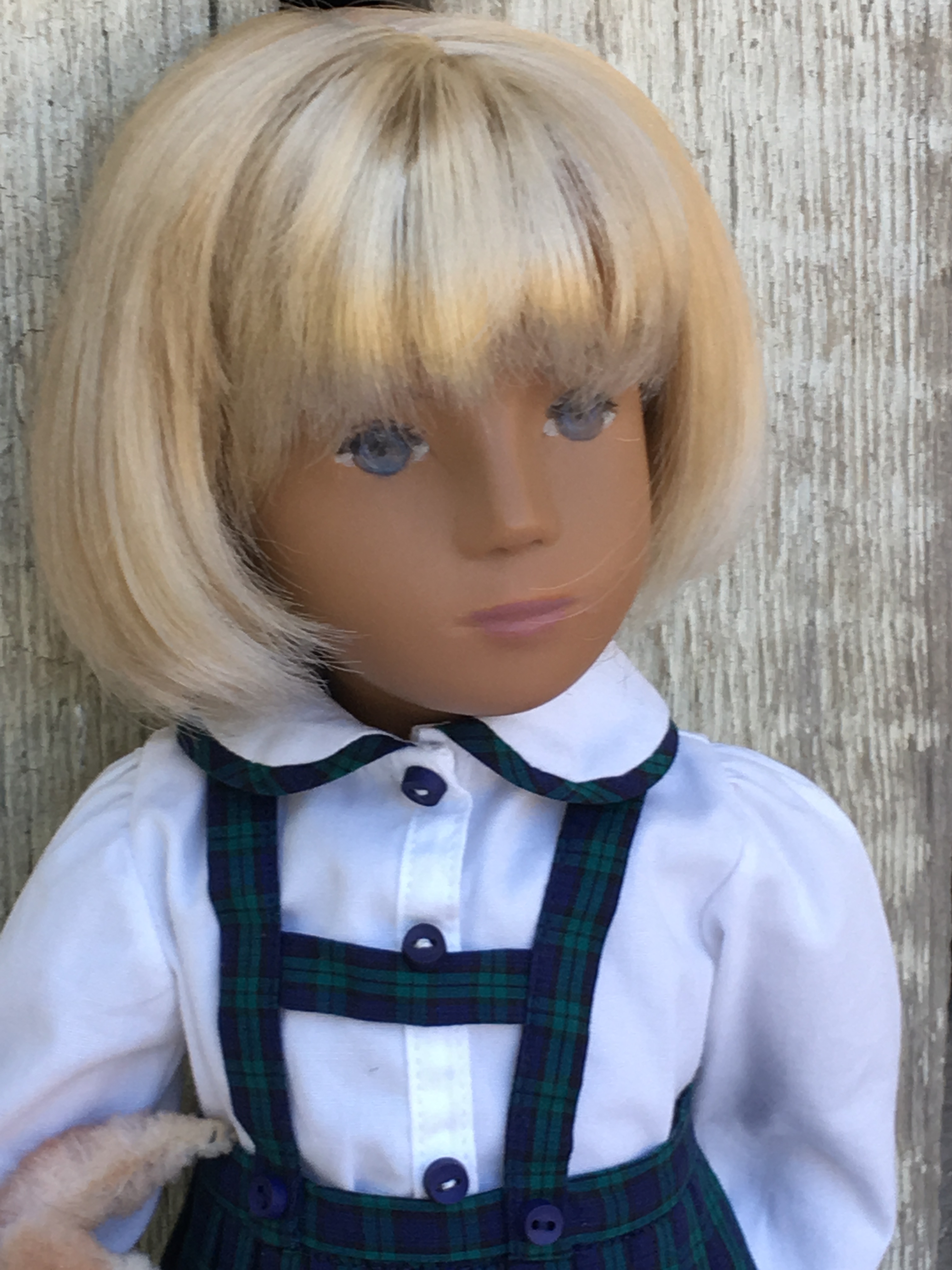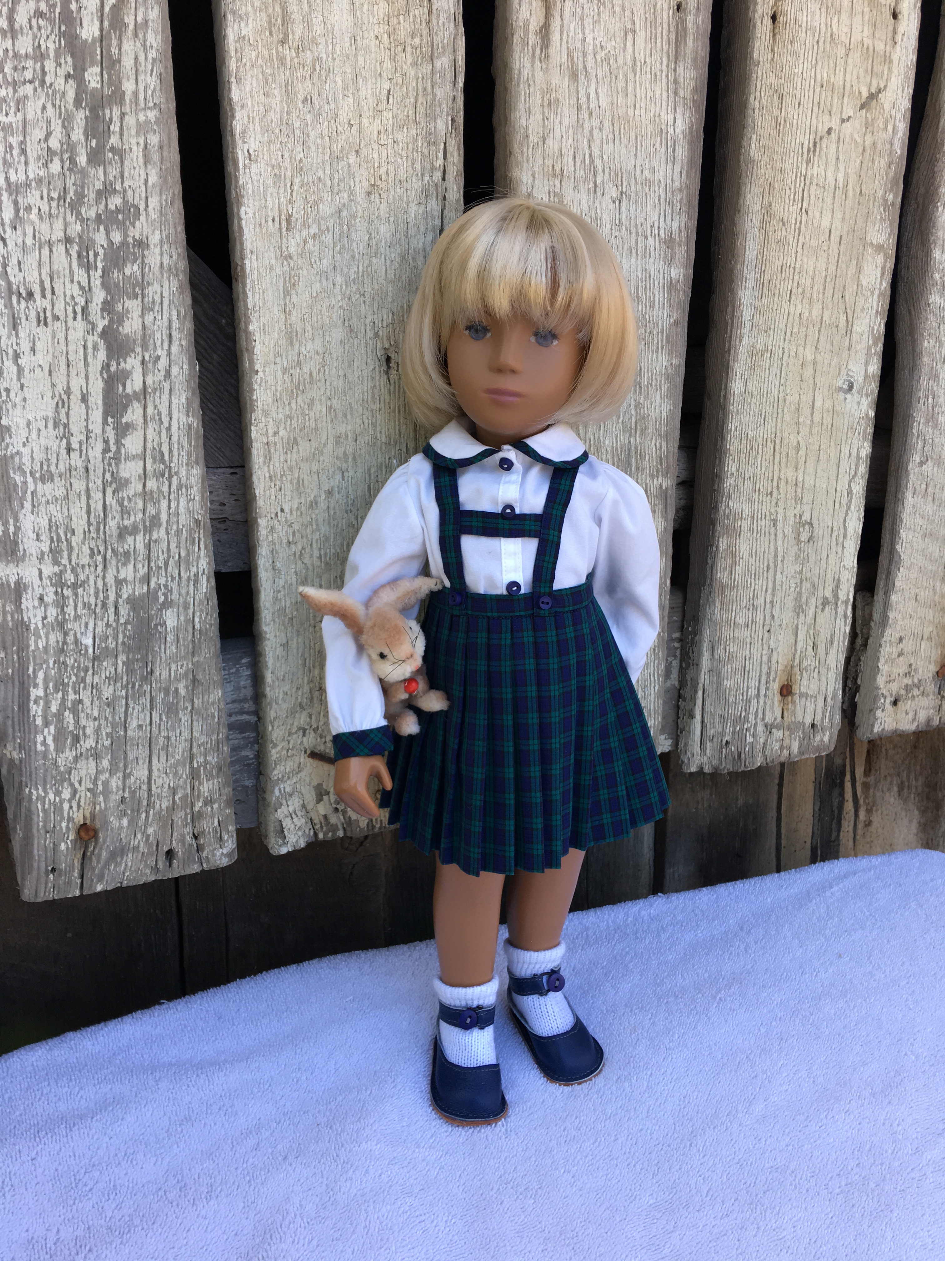 The newest family member in our Sasha Shangri-La family is the beautiful, repainted and bobbed hair girl named Robin. I adopted Robin from Shellyโ€™s site and contacted EC to confirm that this dear one previously belonged to her. And yes, she had been in her Sasha family and her name is Robin. ย Robin was beautifully repainted by Shelly. ย  She came in this lovely school girl outfit by Ruthsdolls and I added the navy leather JJ shoes. ย The bunny was waiting just for Robin and Robin was just in time for Easter. ๐Ÿ’