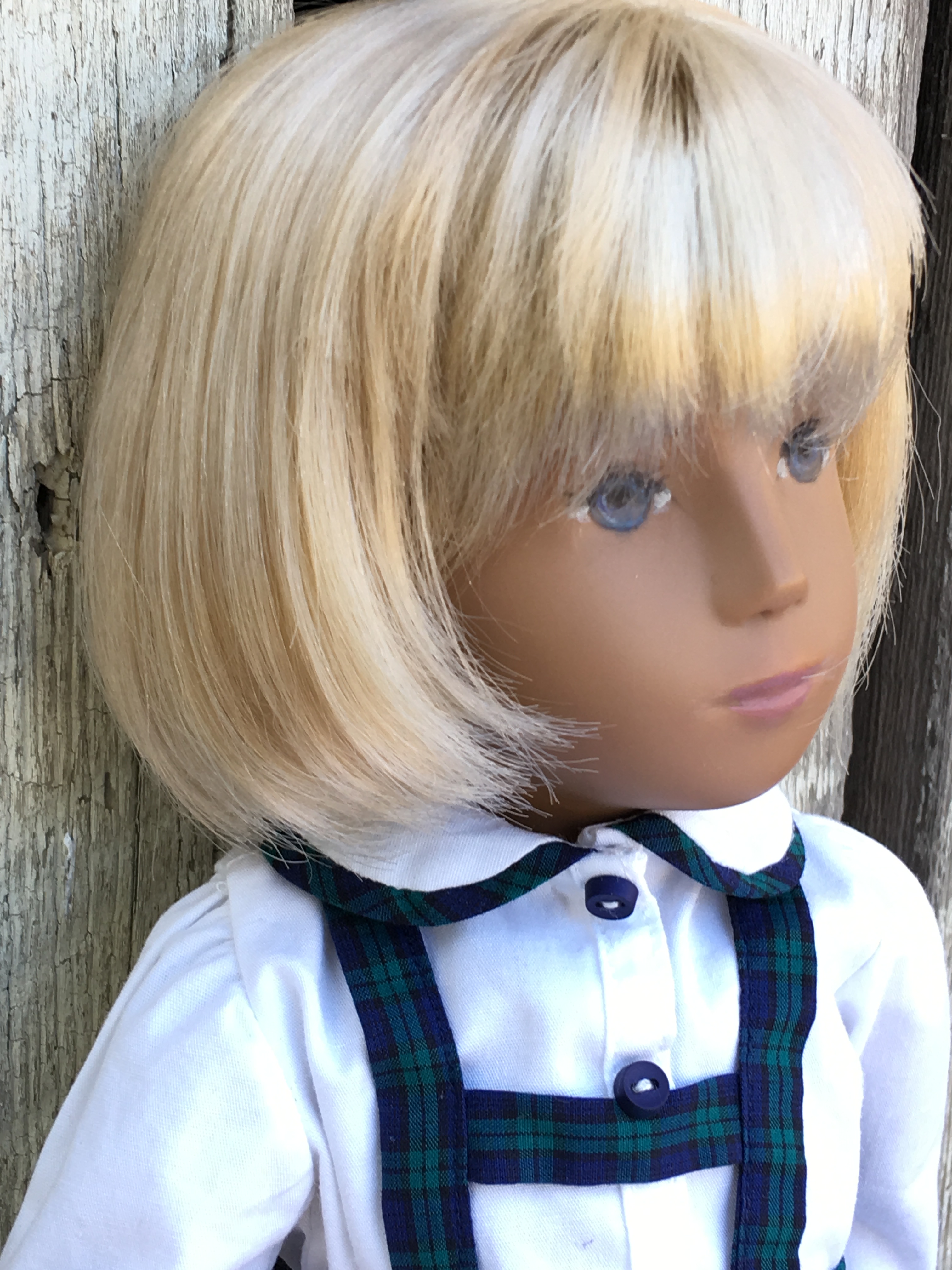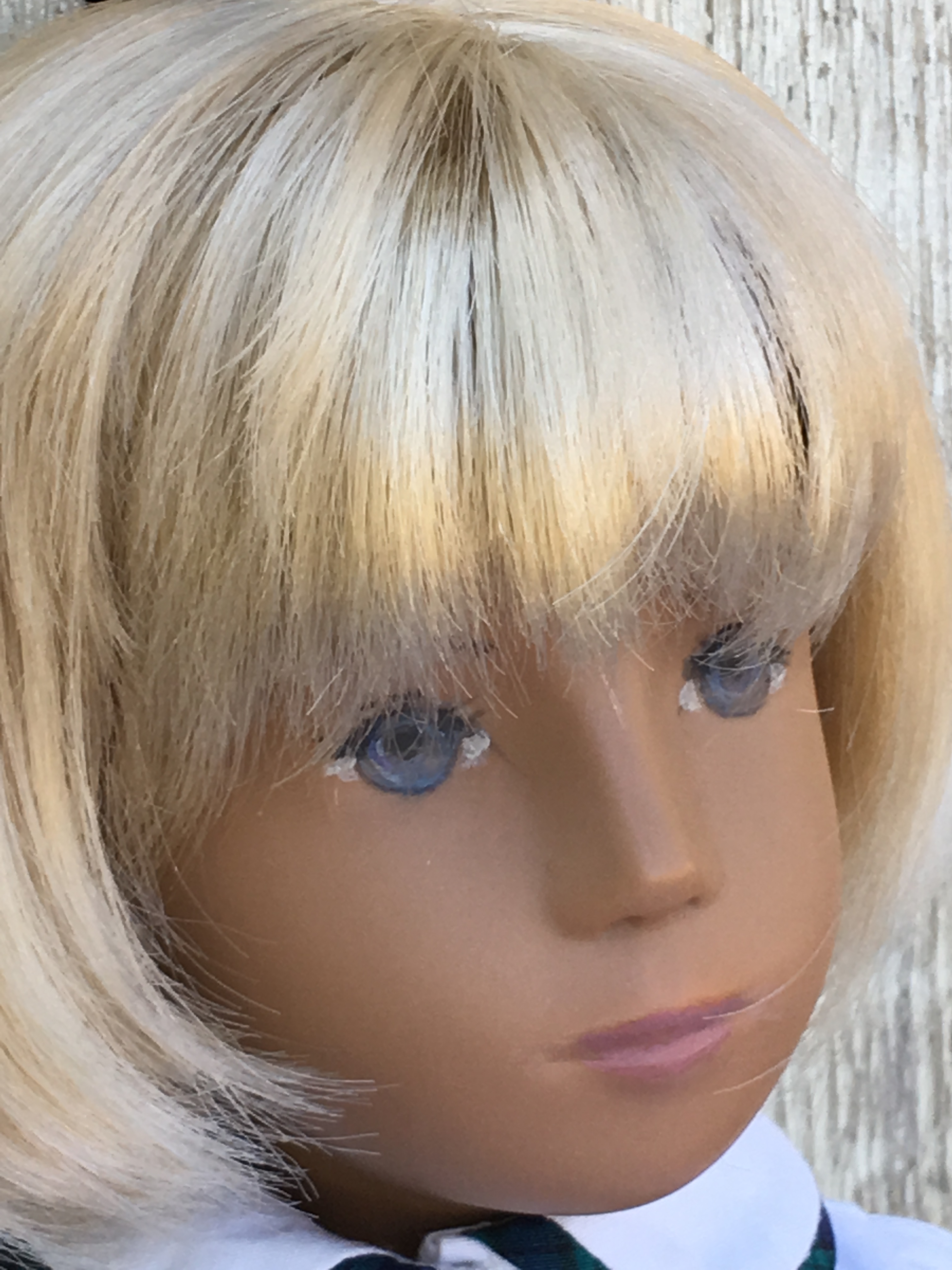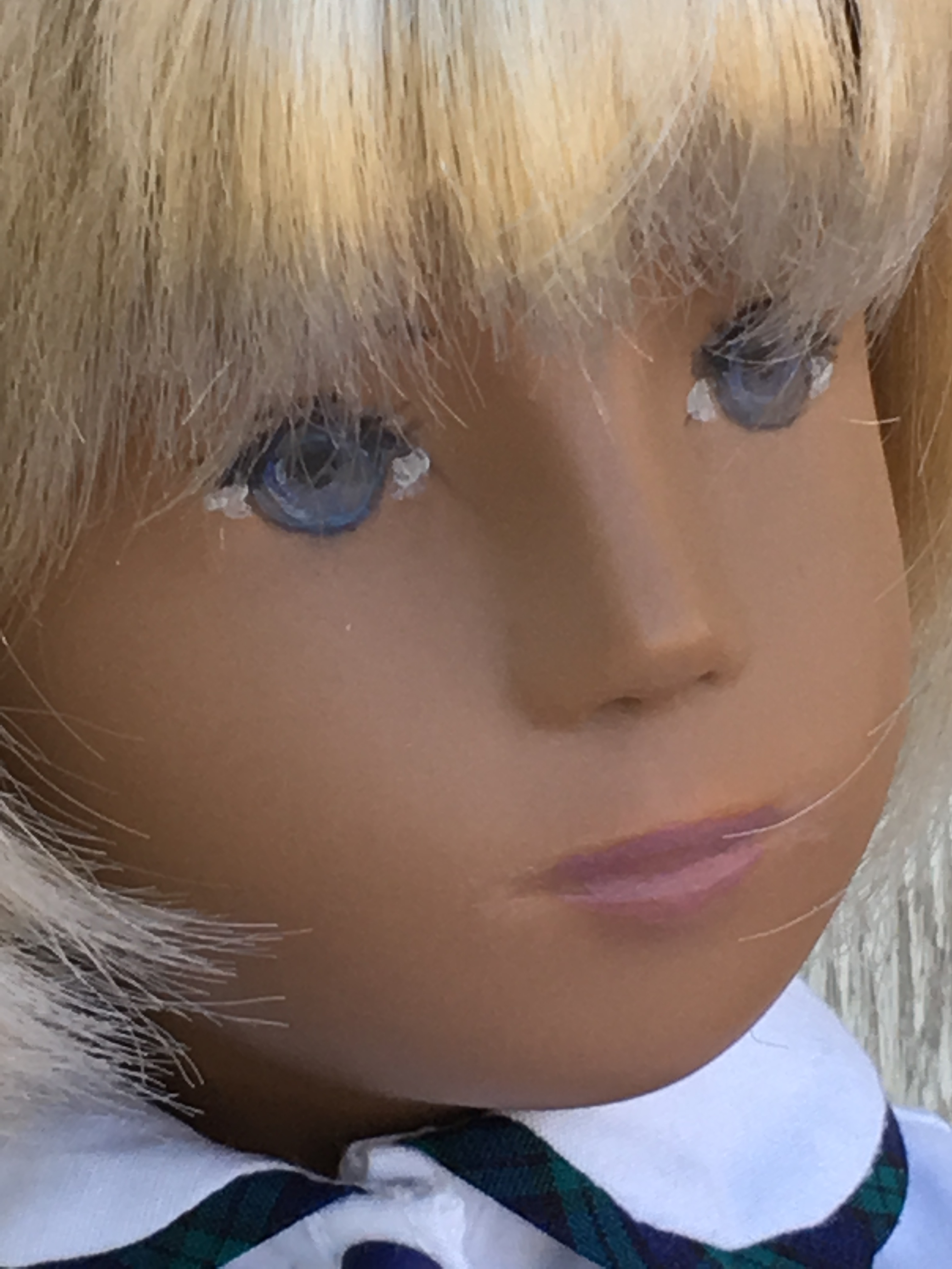 This pretty waif girl was an eBay find that had been rerooted in a lovely auburn color and given a bobbed cut. ย After arriving here, her eyes were beautifully repainted by Janet Myhill-Dabbs. ย Janet added her adorable freckles too. ๐Ÿ’
