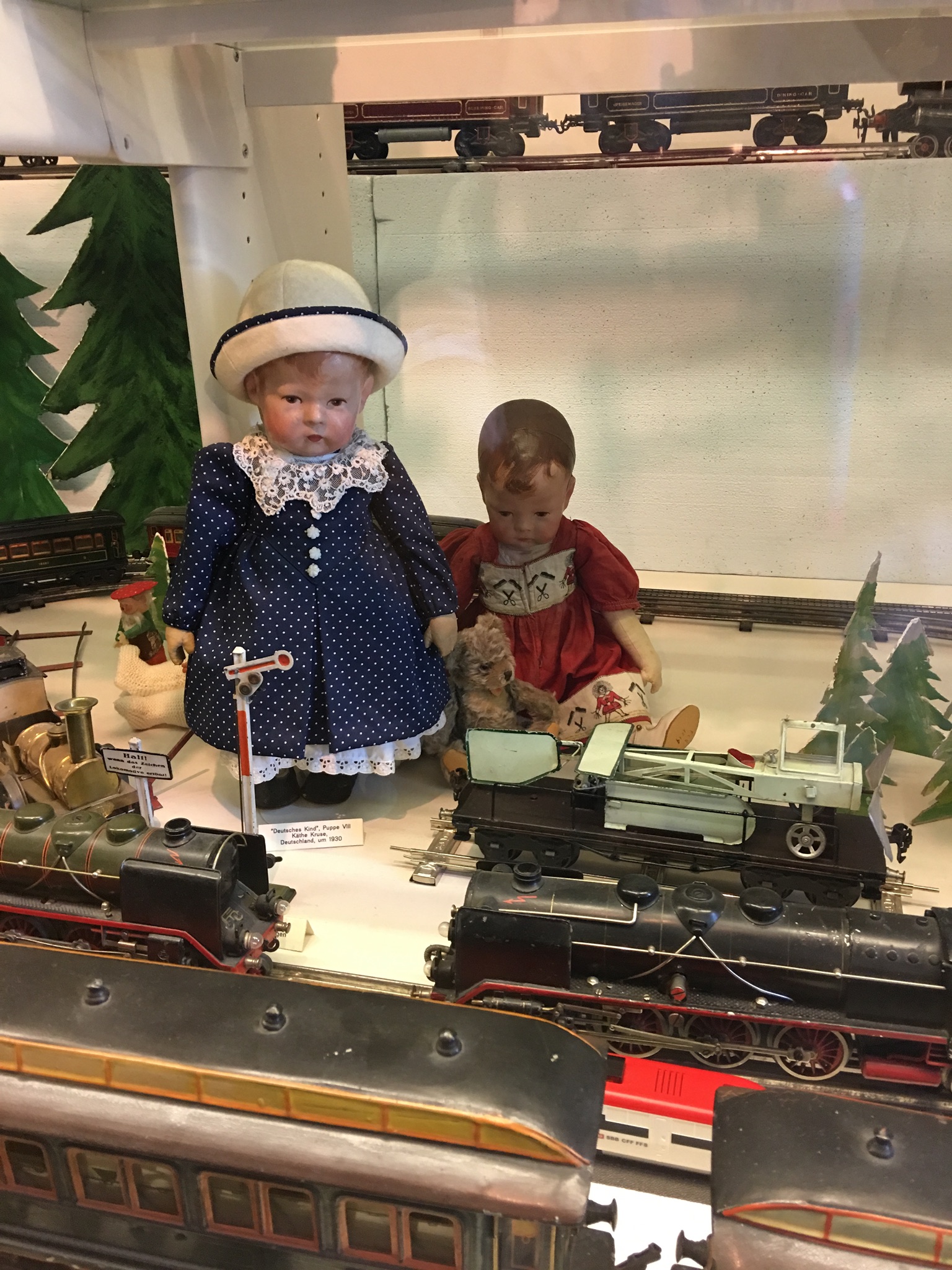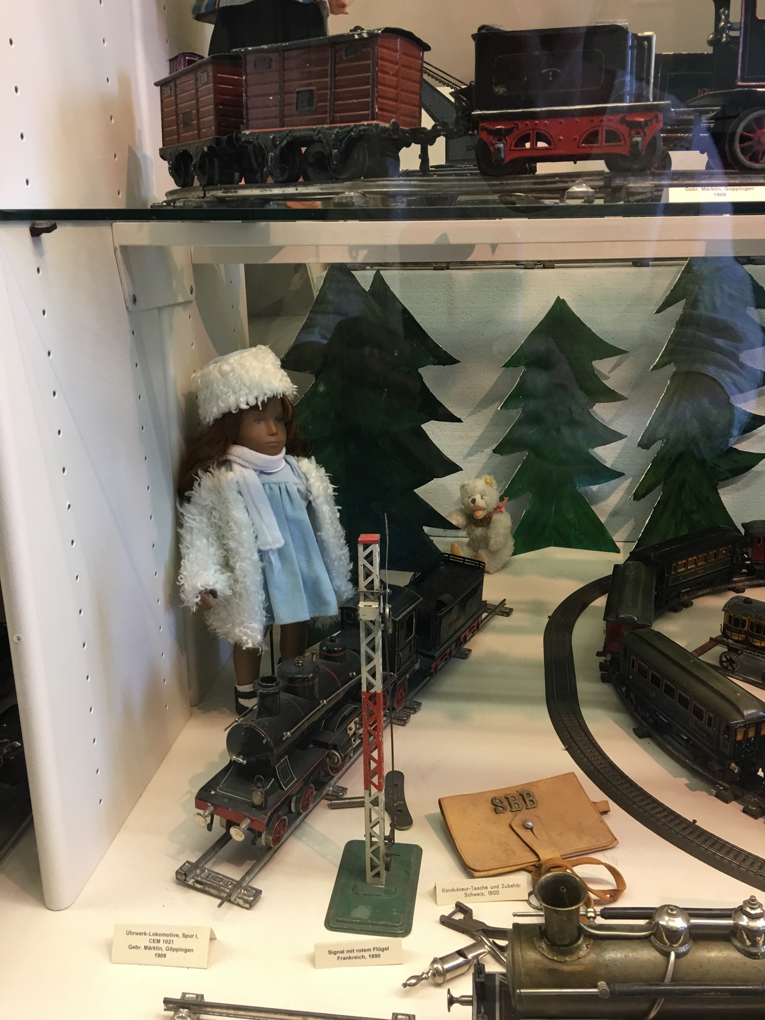 A lovely Sasha Doll tucked beside a most interesting train display.