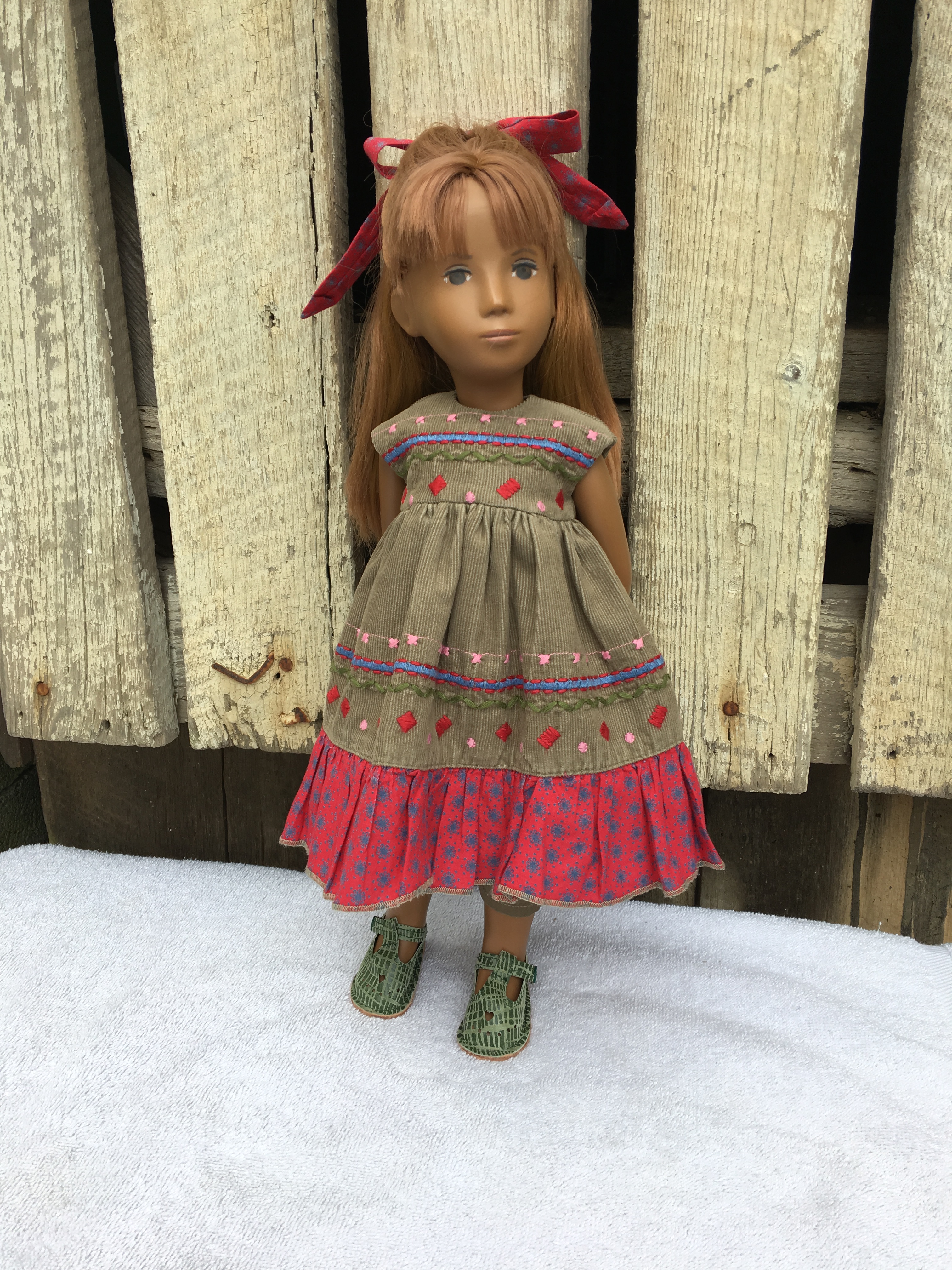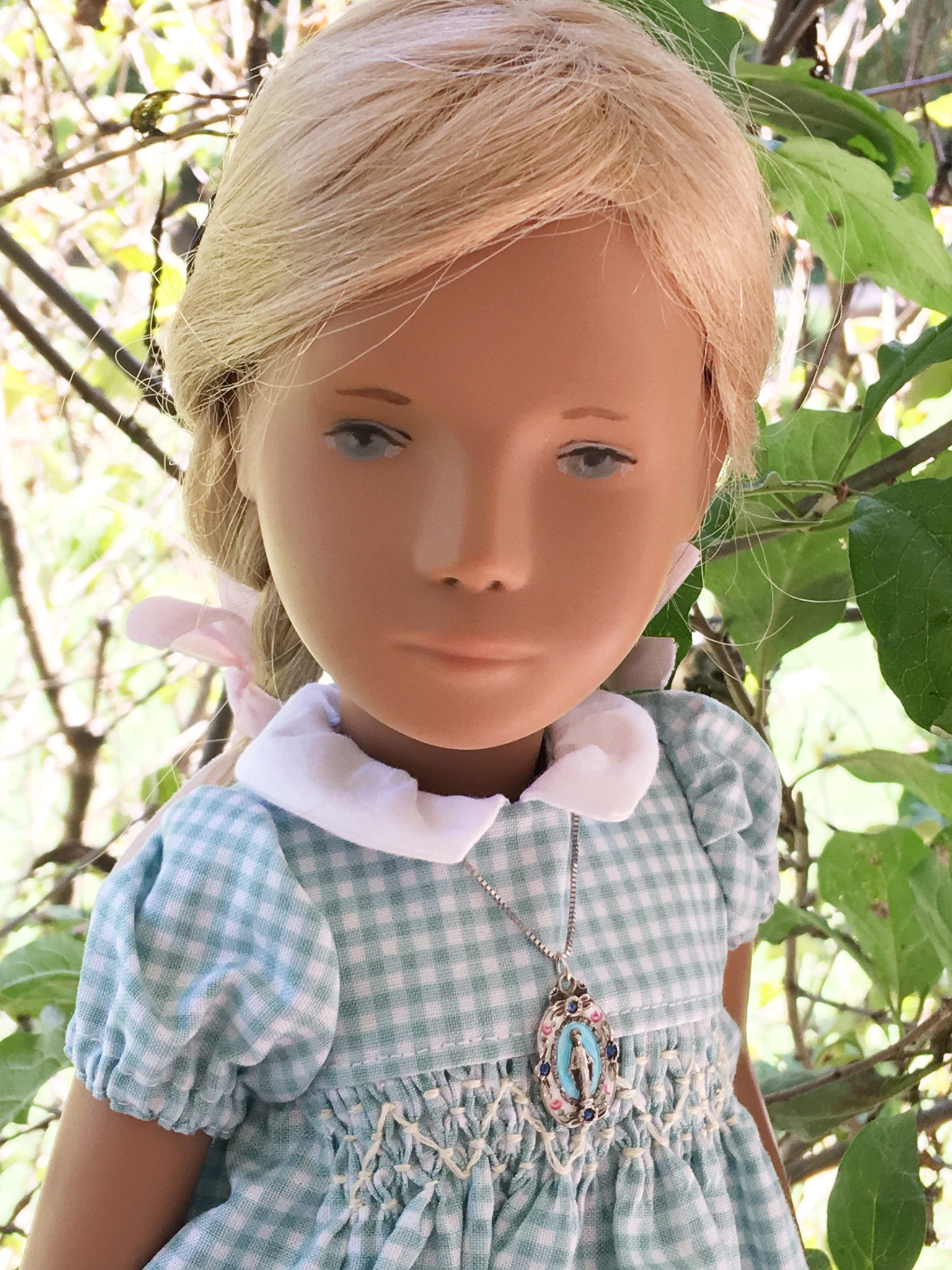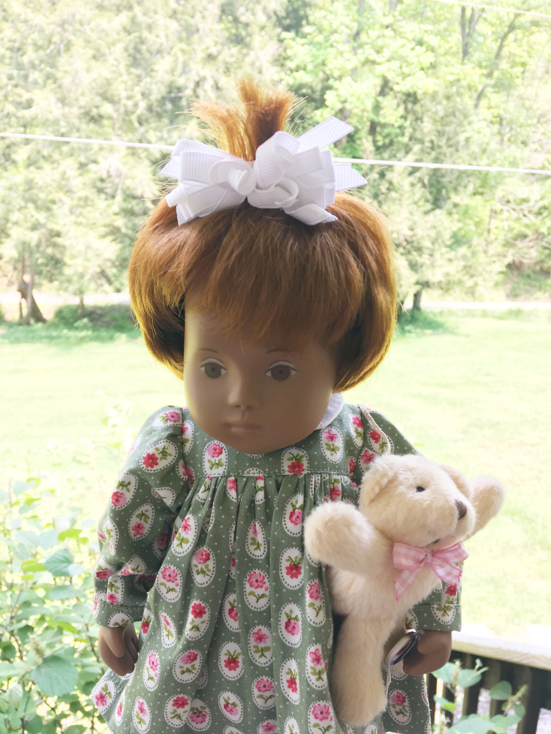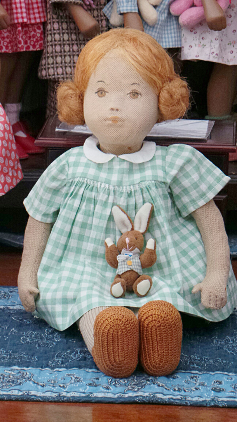13. Verity, a repaint by Janet Myhill-Dabbs, wearing her green gingham dress made by Janet.
