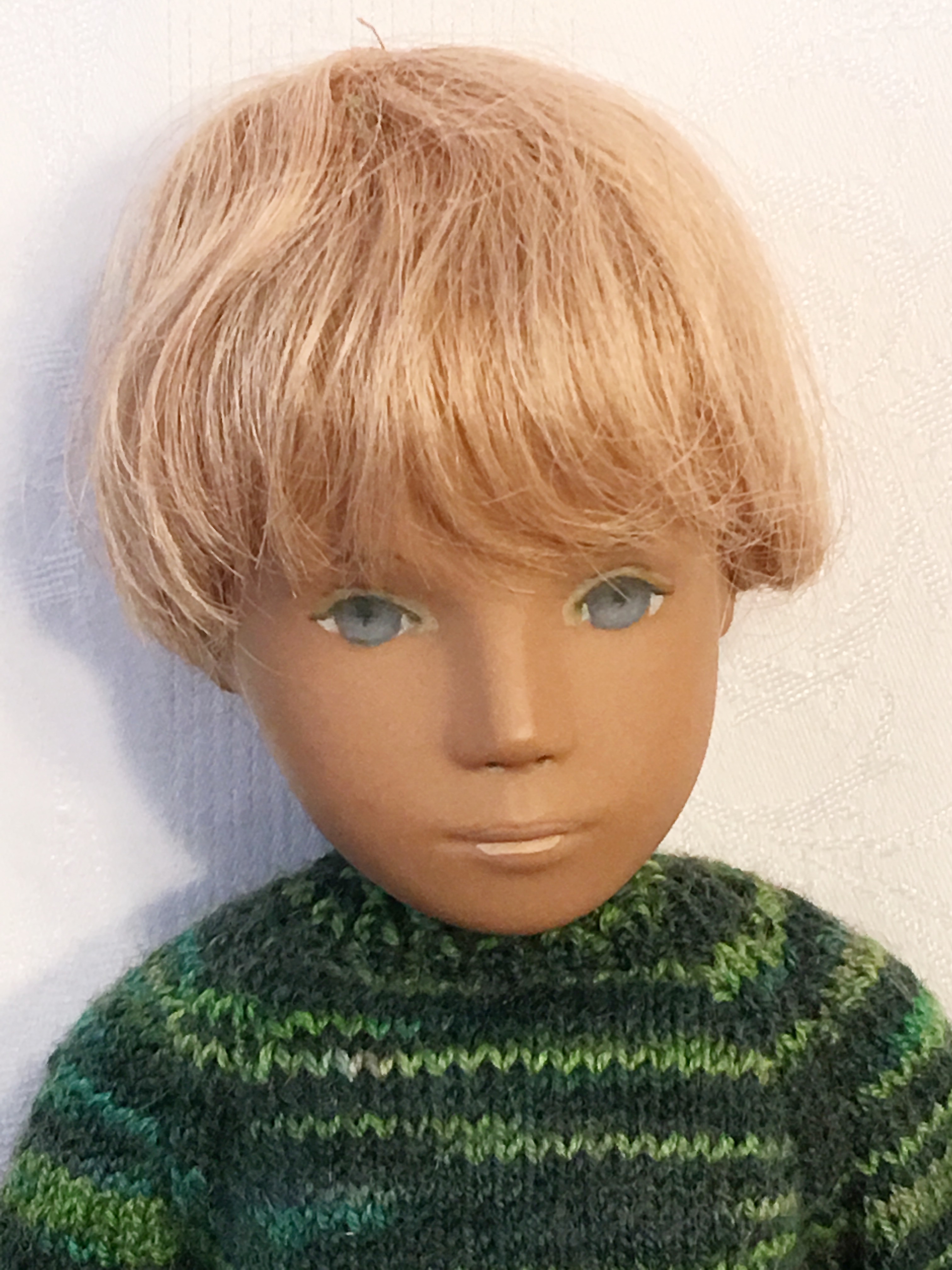 9.  Eastwood, a repaint by Janet Myhill-Dabbs wearing a green knitted sweater also made by Janet.