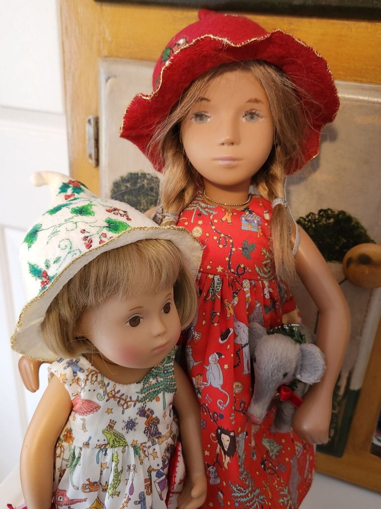 Next we see Betsy, a Gotz Iona toddler, join Gertie. Betsy is also wearing a delightful outfit by Sandra Bloomer and her leather elf boots were by Carrie, Sandra’s daughter. 🥰