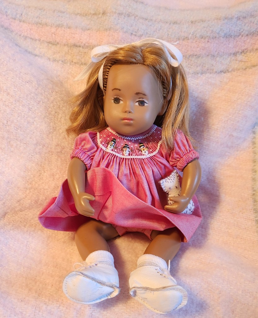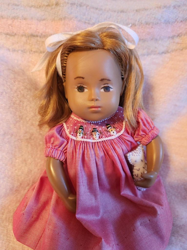 Please meet a precious Sasha baby beautifully repainted and rerooted by Pam Winter Turner. I have named her Kitty. Kitty is wearing a lovely smocked snowman dress made by Julie Ruleman. I think she is just wonderful. π₯°