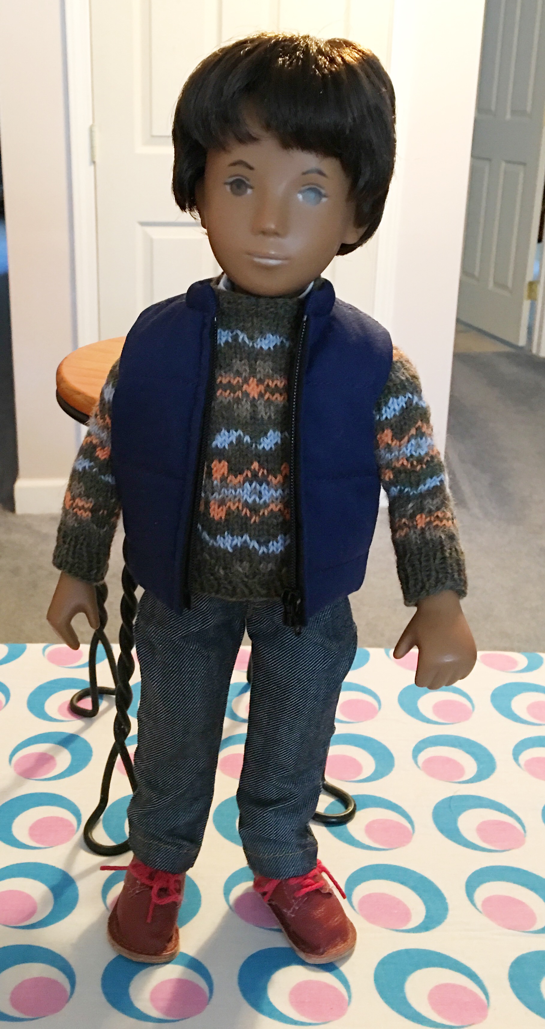 Ferris is wearing a knitted sweater, maker unknown and Ruthsdolls denim dungarees.