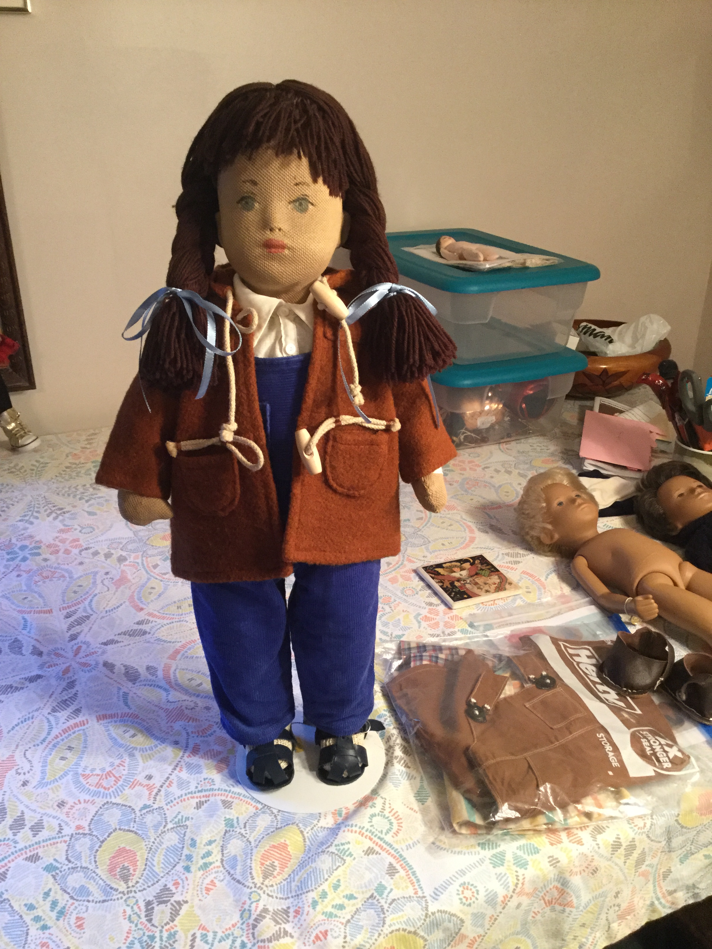 I dressed Addy in a pair of blue corduroy overalls made by Thu Cuc Faes but kept her shirt and duffle coat.