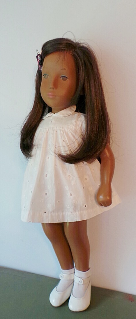 Mae is an earlier Gotz girl with ochre eyes. She was made in 1966. I found her on Shelly’s site where she stayed for a very long time since she is a waif. I love her and don’t think of her as a waif at all now.