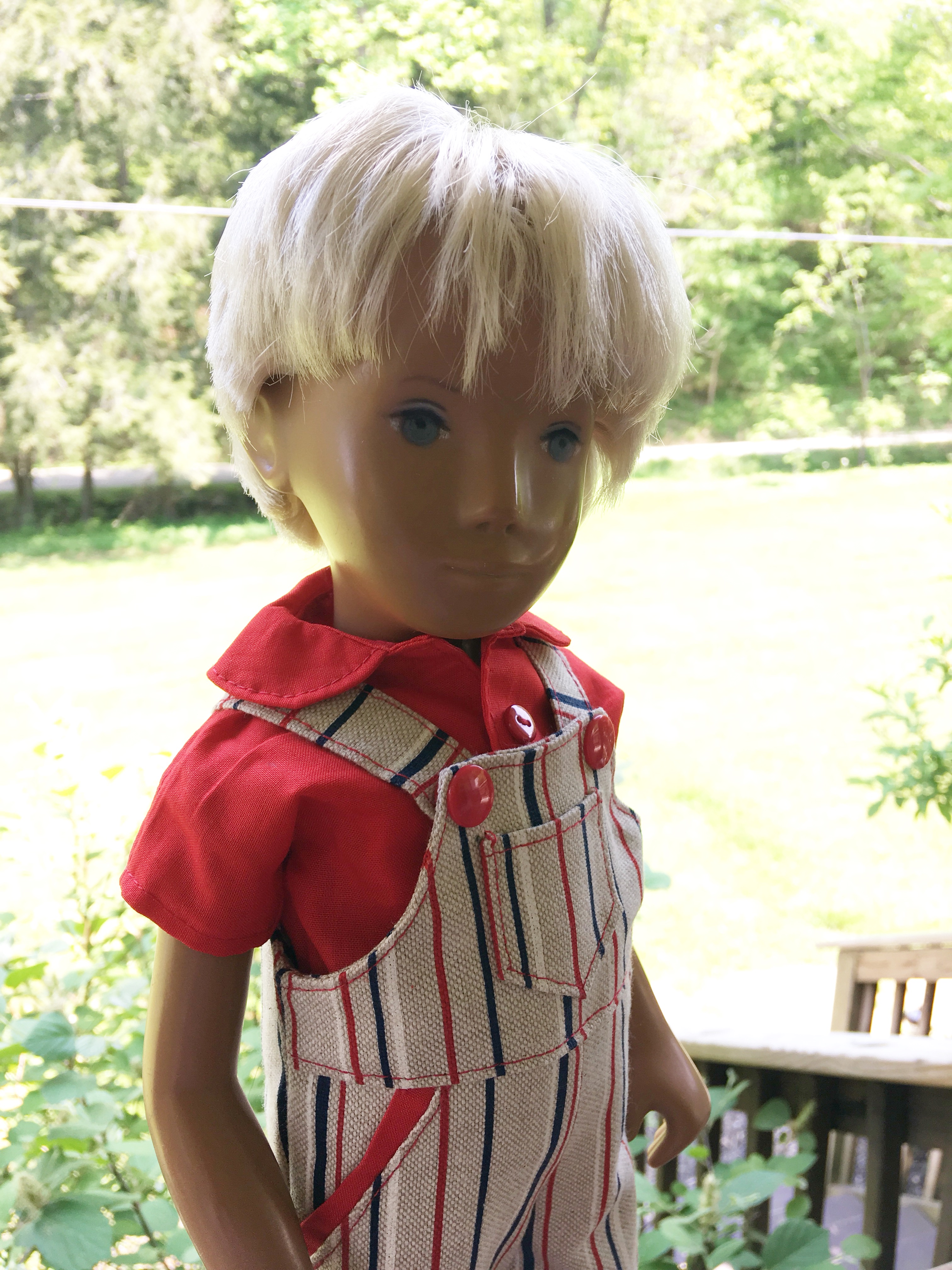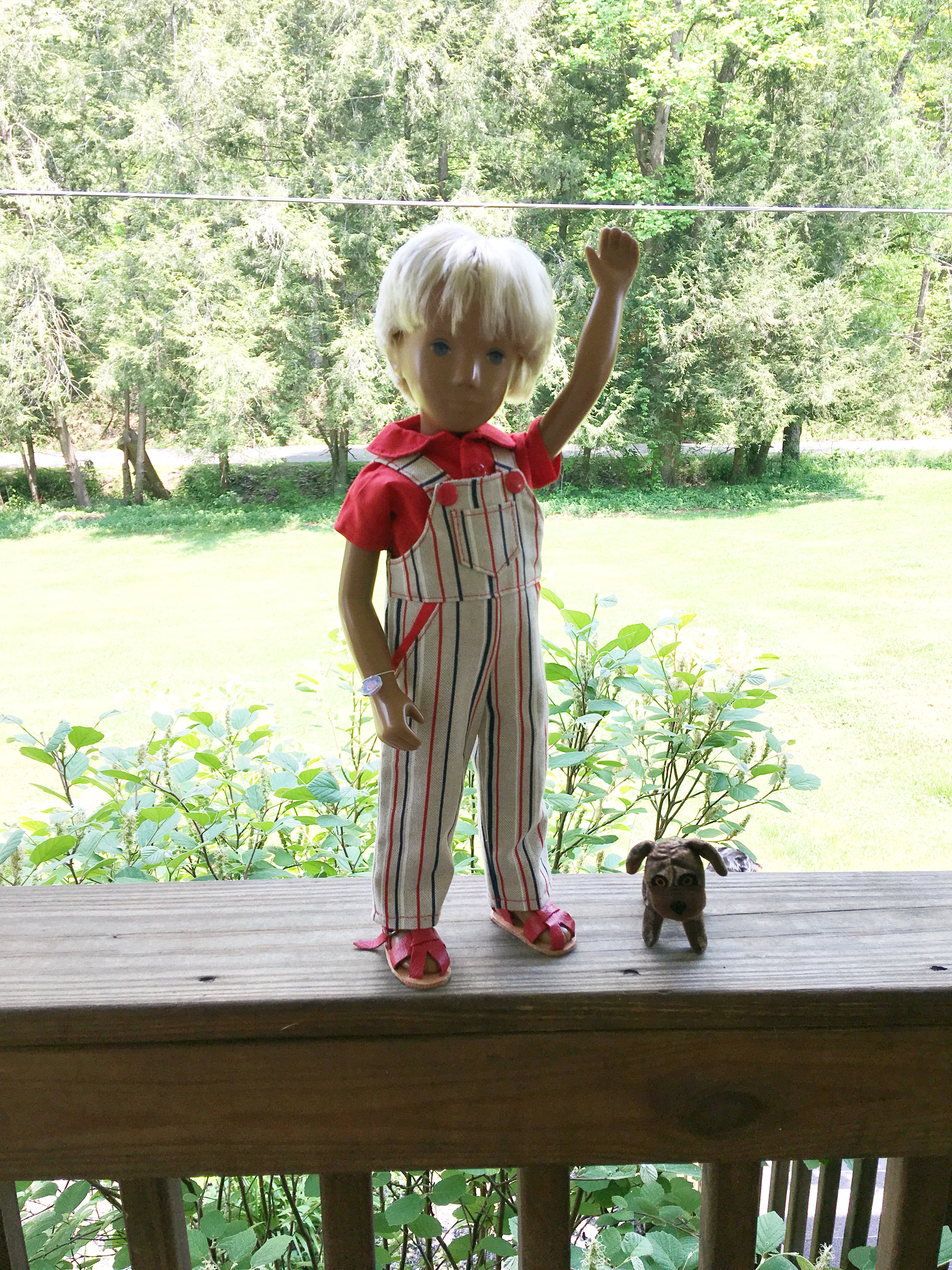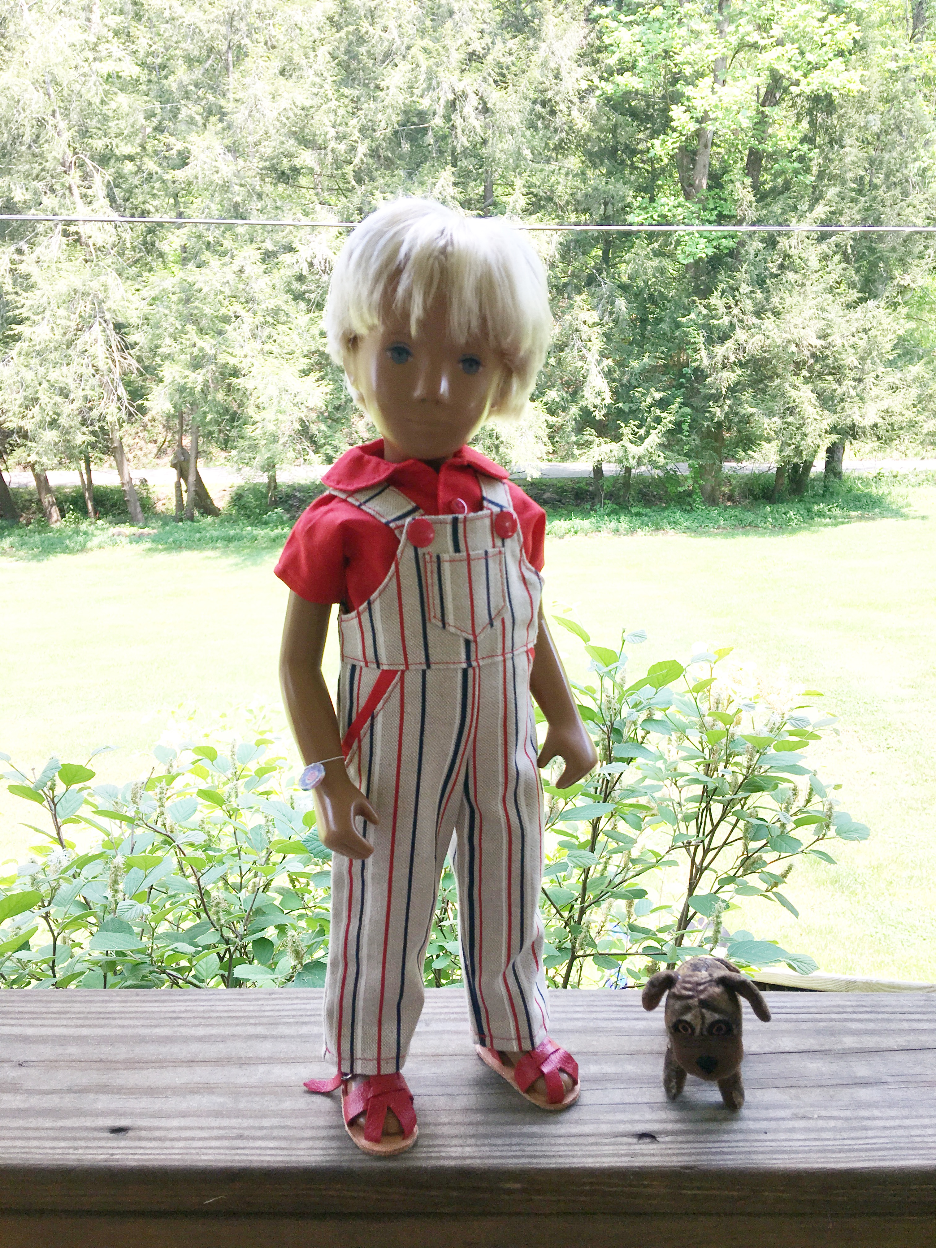 This handsome striped overall and cheery red shirt fit Finn perfectly. I love it!  His pup Fetch likes it too! The red leather sandals were made by Jean Jensen.
