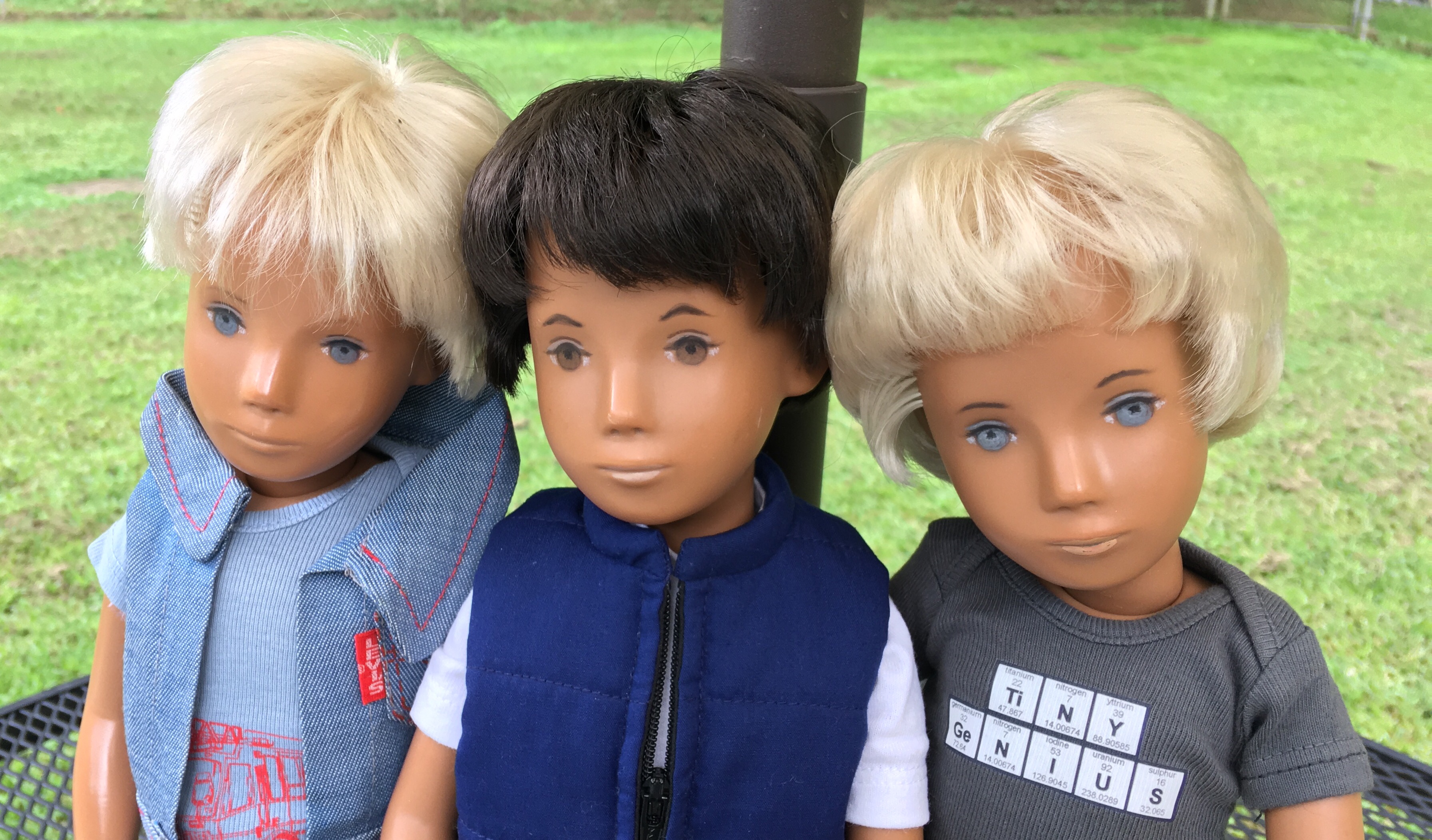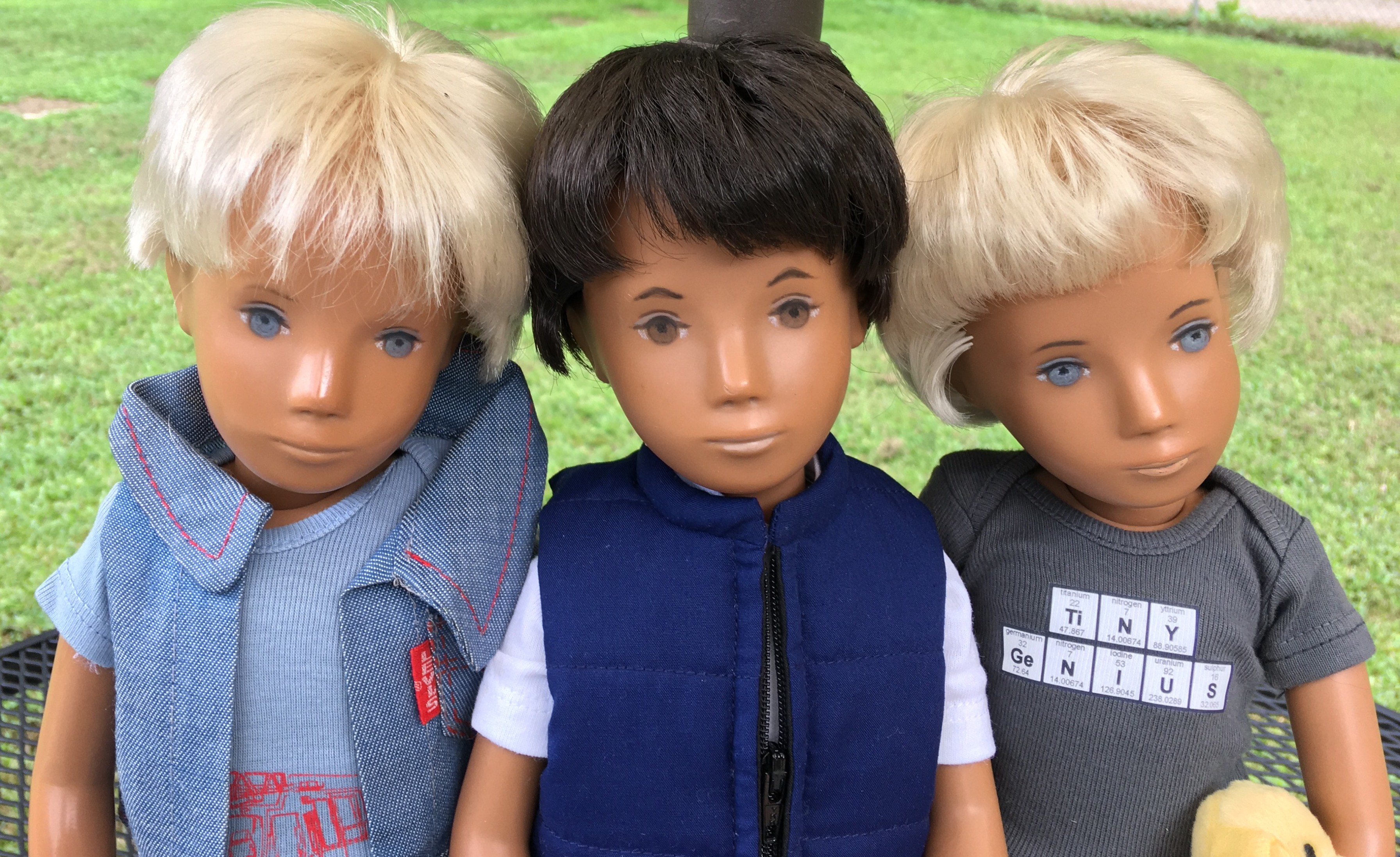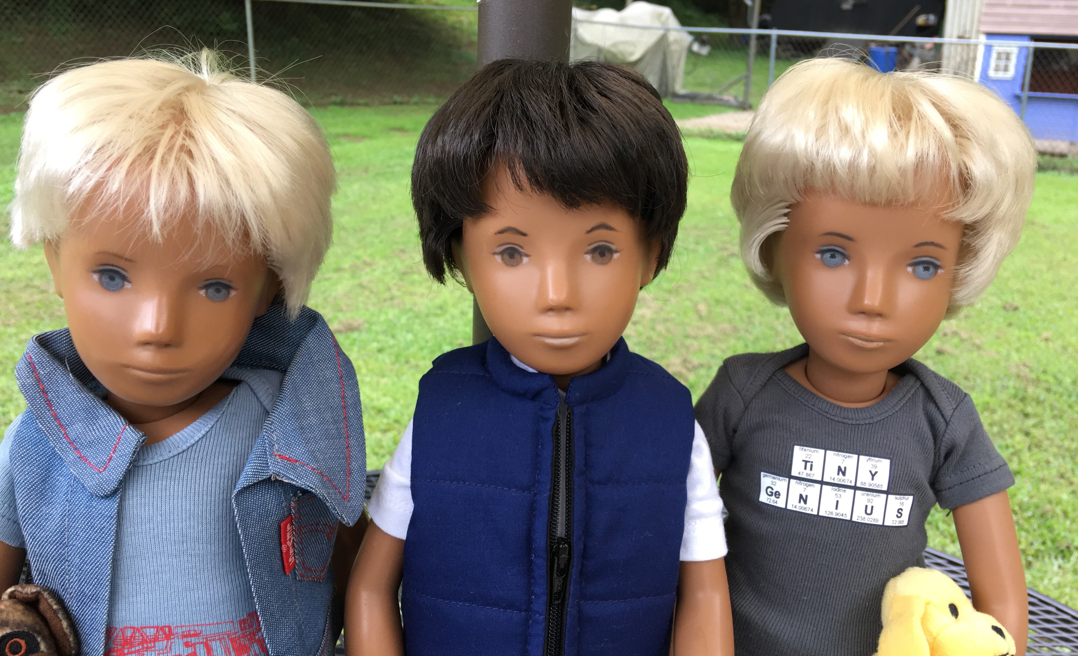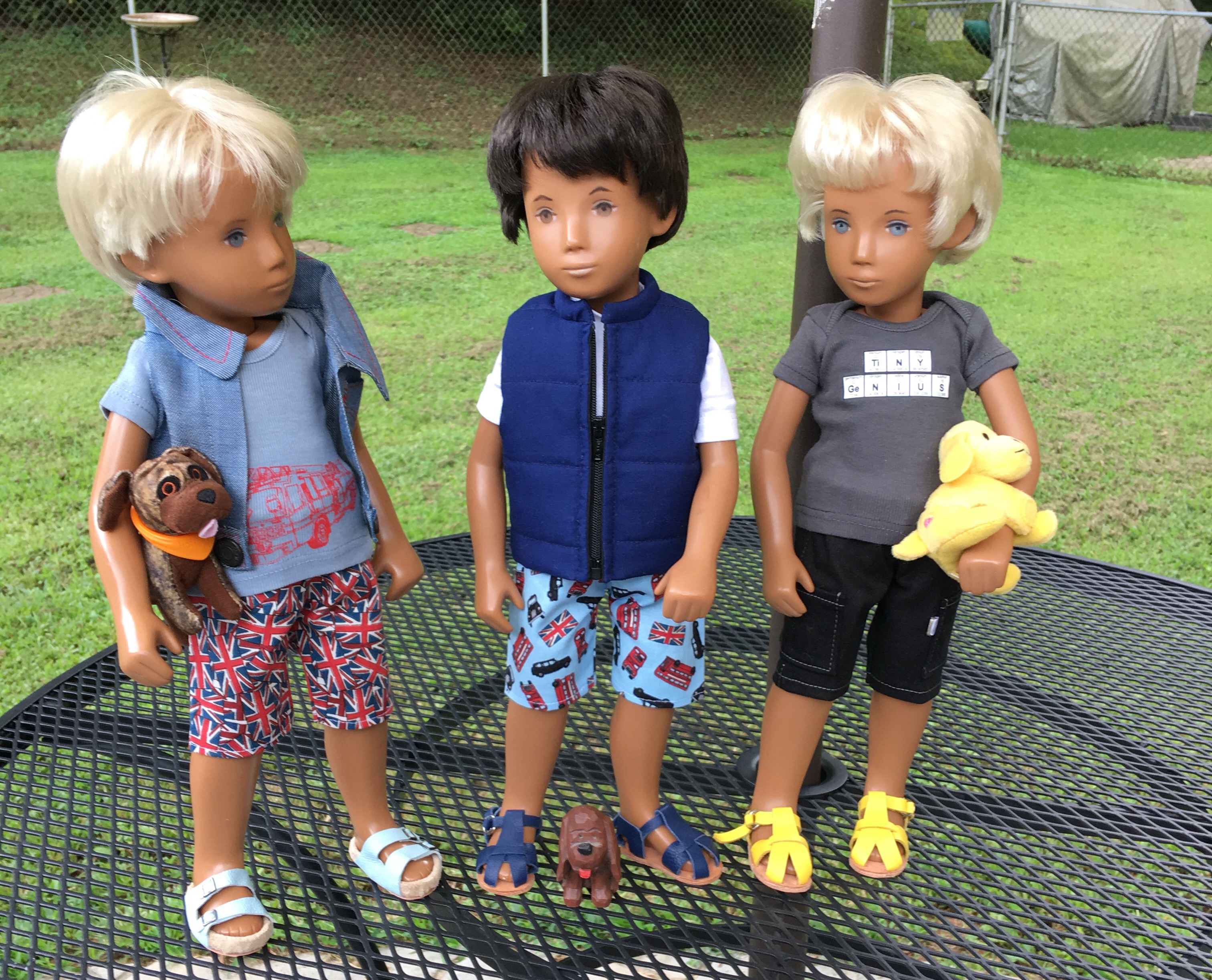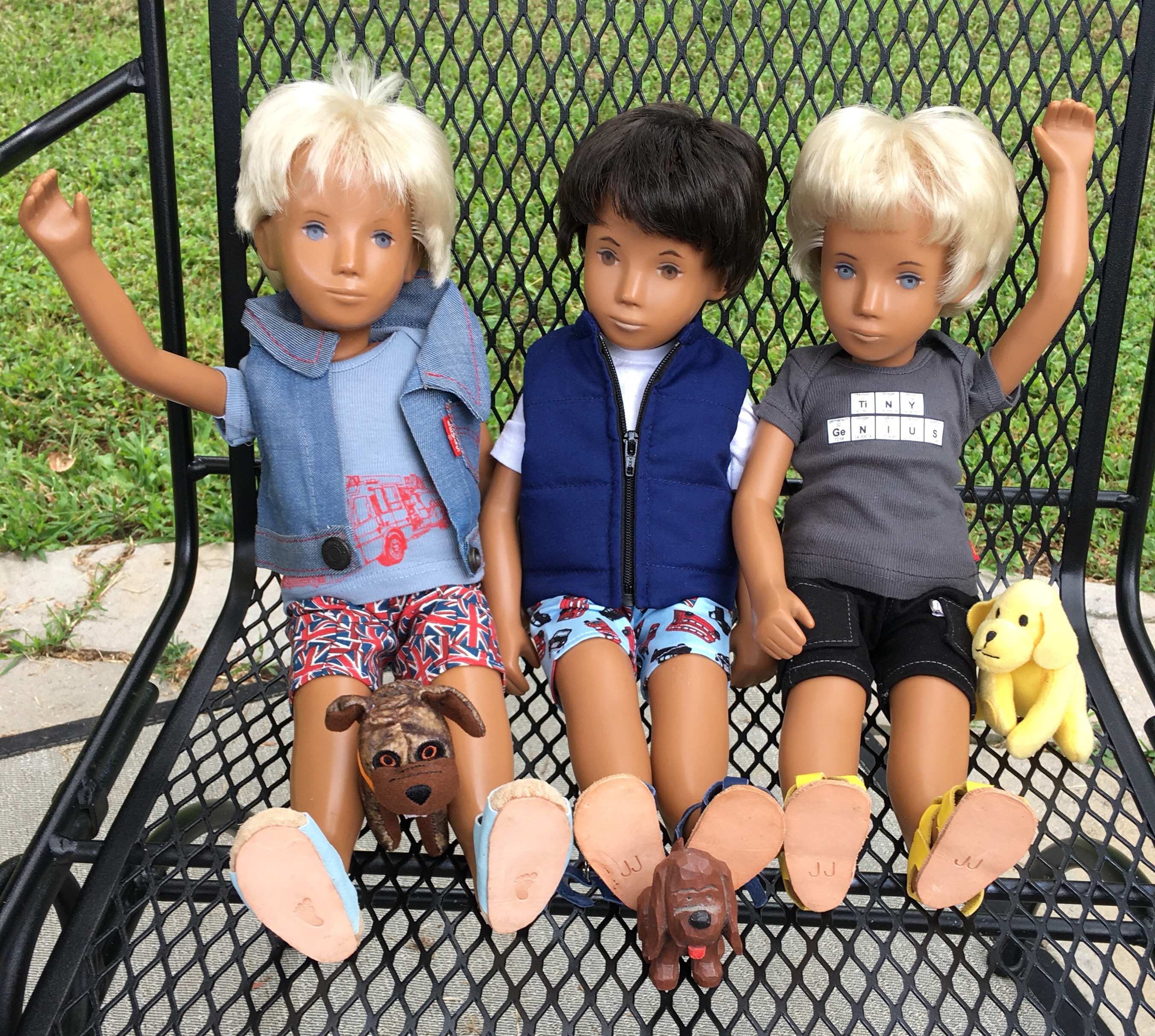 Note: The tall boy on the left is an early cloth doll made by Kathe Kruse and is known as a German grandchild.  His name is Freddy.  The curly redheaded boy is made of felt and was made by R. John Wright.  His name is Scott.  The tiny blonde boy is made of felt and was also made by R. John Wright.  His name is Cole.  Lastly, is the vinyl boy made in 1967 and he is an NP Sasha doll.  His name is Finn.  I love them all but Finn has my heart completely. ❤