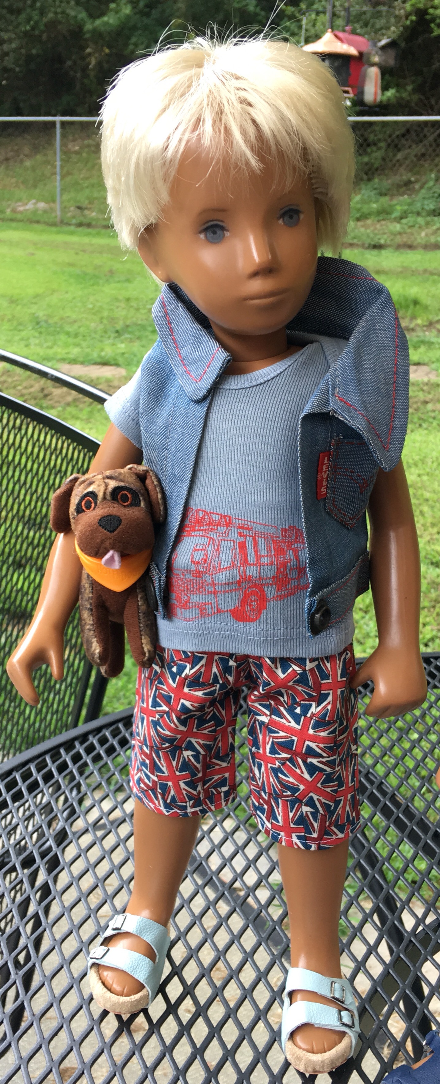 Finn is holding his favorite pup named Fetch.  Finn is wearing a Sashapotamus t-shirt, a Levi denim vest, wonderful flag shorts by Lorraine Tyler, and light blue leather Birkenstocks  by Marti Murphy.