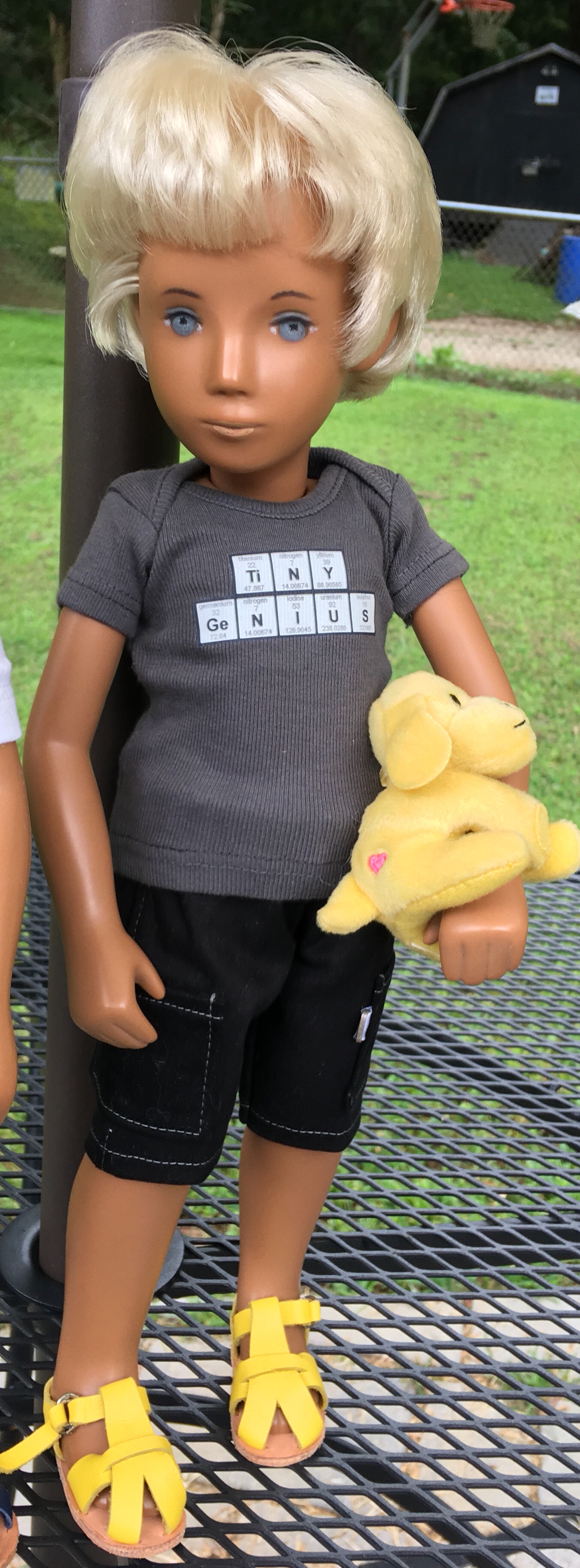 Now, we have Ferris wearing a t-shirt by Sashapotamus (yes, Ferris is extremely intelligent and loves chemistry), fabulous black cargo shorts by Sharon Humphreys, and gold leather sandals by Jean Jensen.  His blonde puppy is very clingy and we called him Fido.