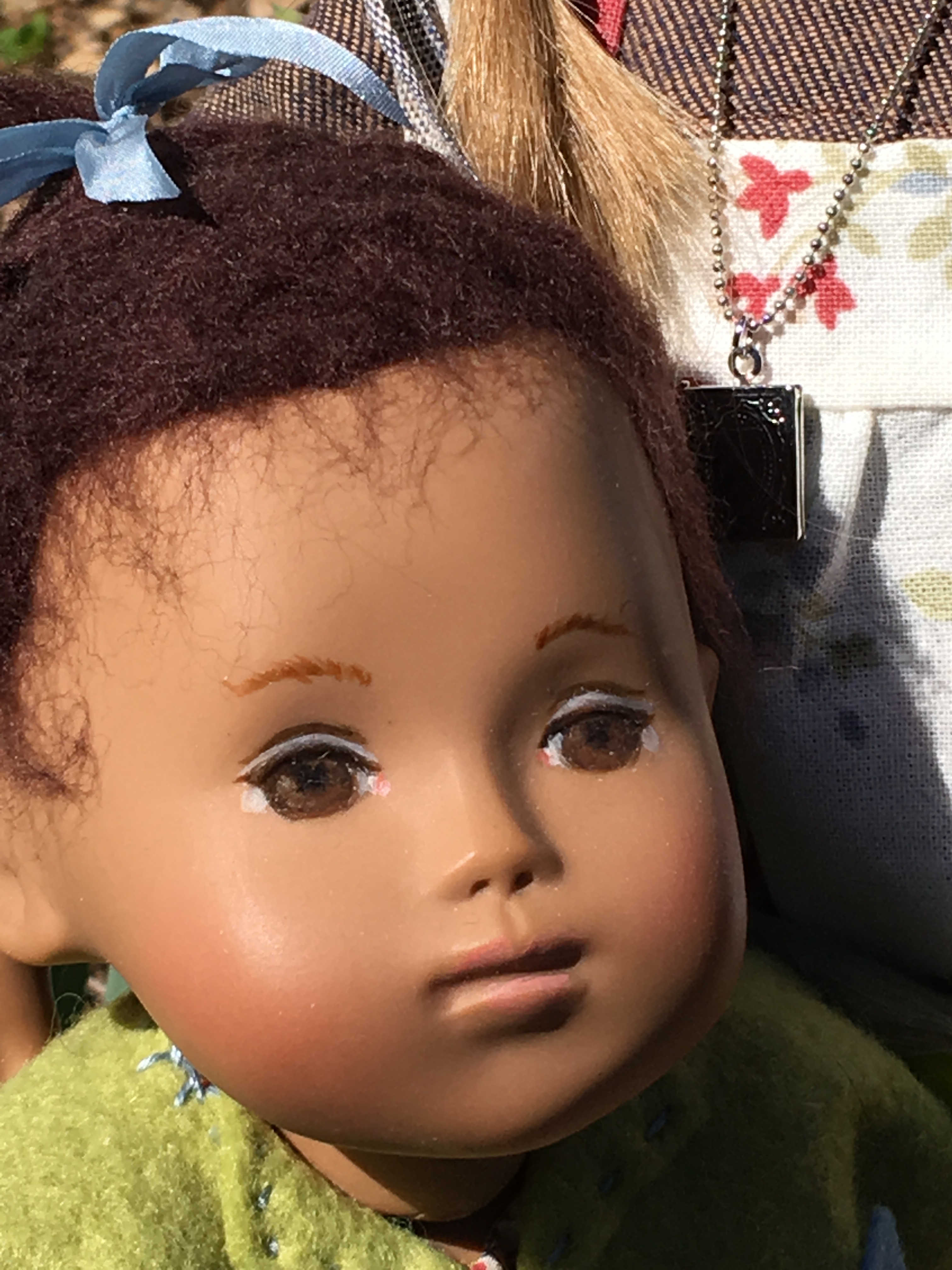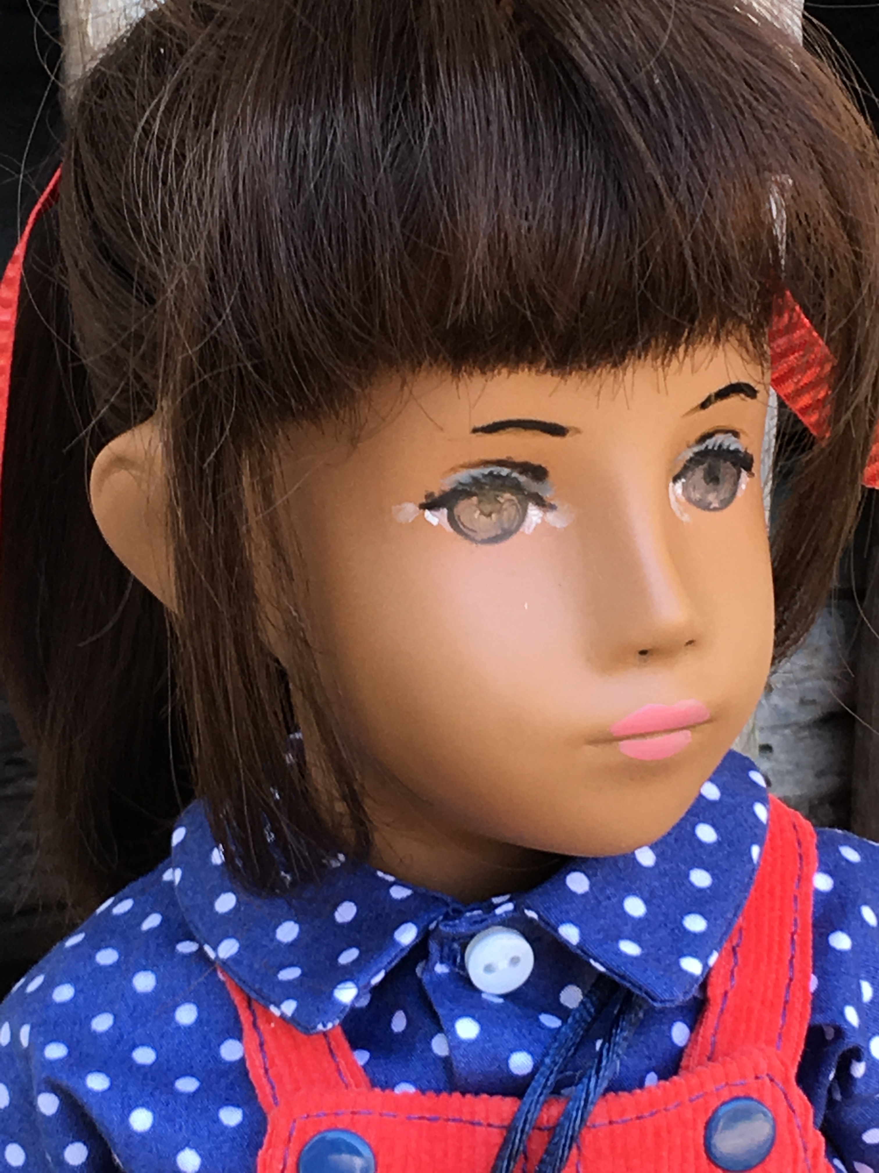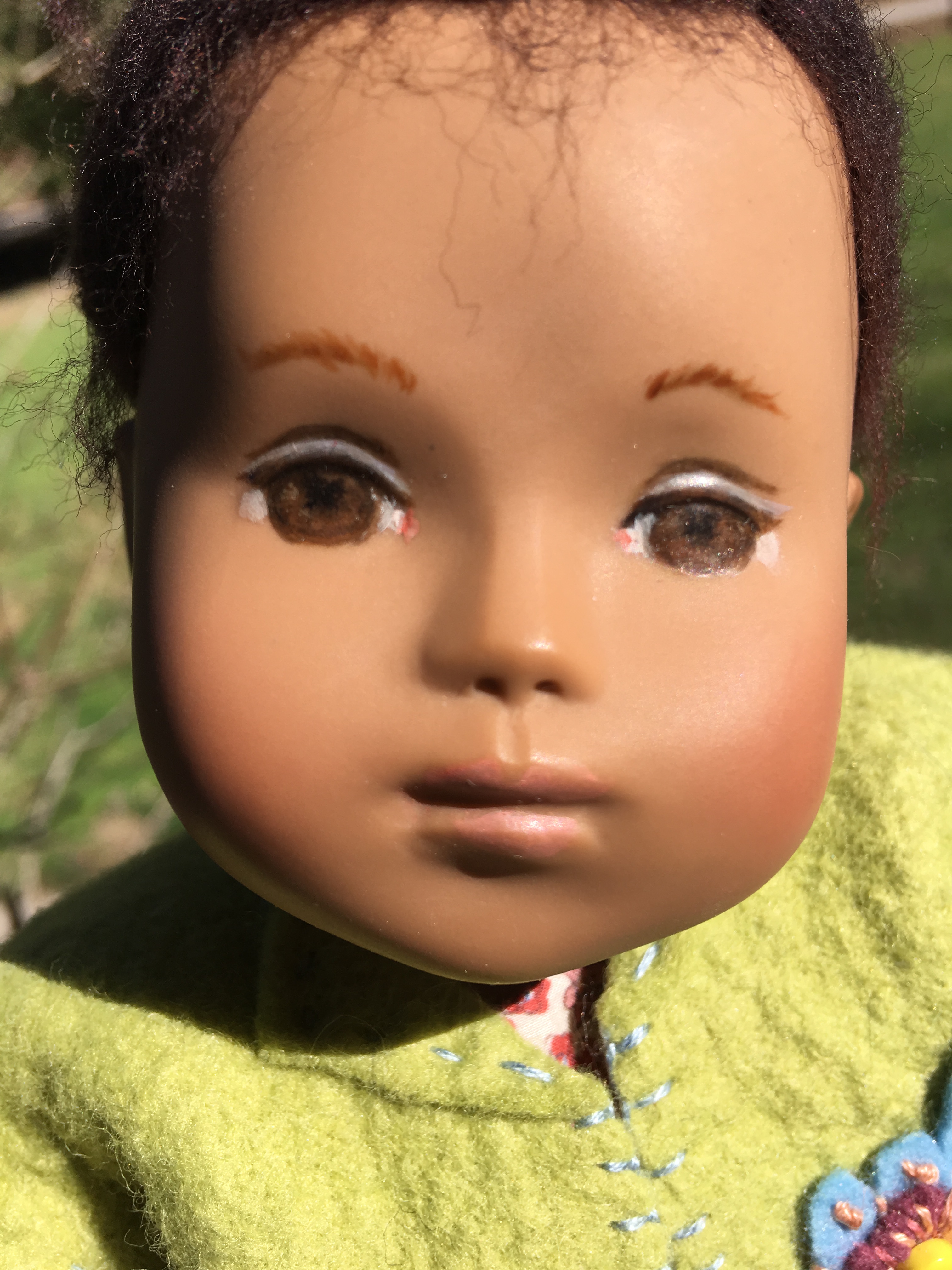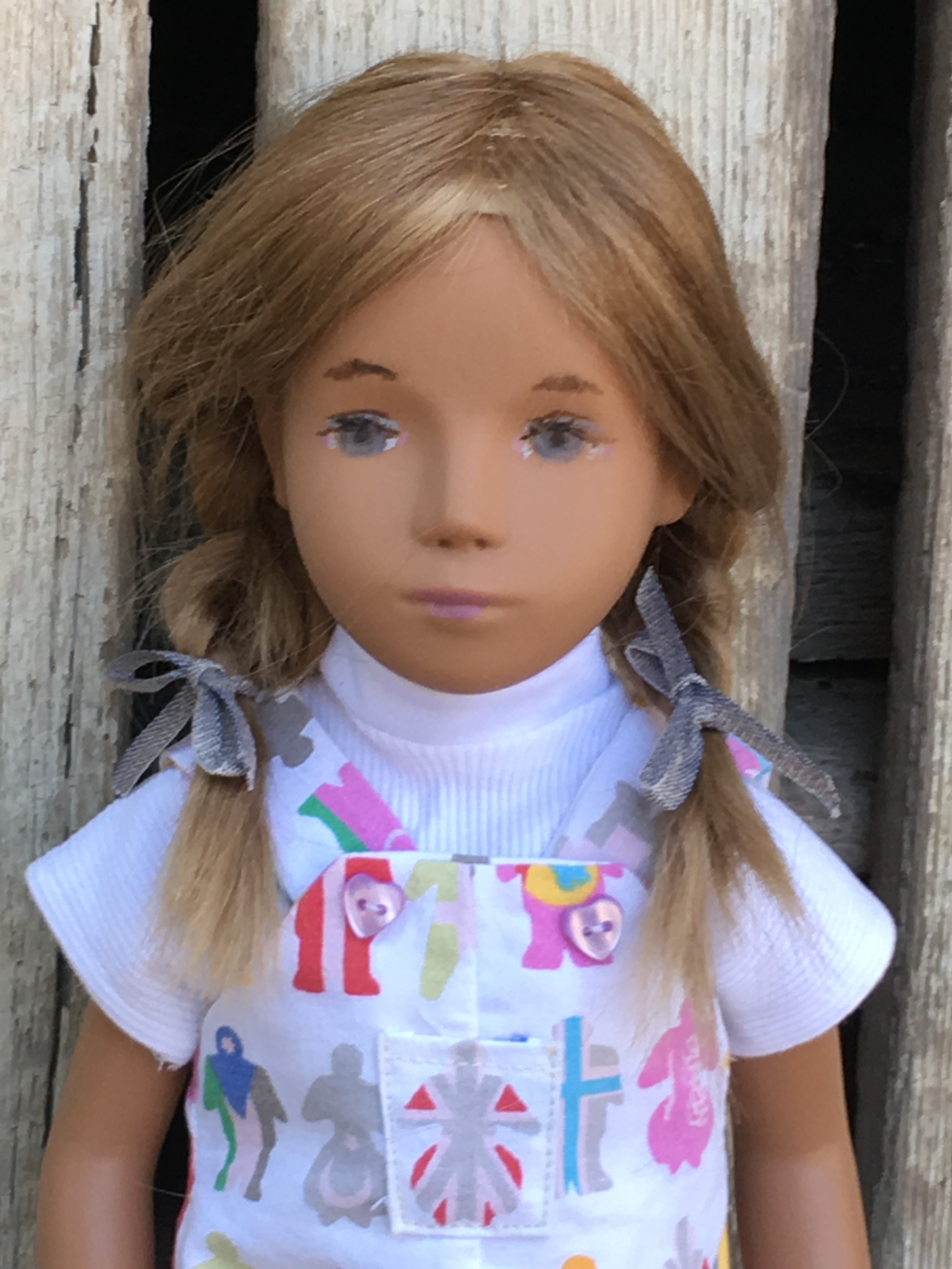 Cathy is a very early Gotz girl with her ochre eyes and her no mold line torso. She is a petite girl with nice silky hair.