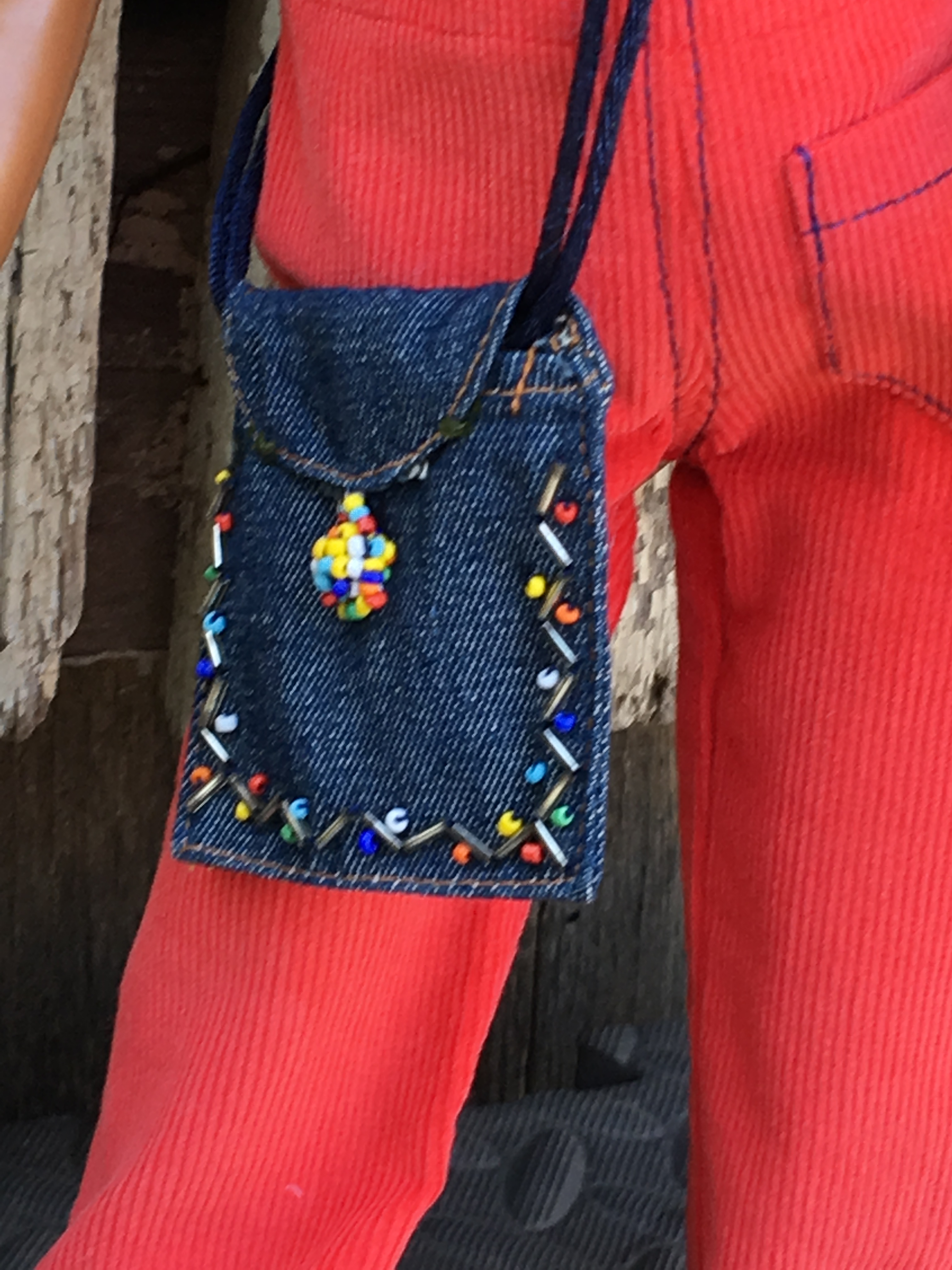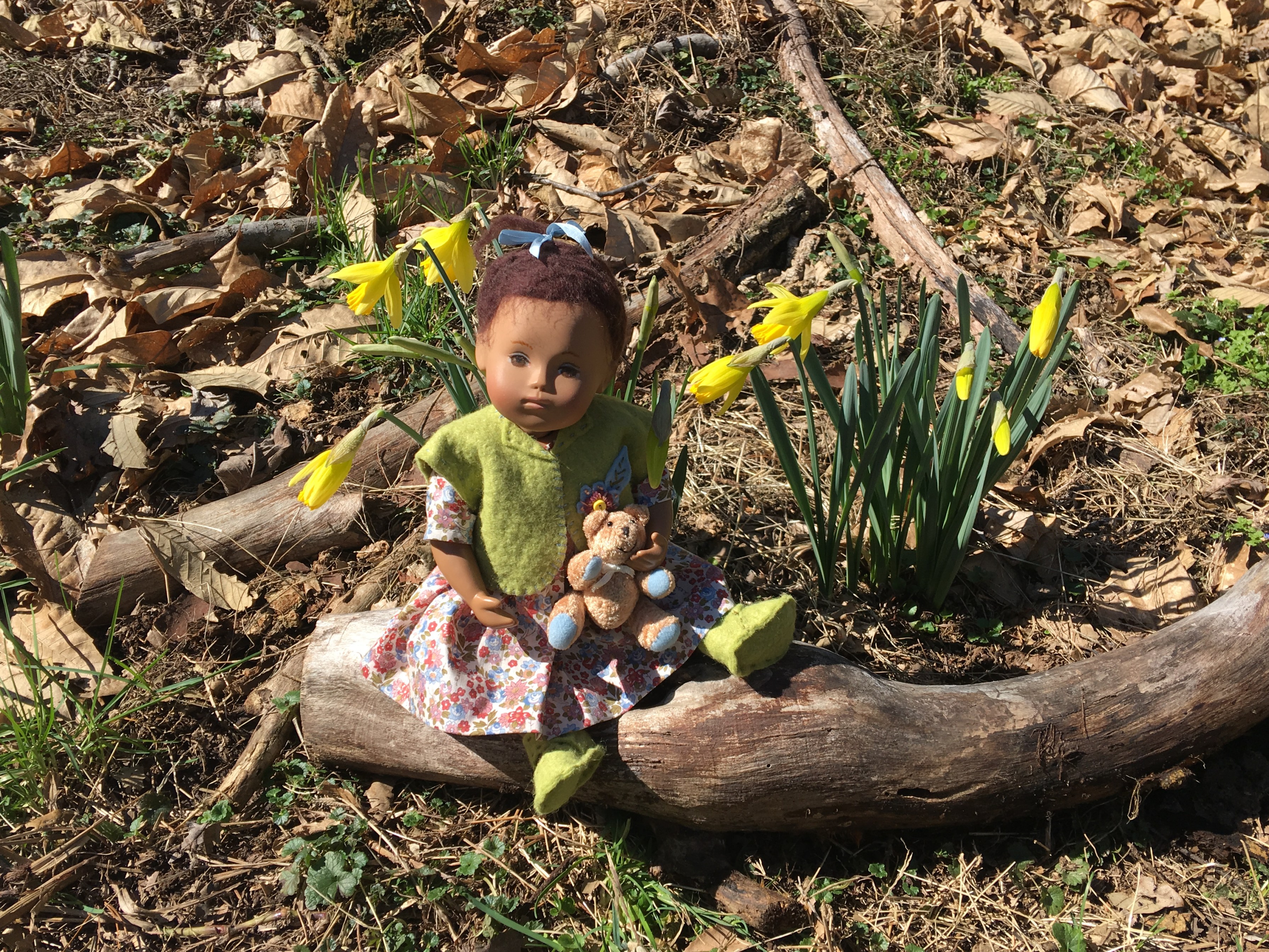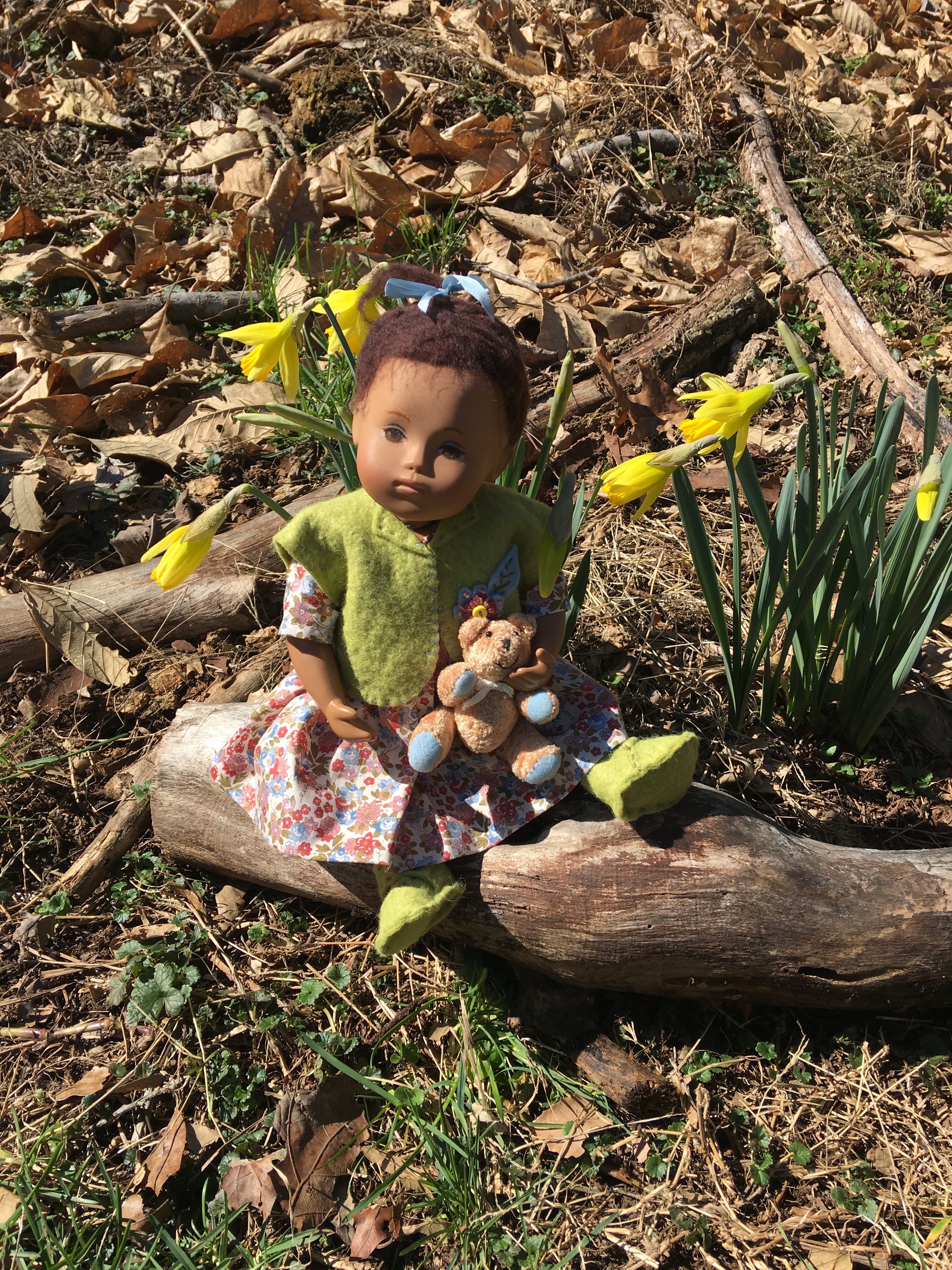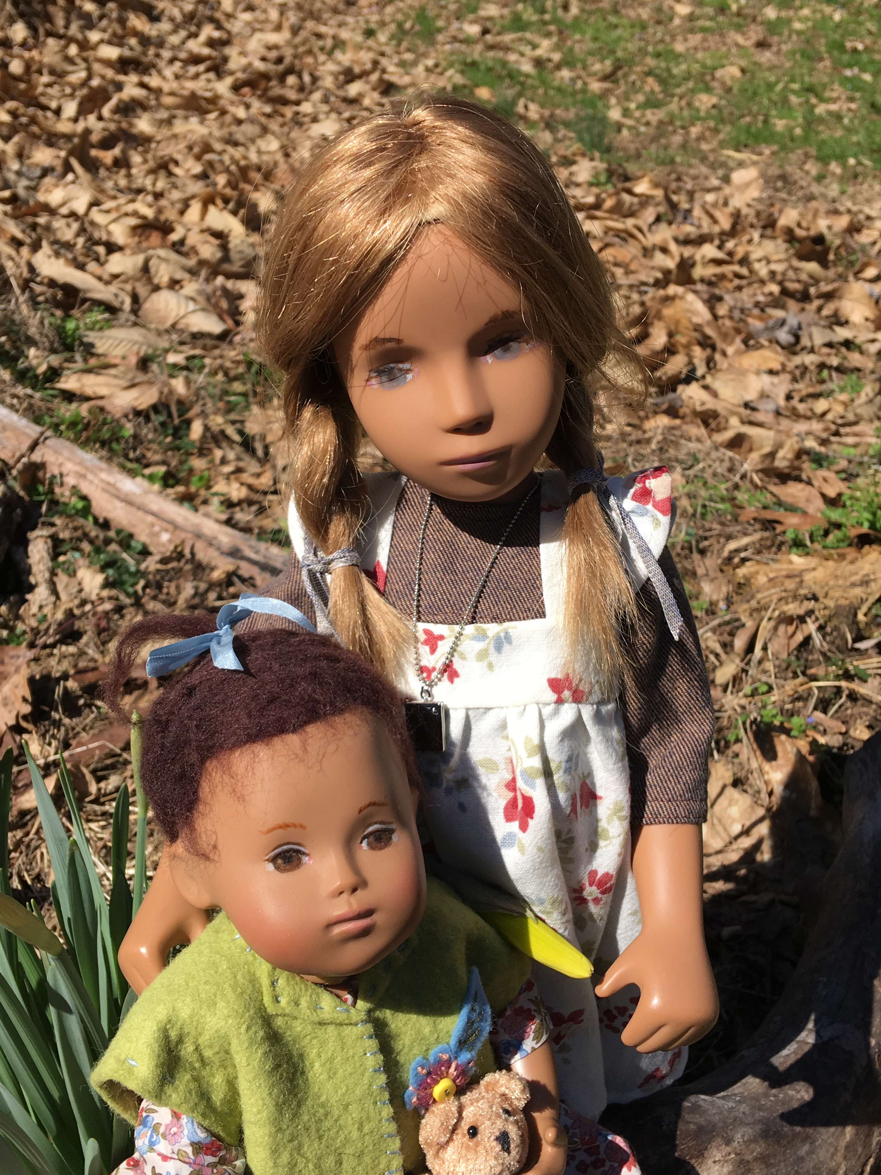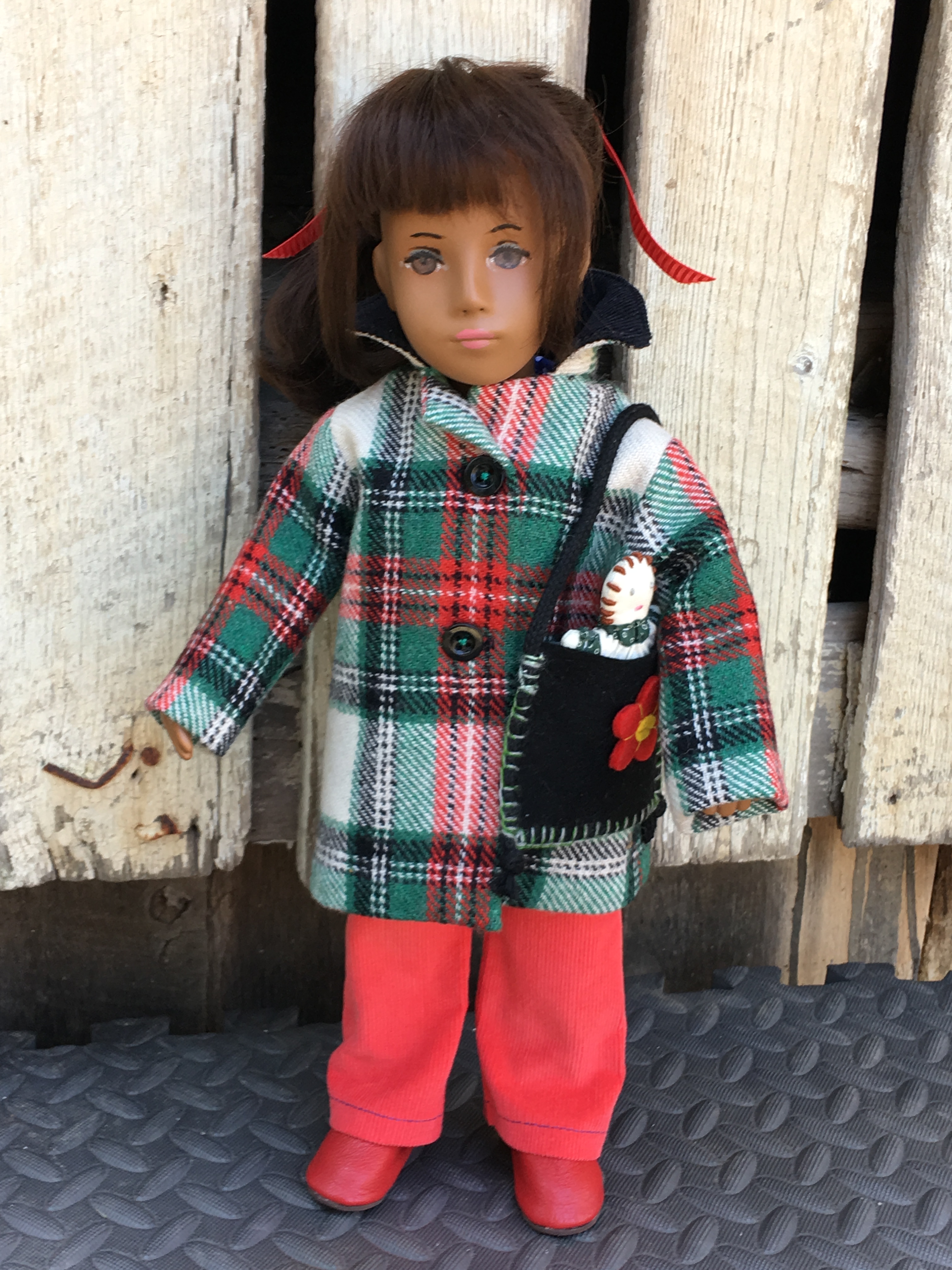 Gertie is dressed in a pretty floral dress with a frilly white blouse. The maker is unknown and the outfit was found on Shelly’s most enjoyable site. Her beautiful locket is a gift from her twin sister Edith who lives with Janet.
