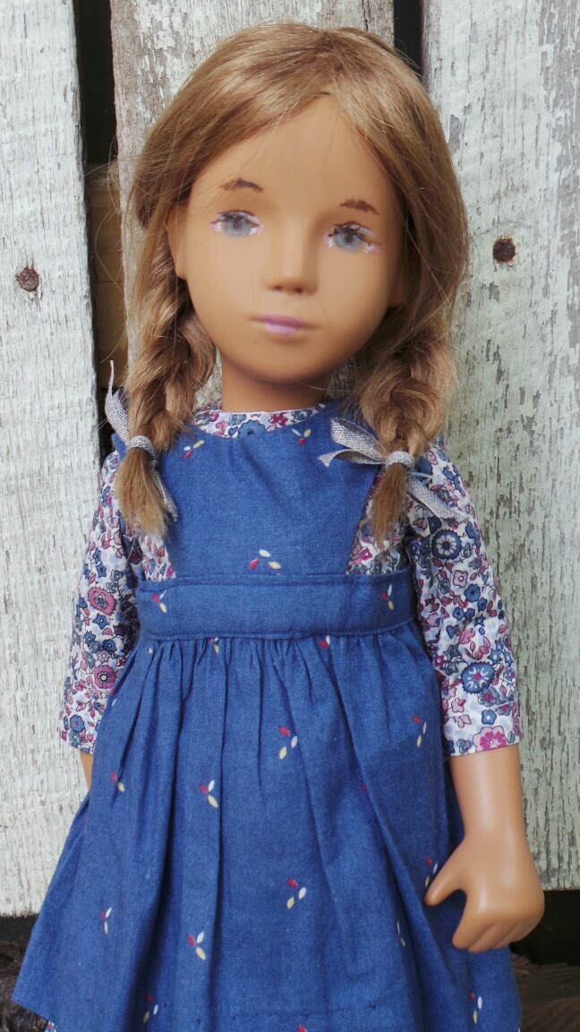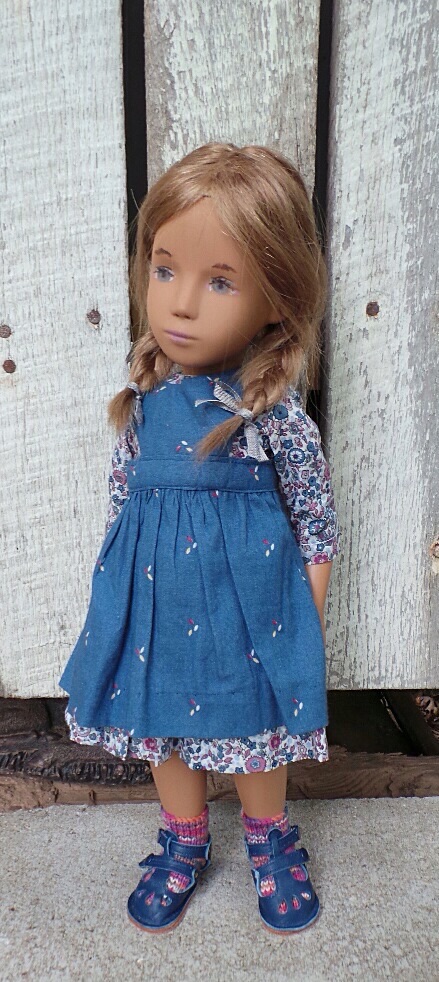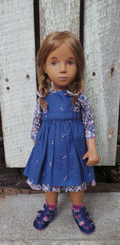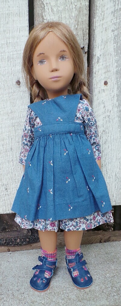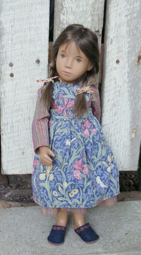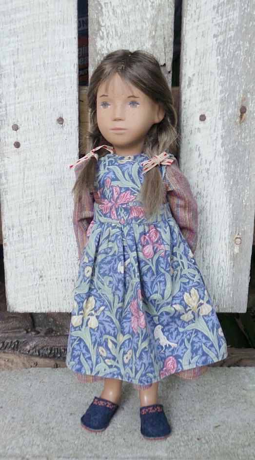 Now, let’s look at a few photos of just Lizzy. Janet used vintage William Morris fabric. I love this pinafore and its lovely, muted colors. β€