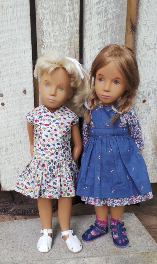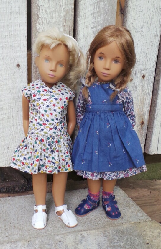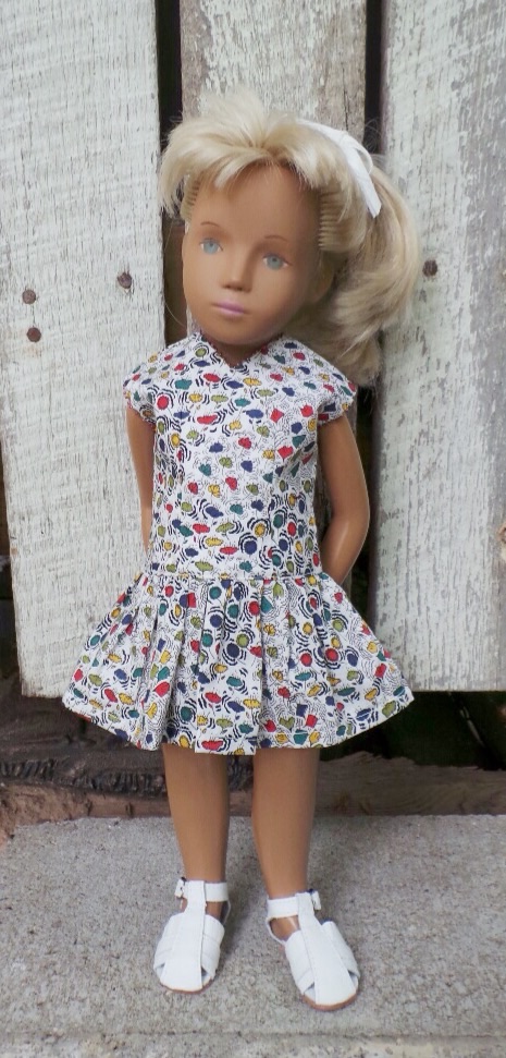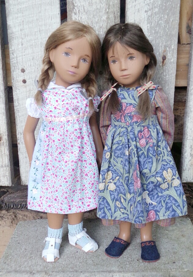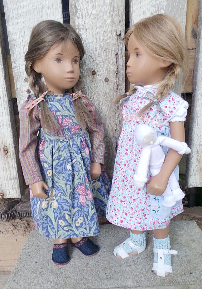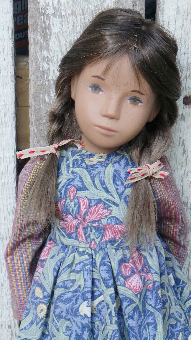 Now, let’s look at a few photos of just Lizzy. Janet used vintage William Morris fabric. I love this pinafore and its lovely, muted colors. β€