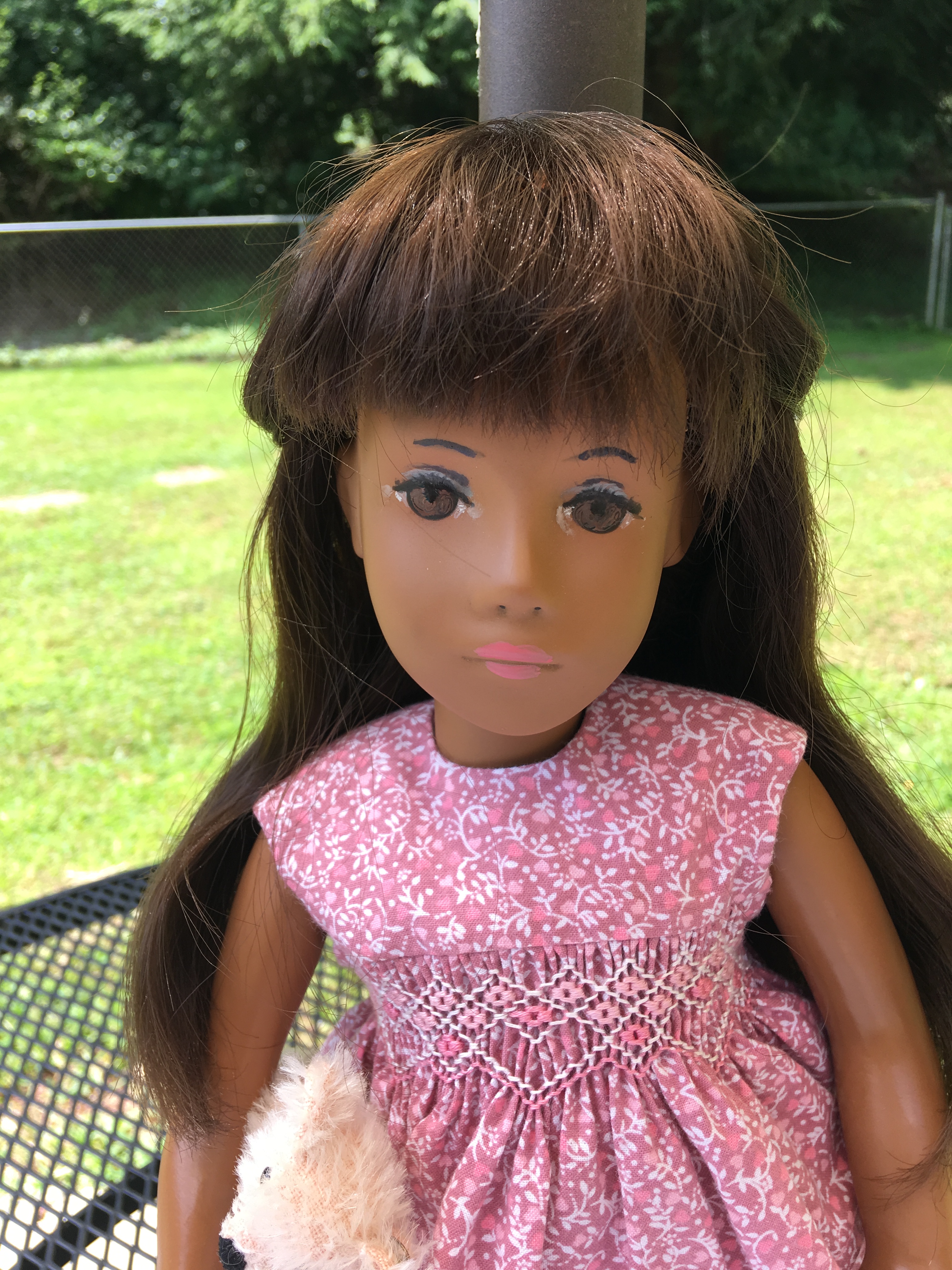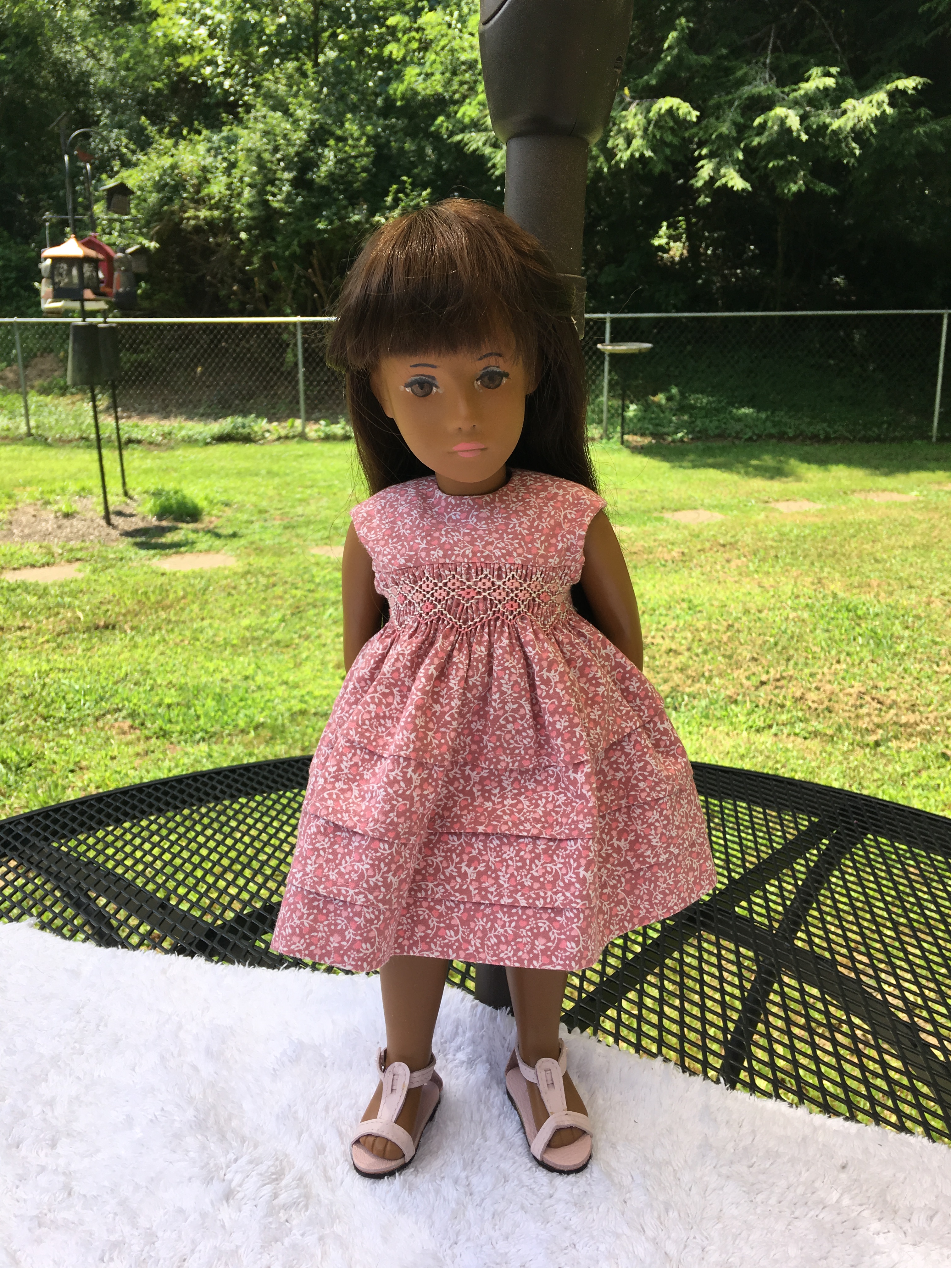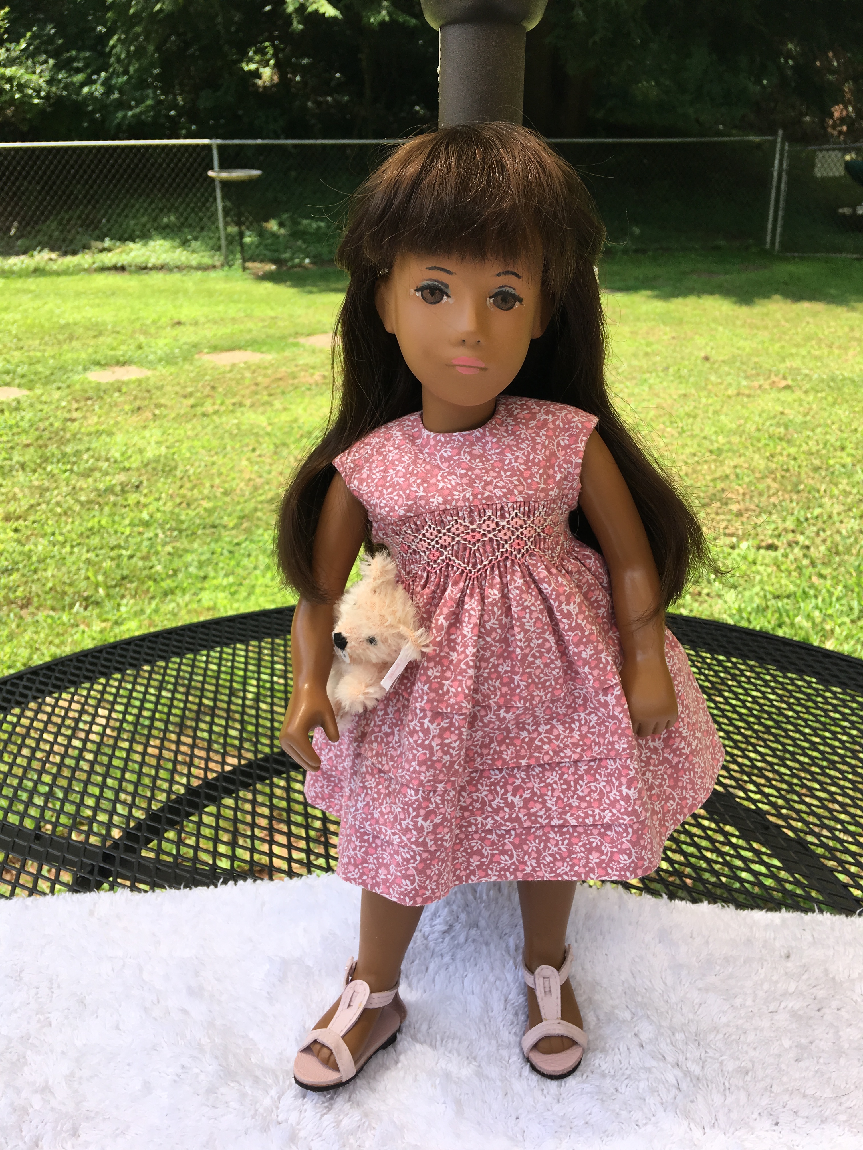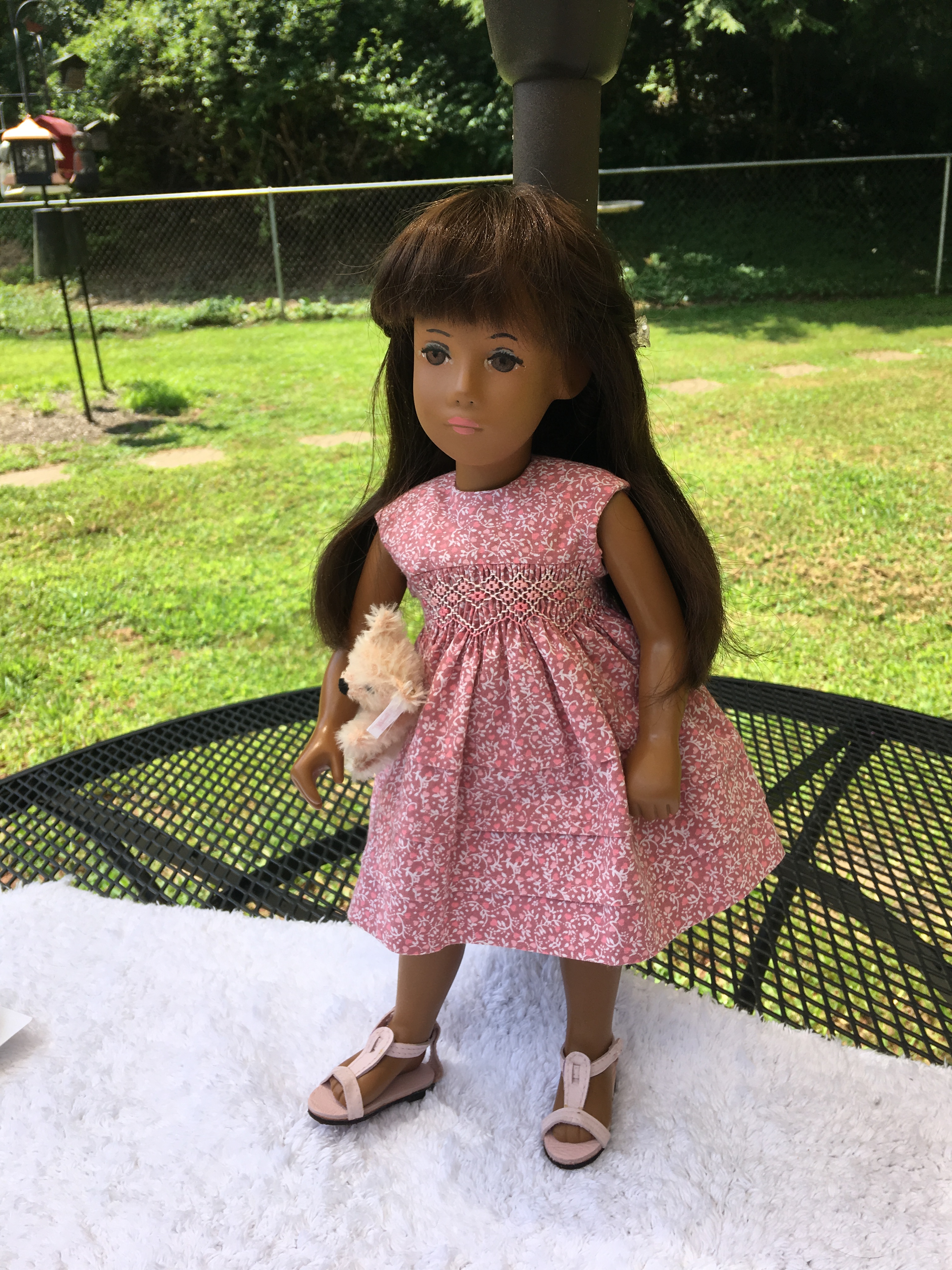 This is Morgen, a very special Gotz girl who was painted by Sasha herself. I wanted to show her in this pretty smocked frock made by Millie Dingham and pink leather sandals found on Shelly’s site (maker unknown). Morgen holds a pale pink Steiff bear. I just love Morgen and so I have taken a lot of photos of her. I hope you enjoy seeing them.