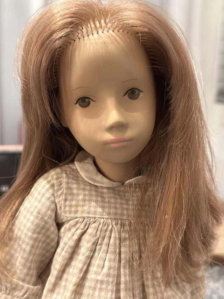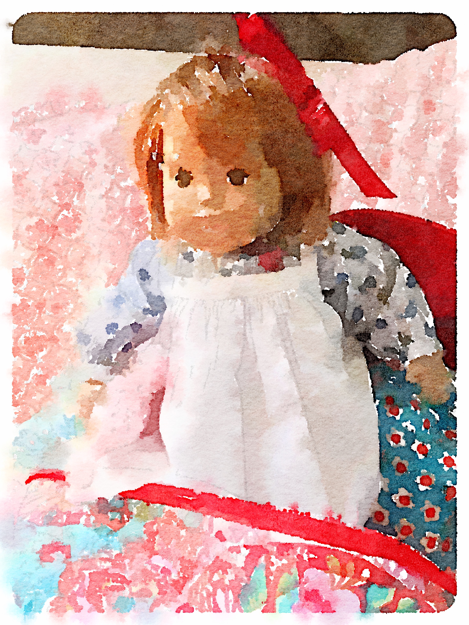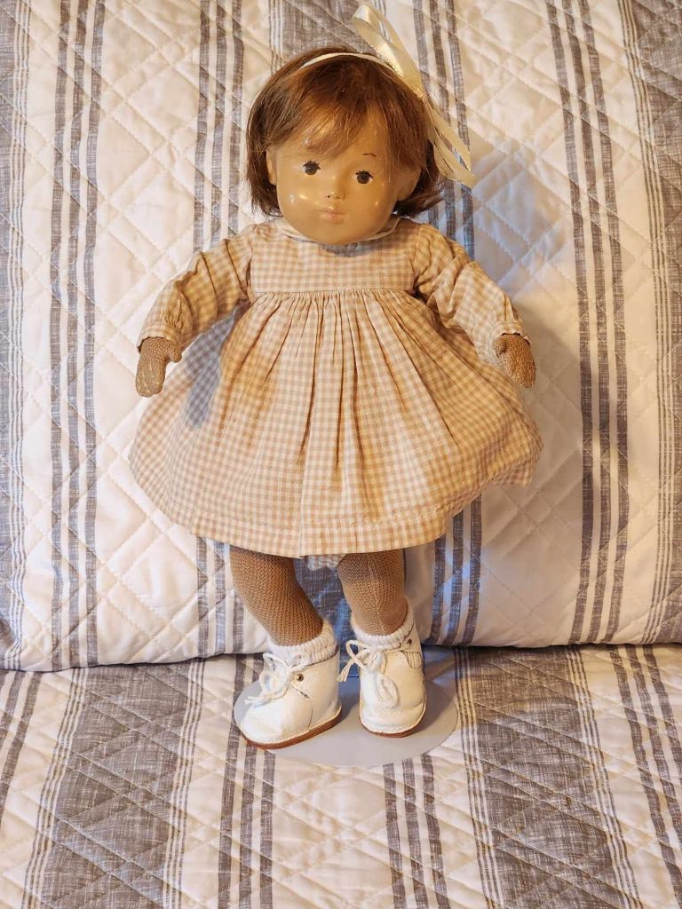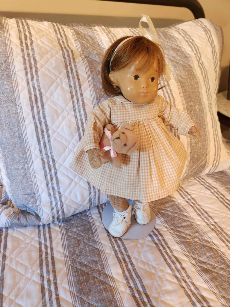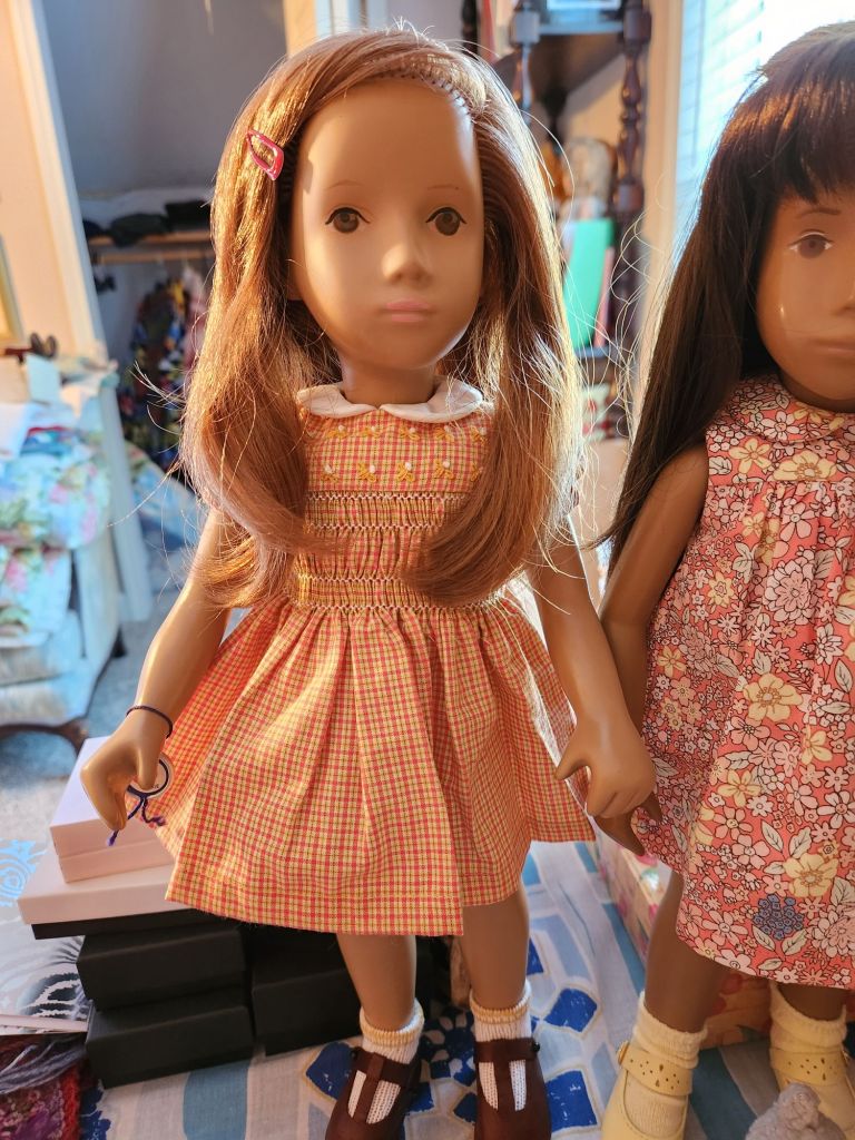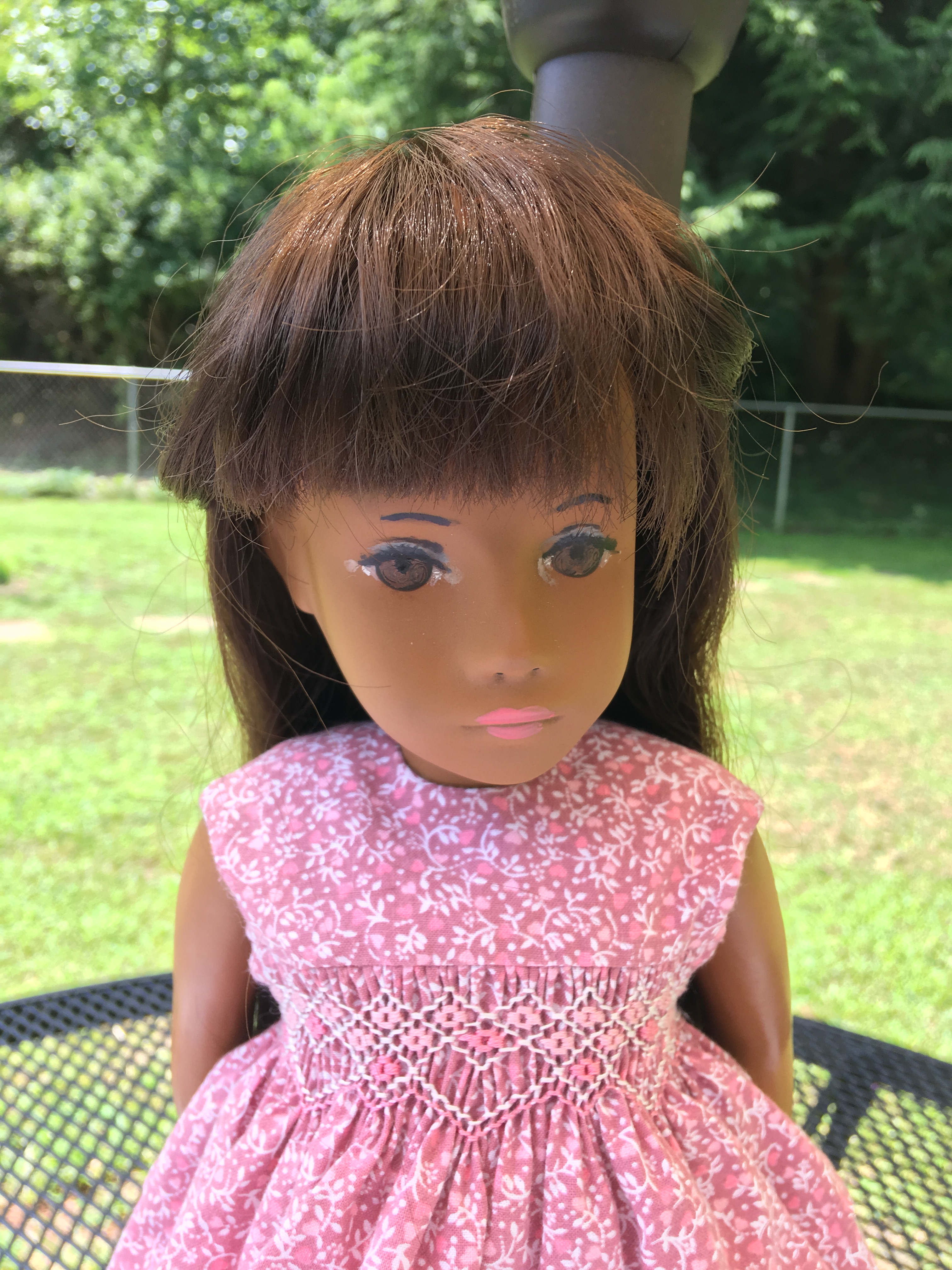 This is Morgen, a very special Gotz girl who was painted by Sasha herself. I wanted to show her in this pretty smocked frock made by Millie Dingham and pink leather sandals found on Shelly’s site (maker unknown). Morgen holds a pale pink Steiff bear. I just love Morgen and so I have taken a lot of photos of her. I hope you enjoy seeing them.