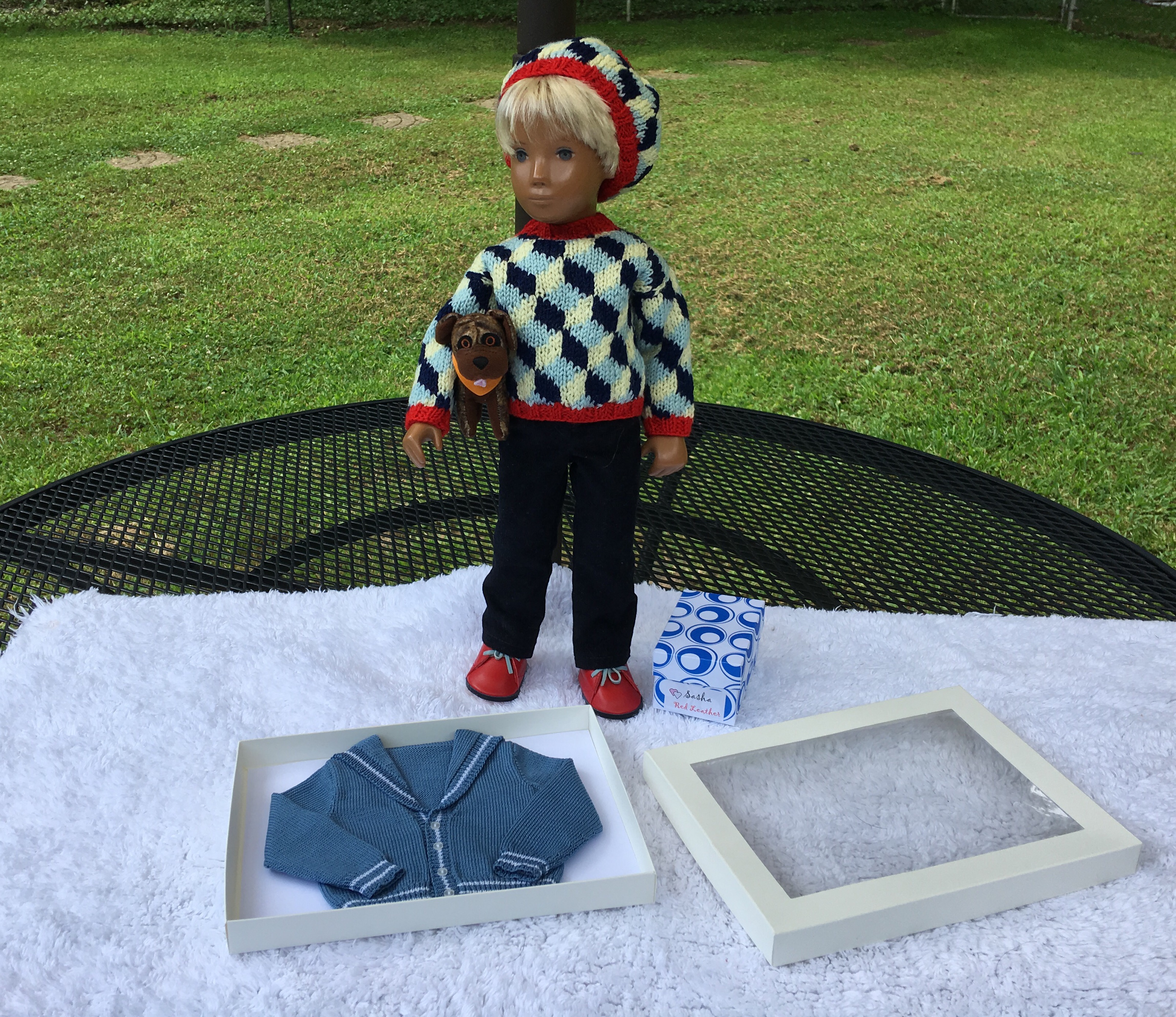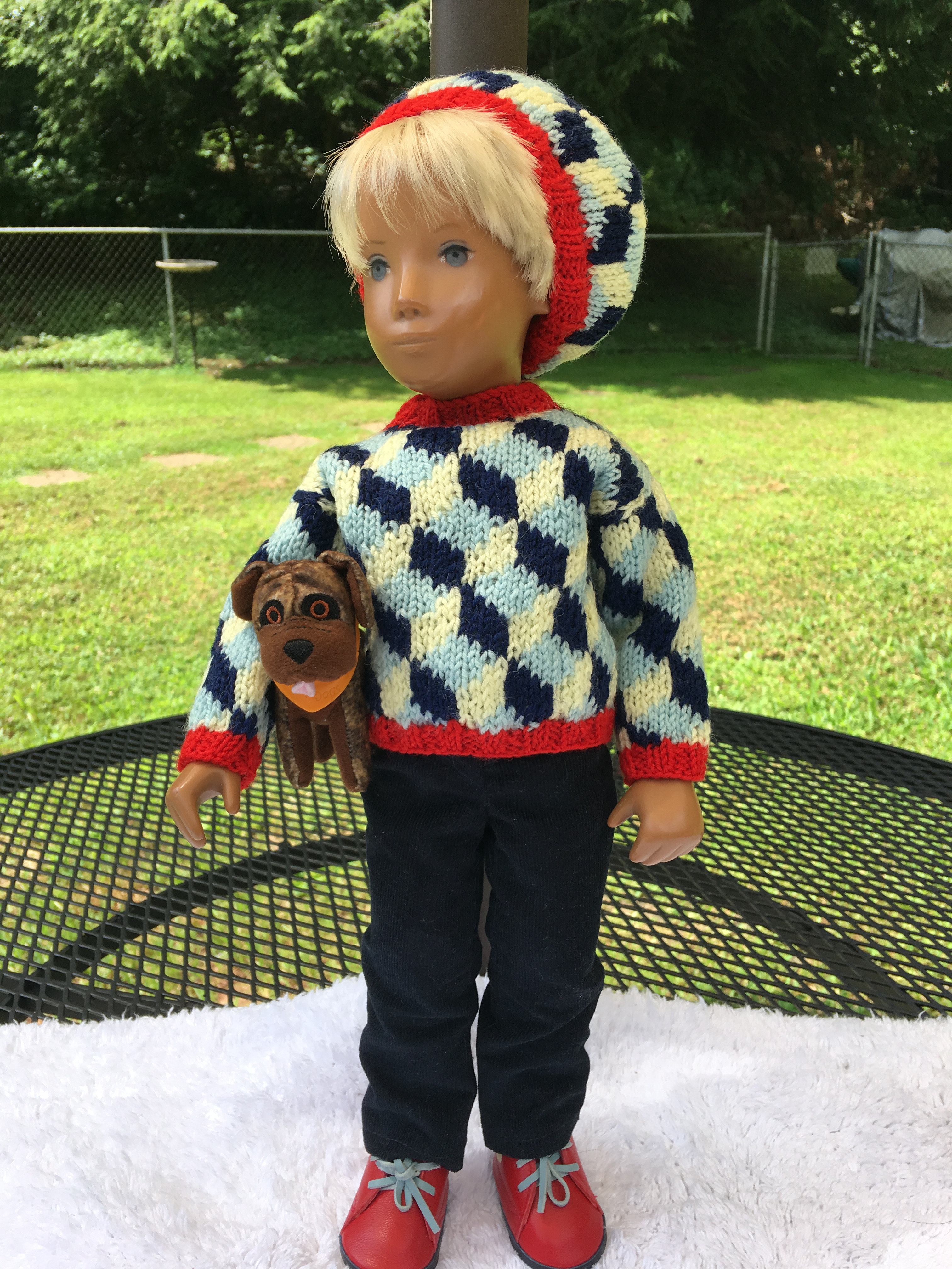 Finn is modeling my big auction win and I understand they added up all the monies to be $15,000.00 for children’s charities before the corporate matches. Wonderful! This remarkable sweater and hat were designed and made by Diane Duke, the perfect navy pants were made by Judith of Dollydoodles and the outstanding leather boots were made by Noreen. What a great outfit! Finn will never want to change outfits ever again and he managed to smile with temperatures in the high 80’s while modeling! Fetch was brave too!