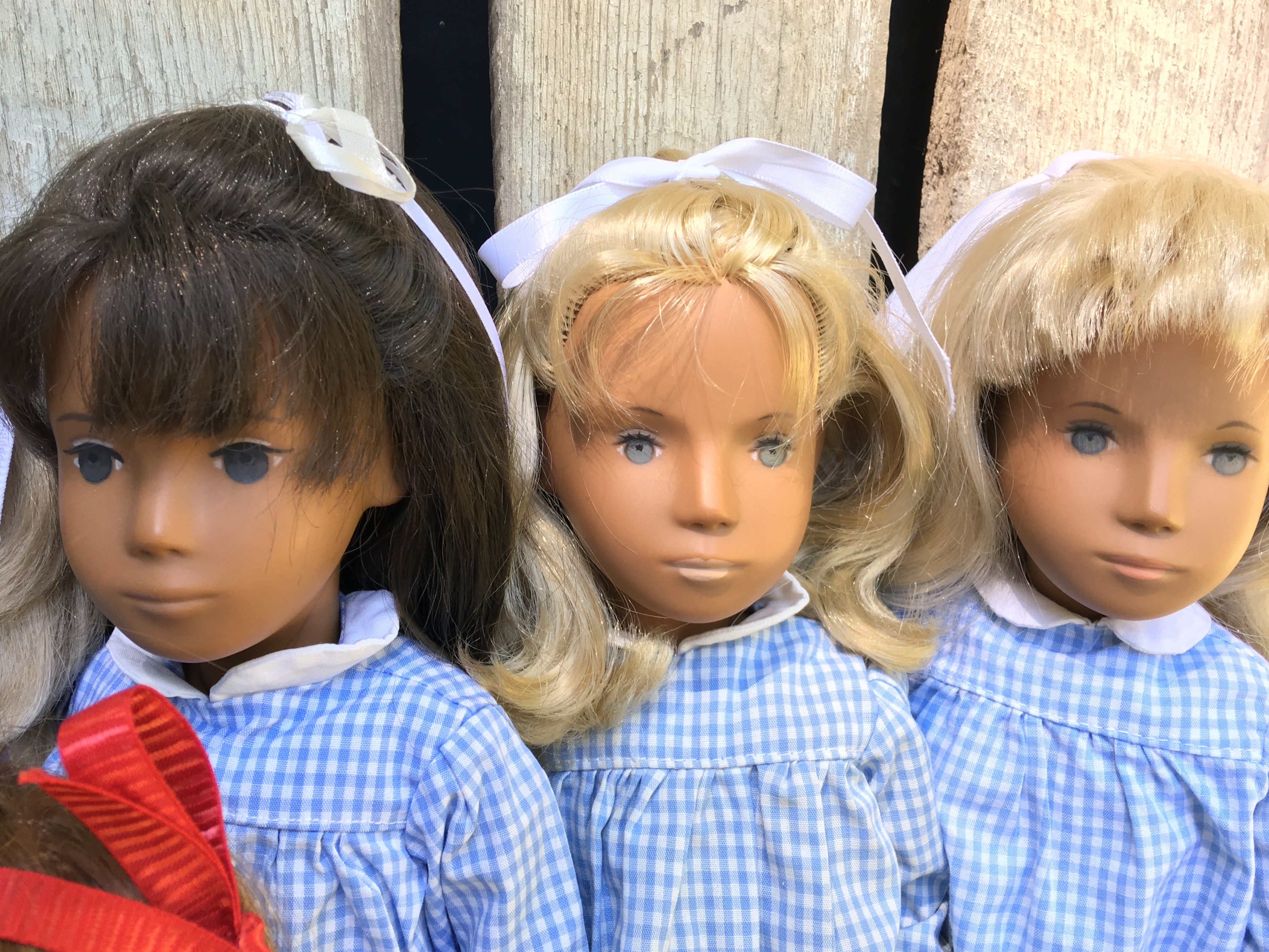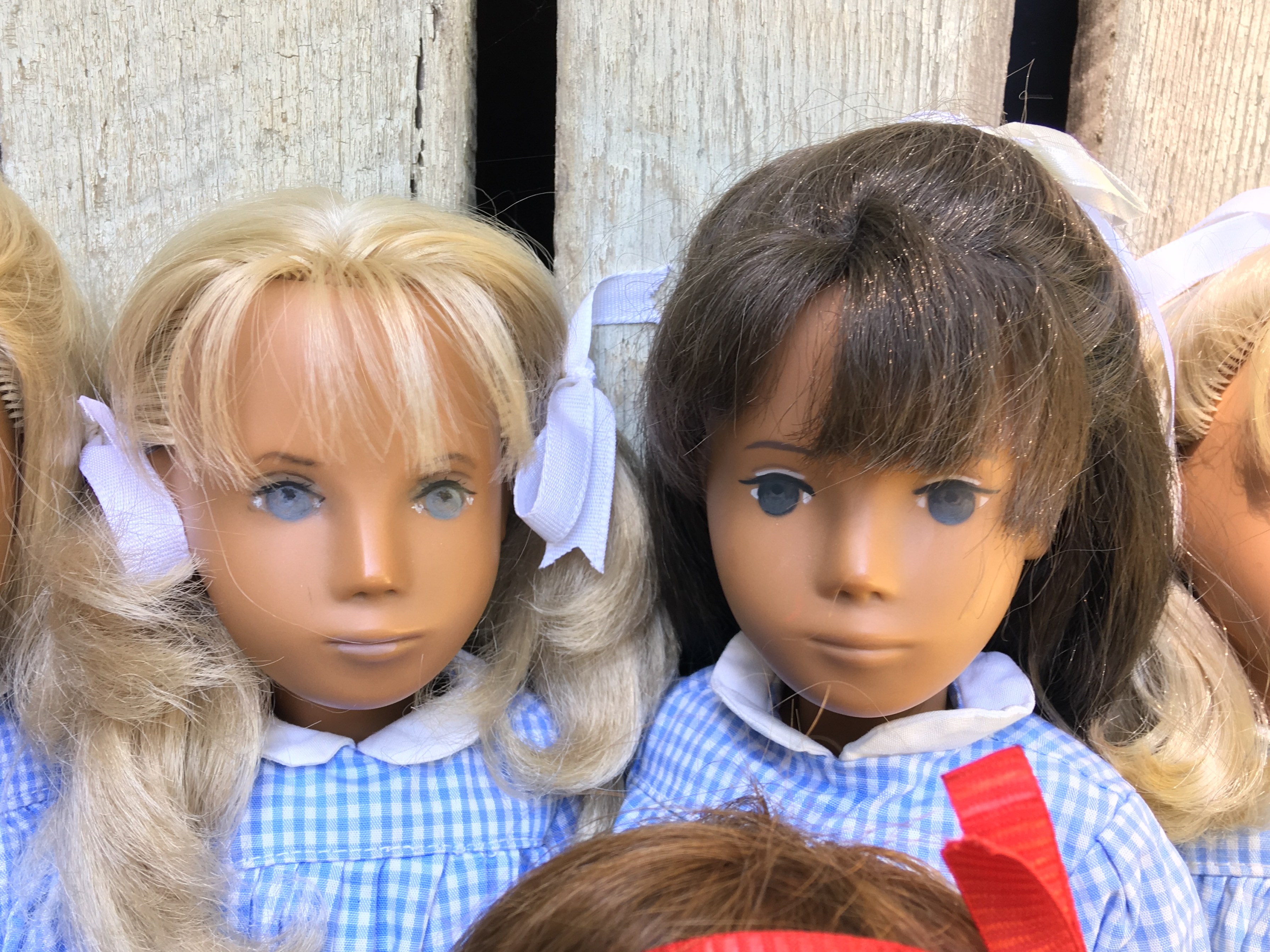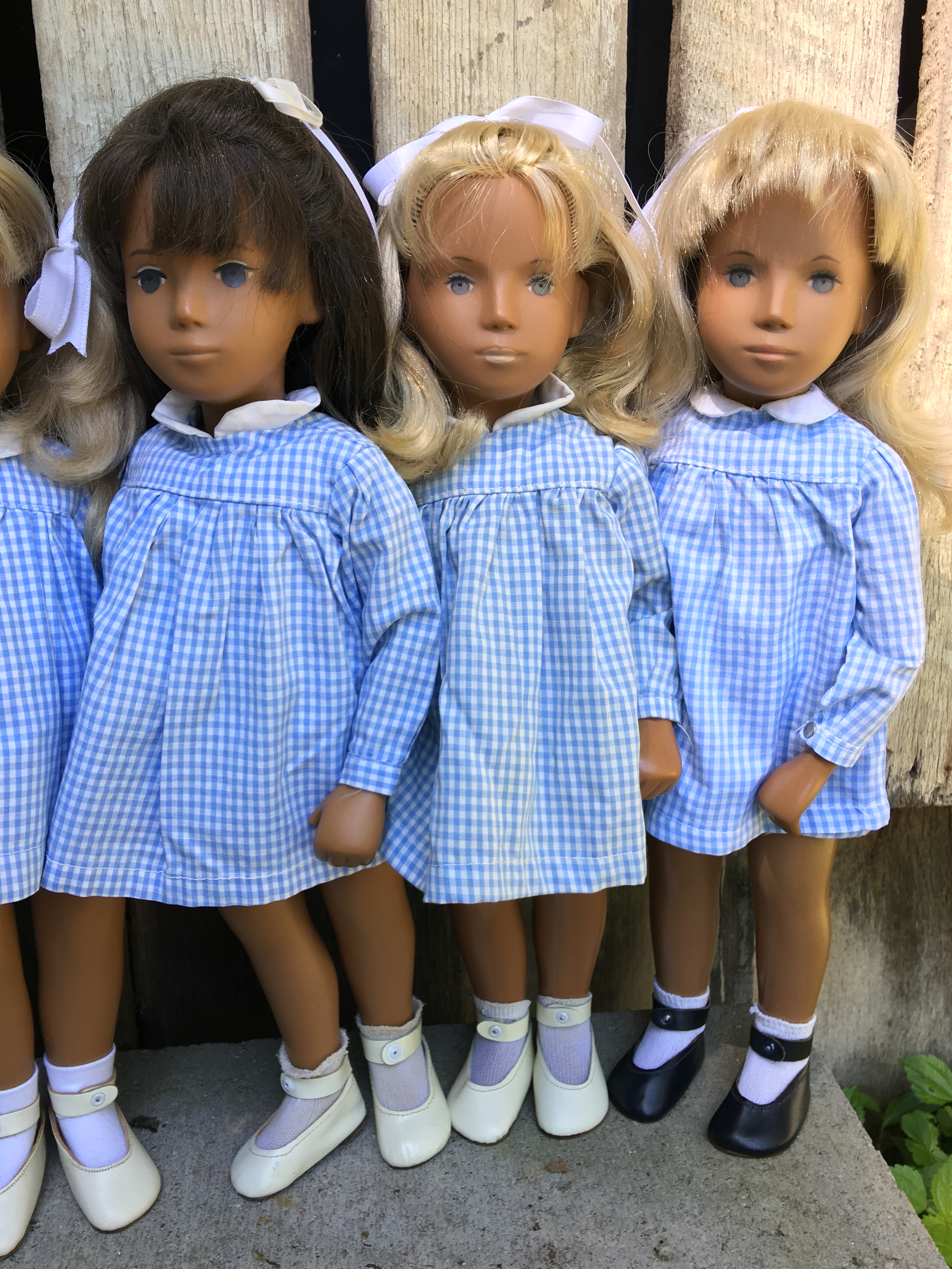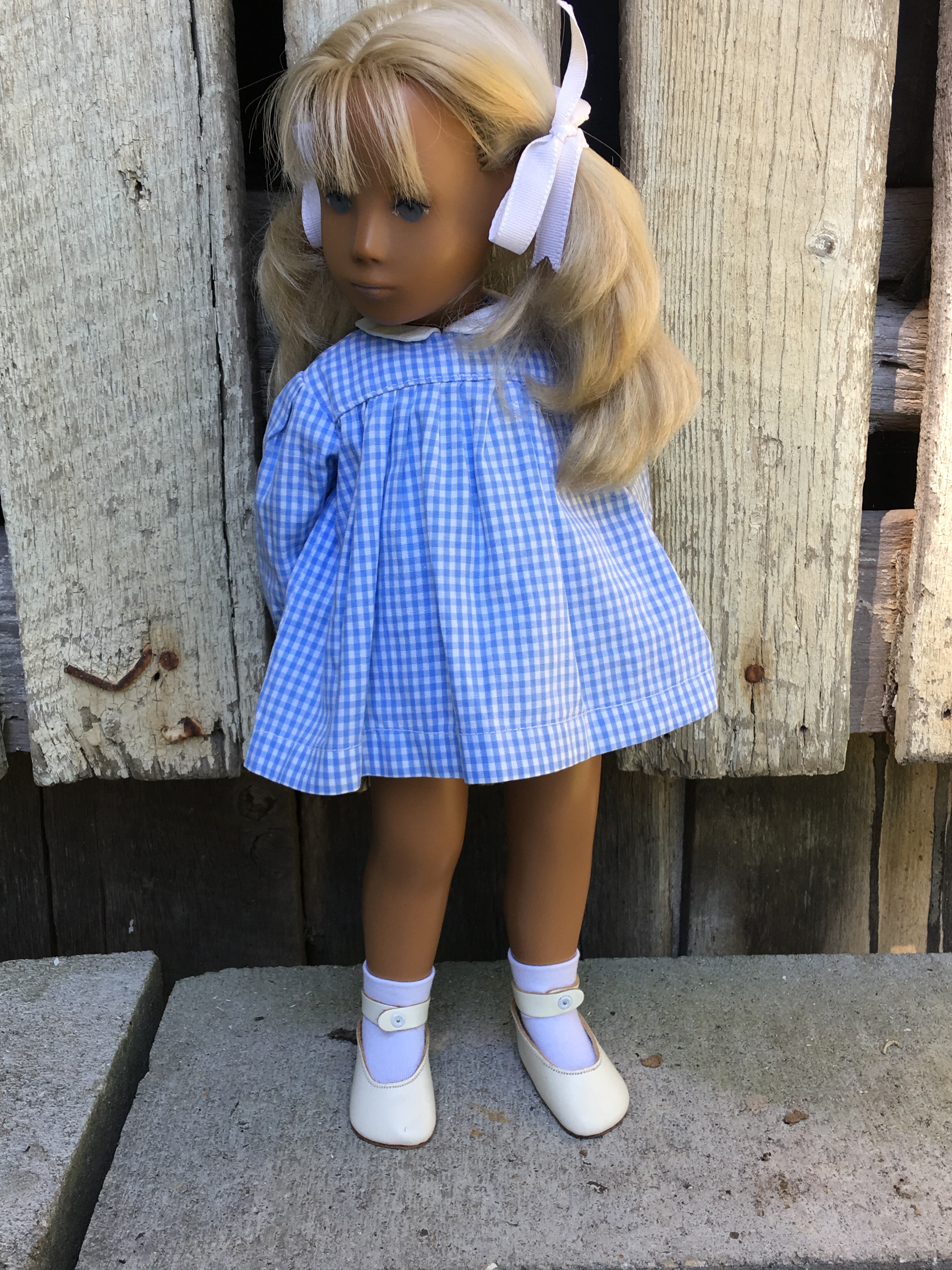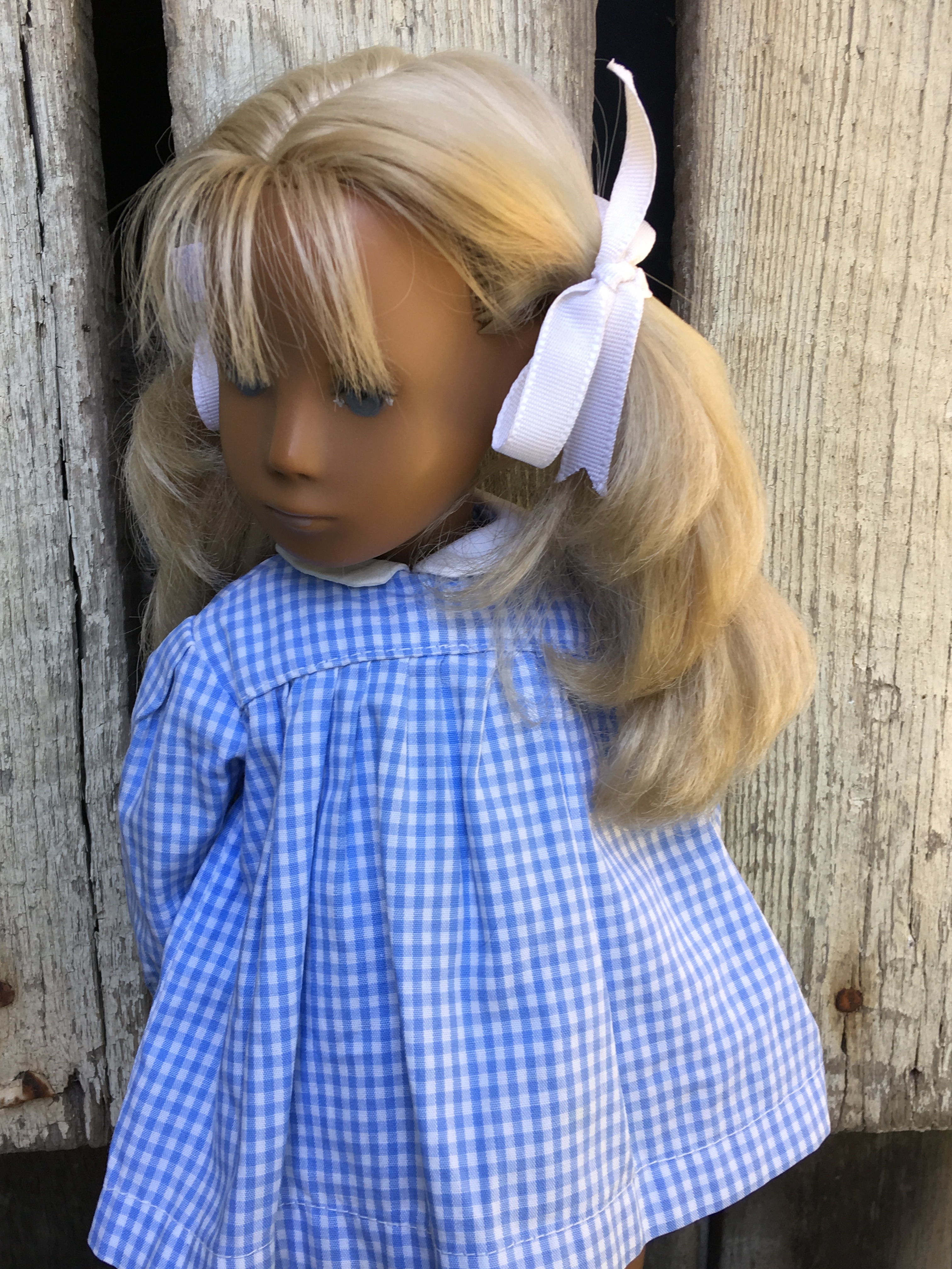 Faith came to Sasha Shangri-La without any clothes! Brrrrr… Now she is wearing a wide skirt mini-check gingham dress that Mummy bought for her. Faith is an early 1968 fringe girl and we have learned that the mini check was made later in 1968. So this dress was probably not one that Faith would have worn from the factory but Faith likes it and so do all of us here on the farm. I hope you like these photos of Faith.