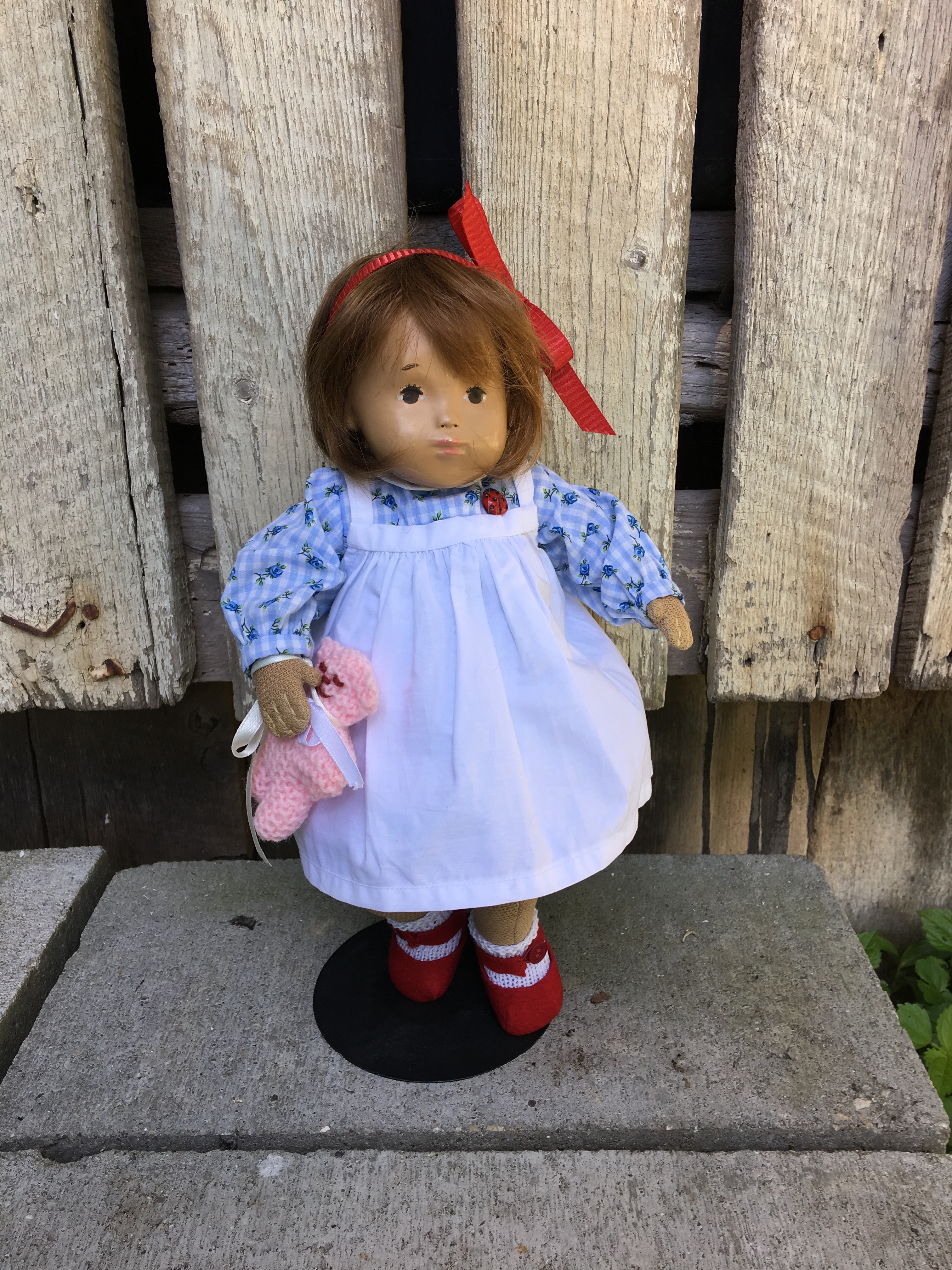 Jenn came to Cow Creek wearing this original gingham outfit with its narrower skirt. She also came in her original crayon tube. Jenn is a 1969 side-part. I hope you like her photos. I gave her a soft bear to love.
