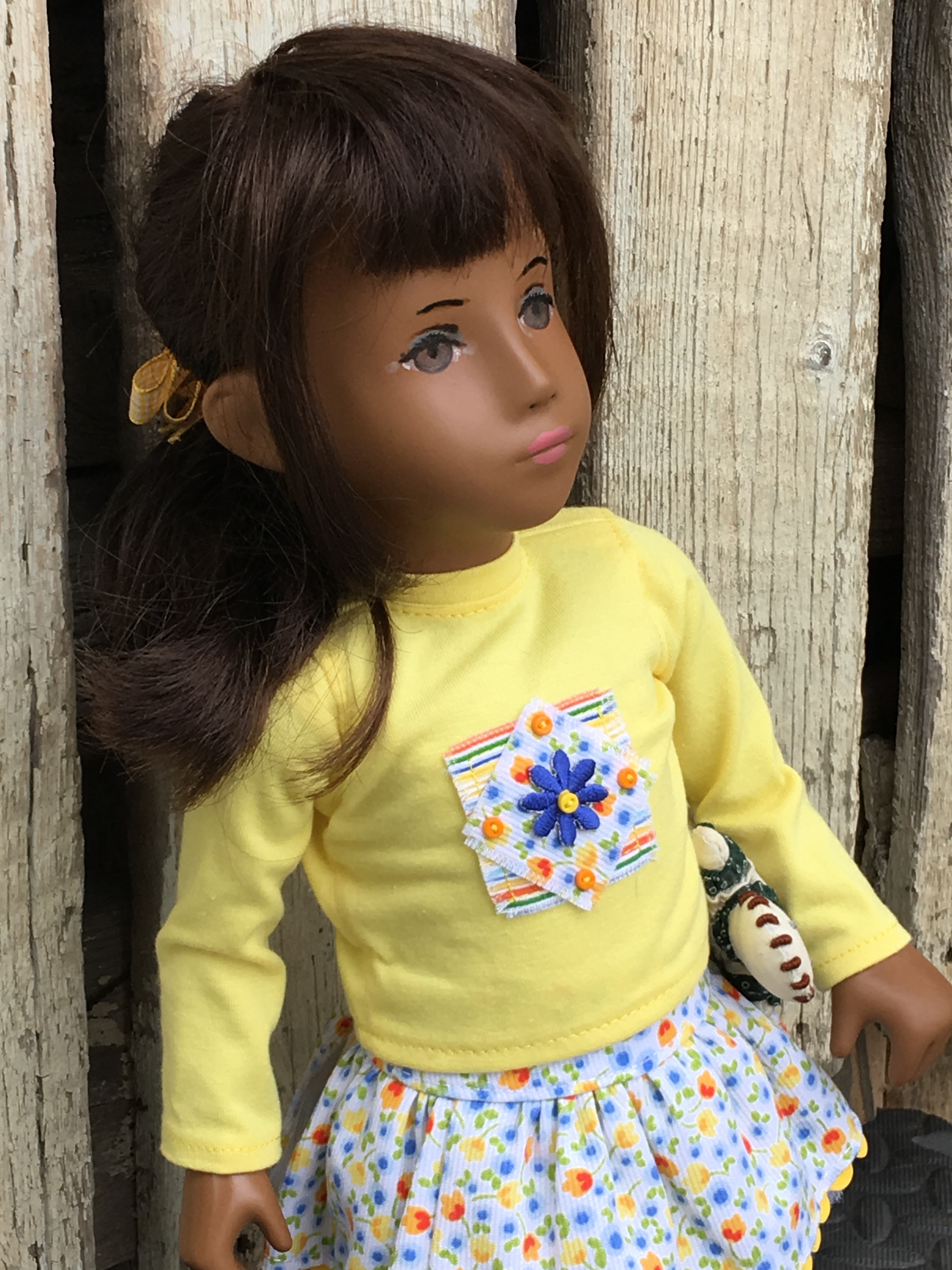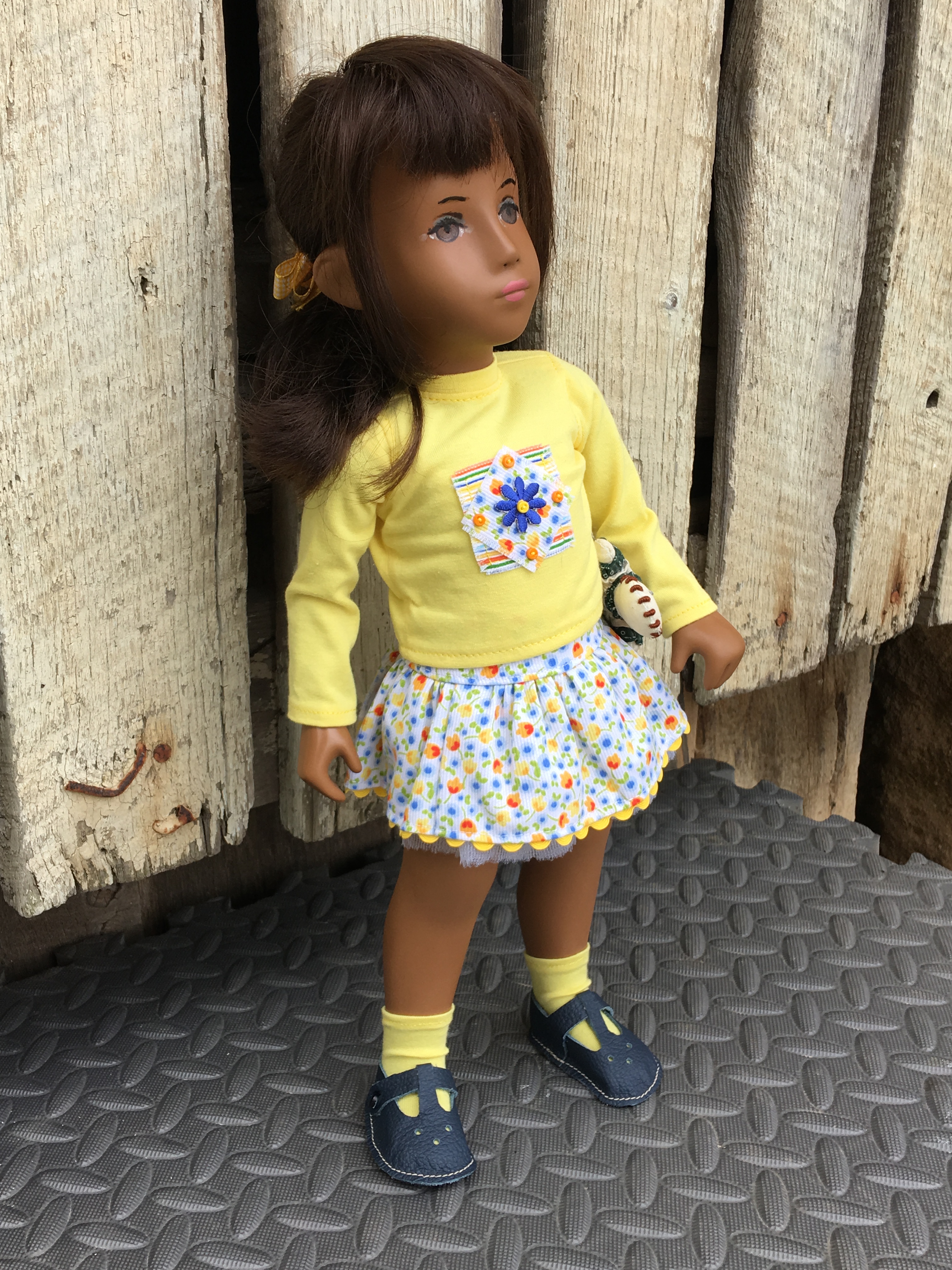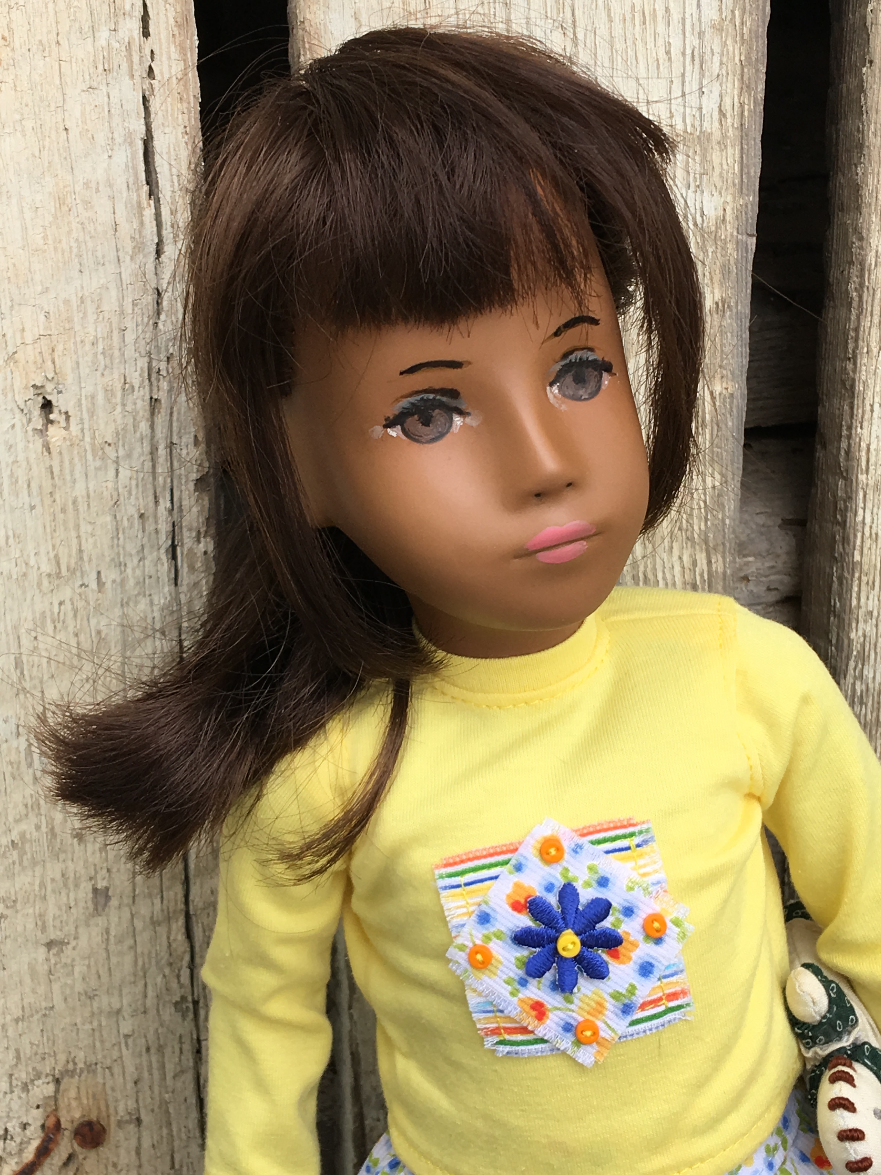 A sweet girl in her apron and sandals. You can see the rick rack trim on her undergarment that is typically seen on Sasha’s undergarments.