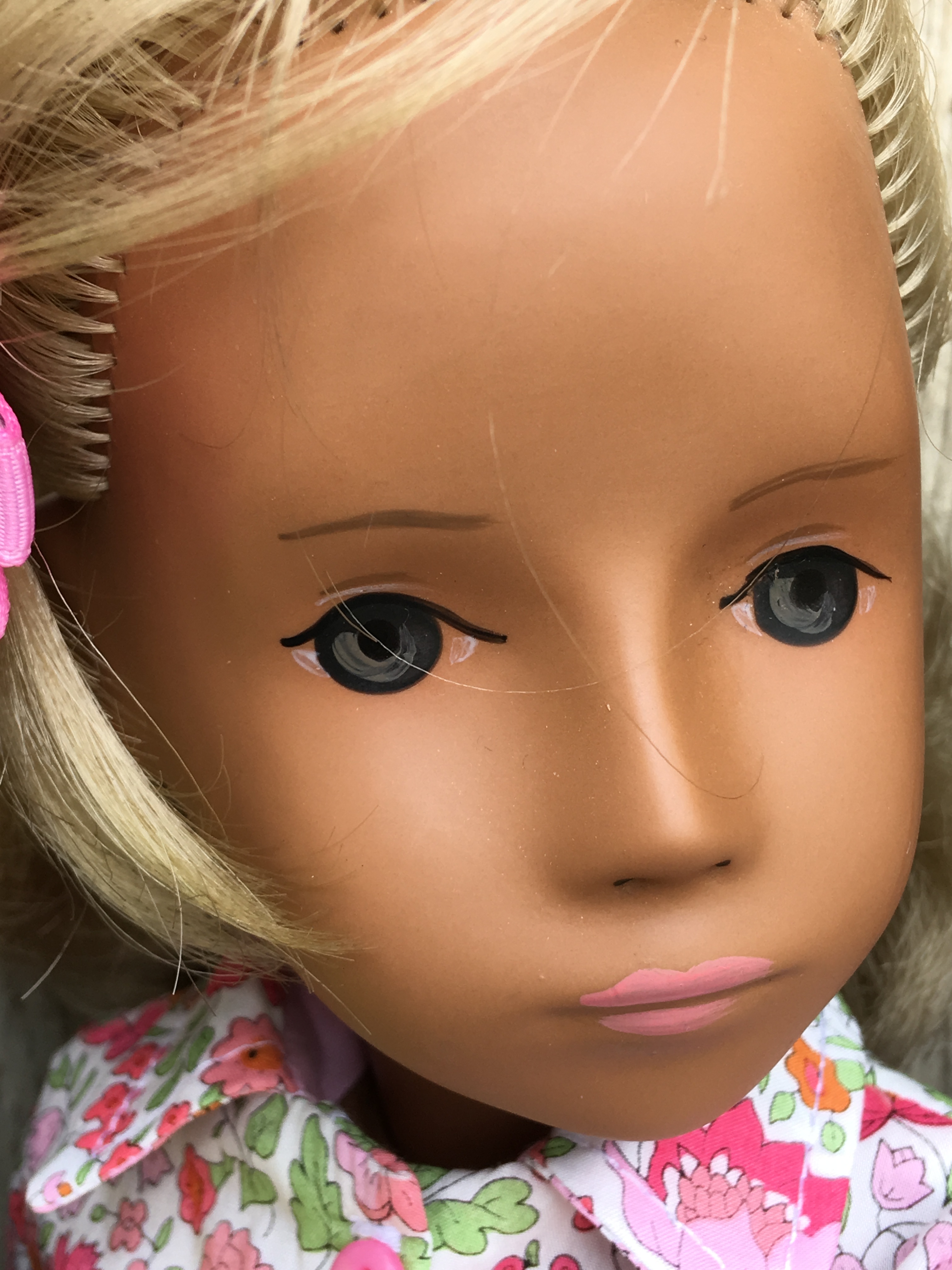 I am showing this most beautiful Sasha Studio girl with her very full plaits once again. Her green eyes are perfect with her green printed dress. I love her ribbons too. I love everything about her.