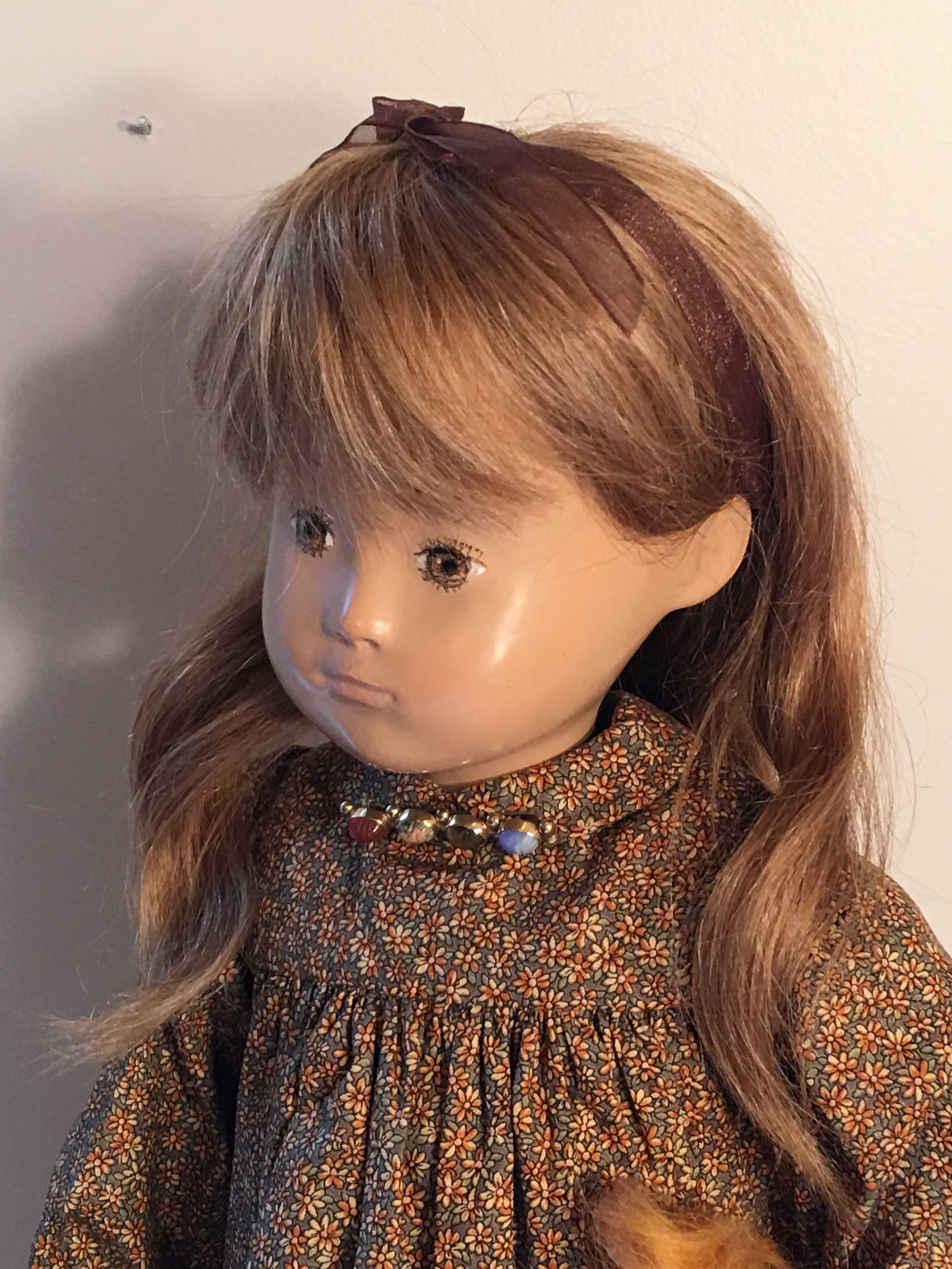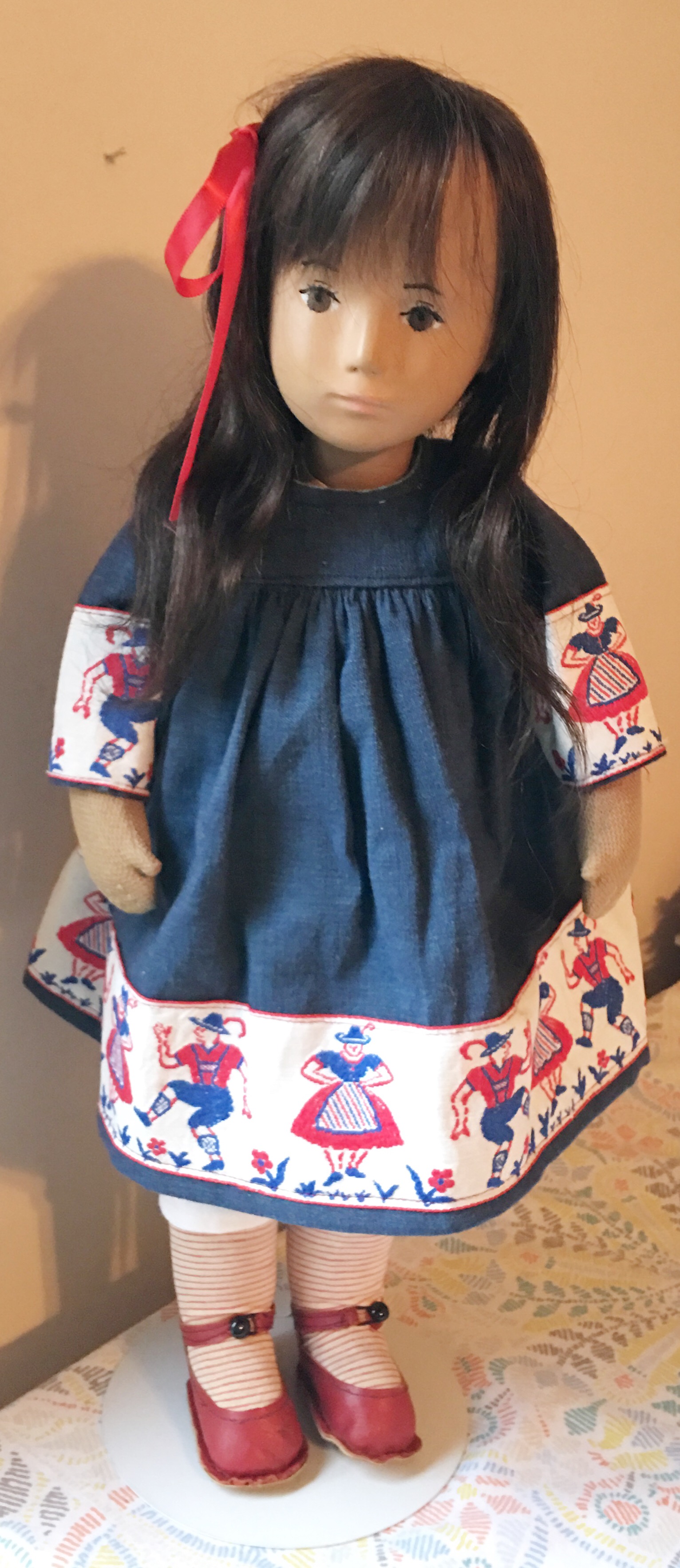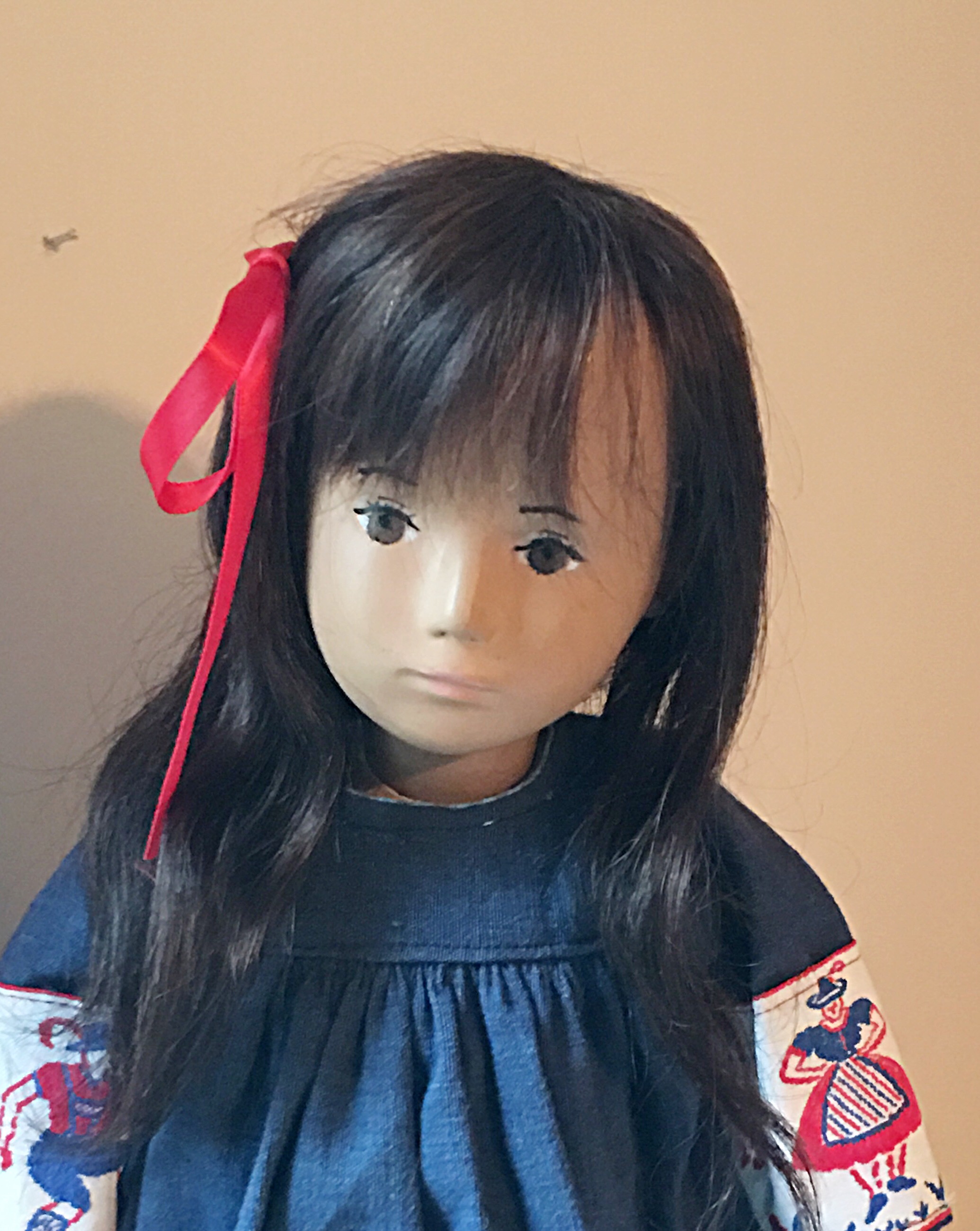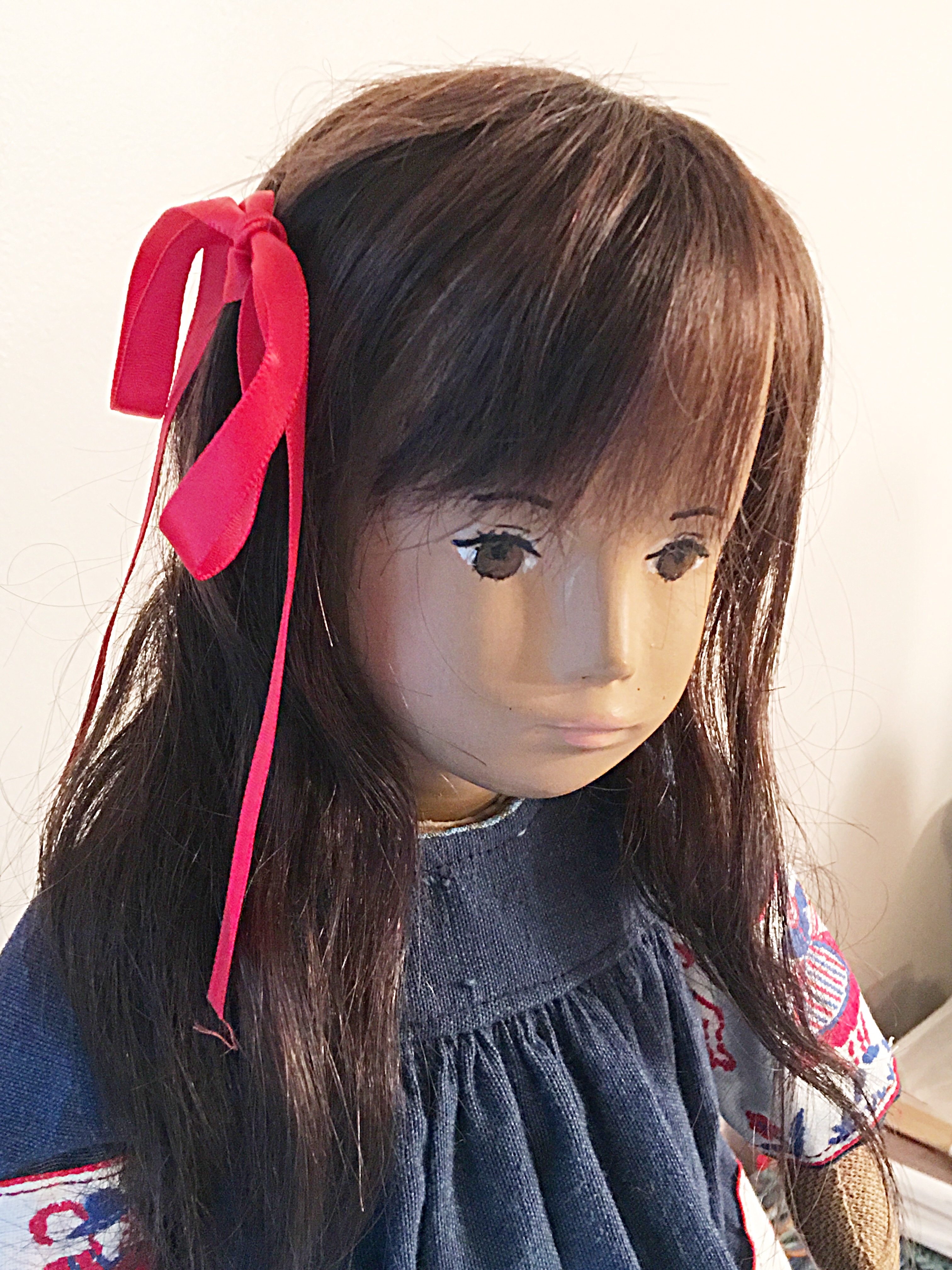 I would like to introduce the first arrival and newest addition to the Sasha Shangri-La family for 2019. Her name is Beatrice and we call her Bea. Bea is a BII Sasha studio doll. B means her body is made of cloth and II is her face mold number. Bea had been redressed when she arrived and so I dressed her in this beautiful Ruth’s dolls outfit and added a childhood, scarab bar pin.