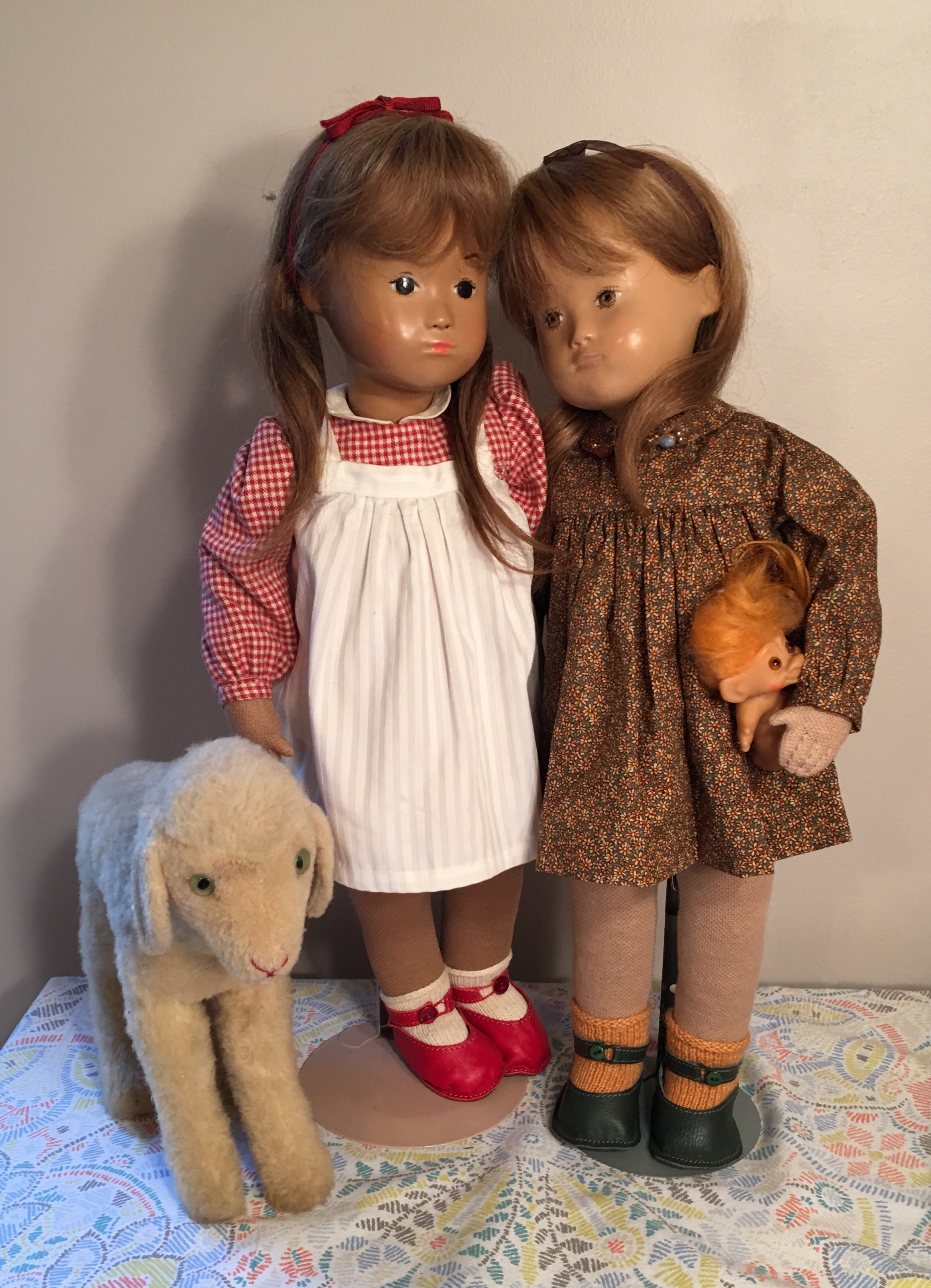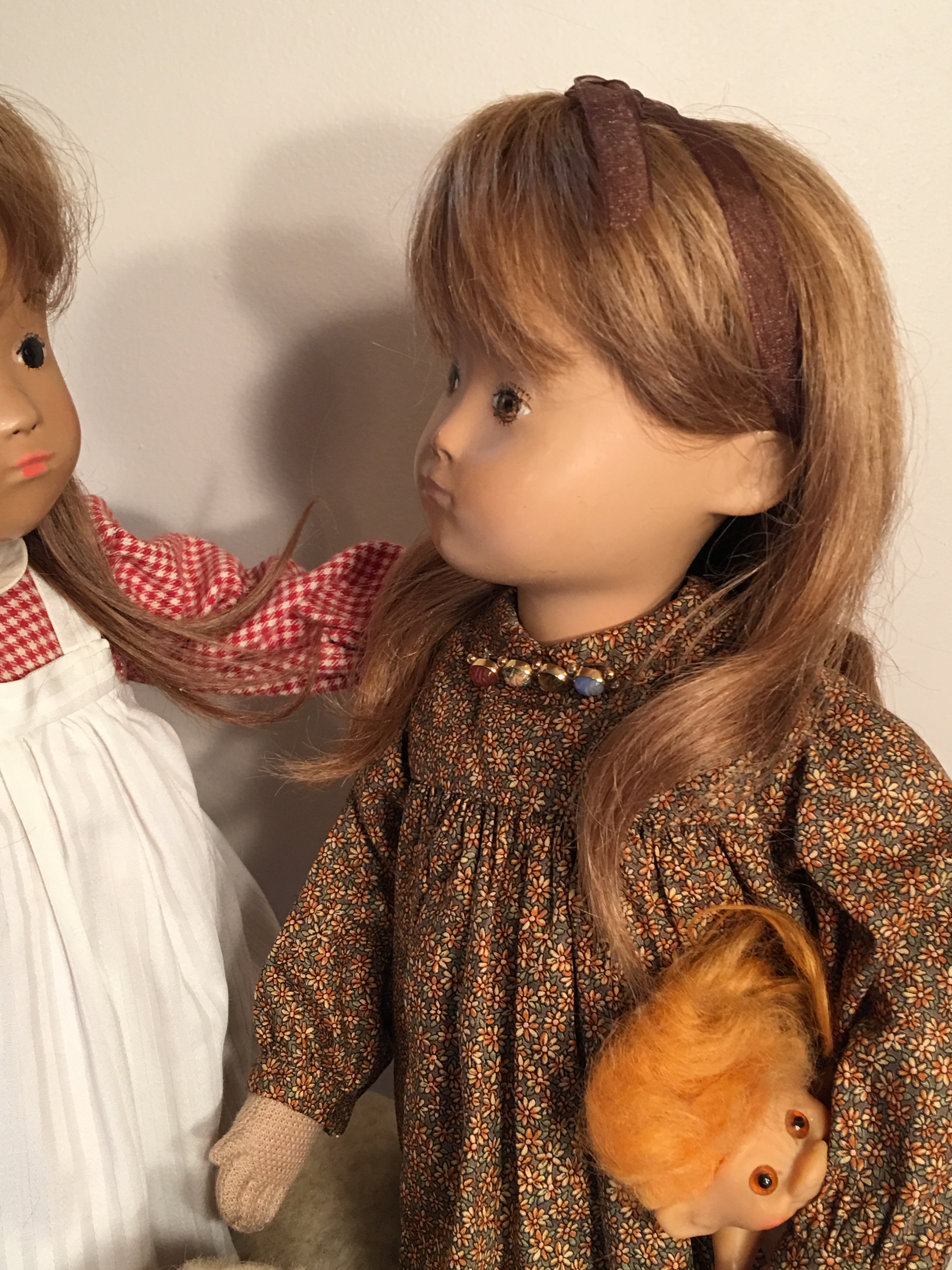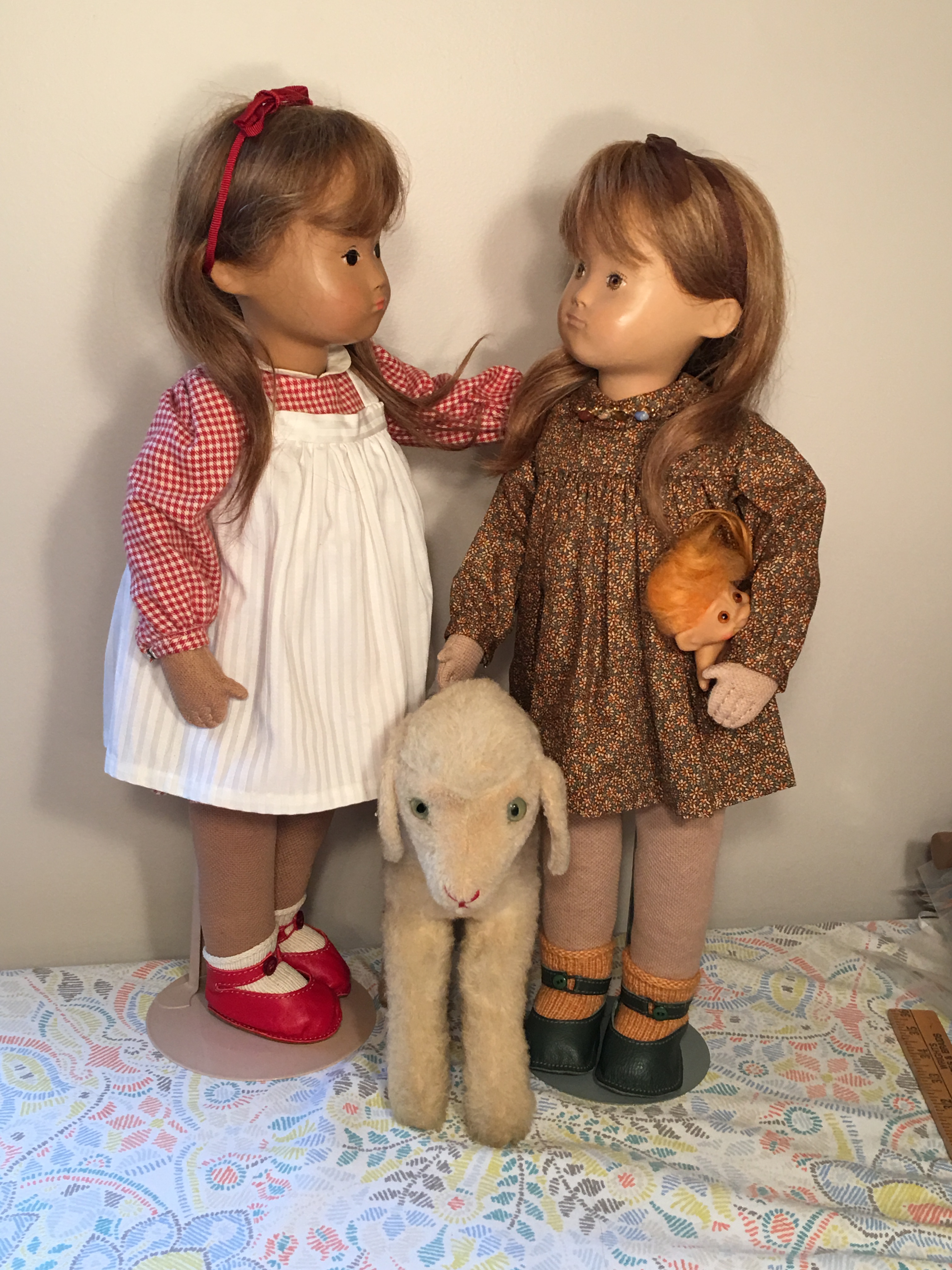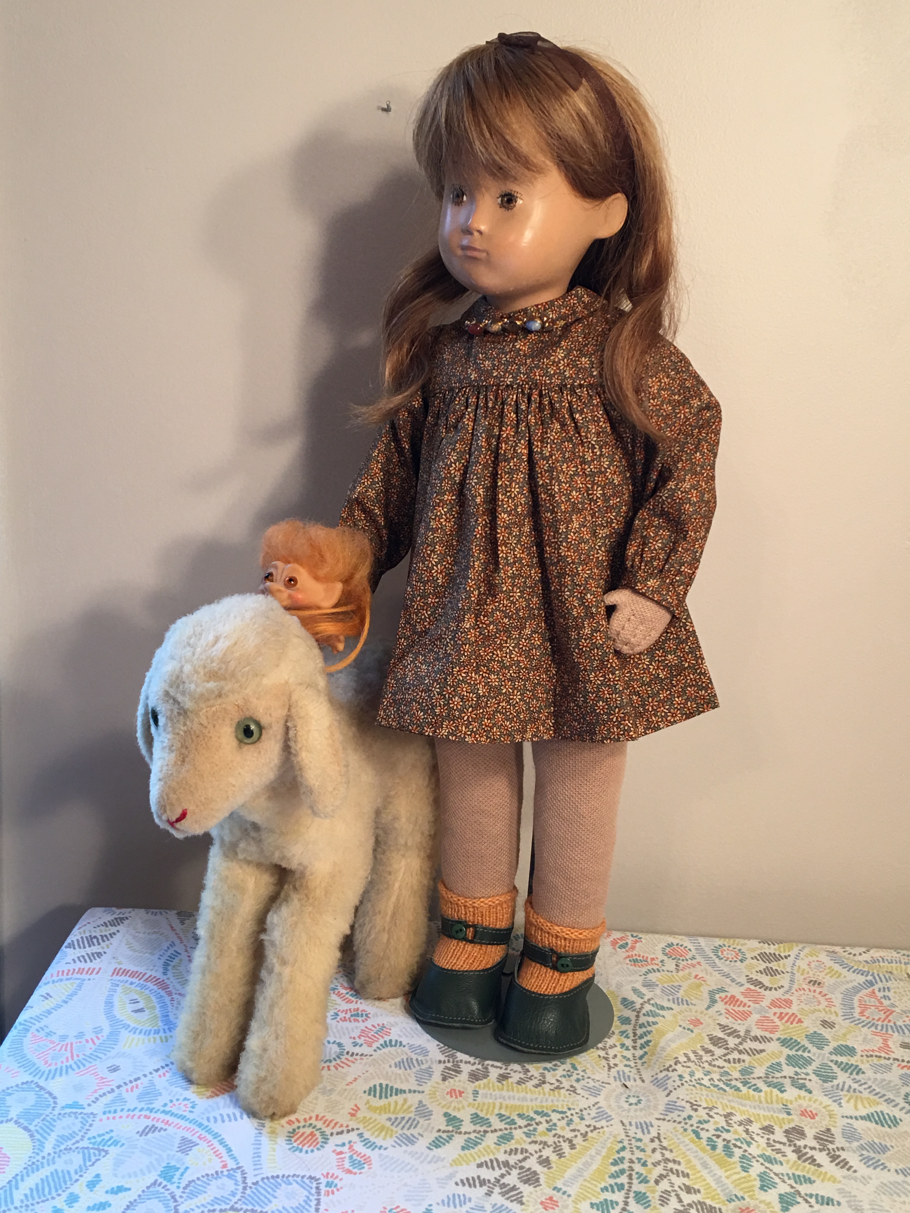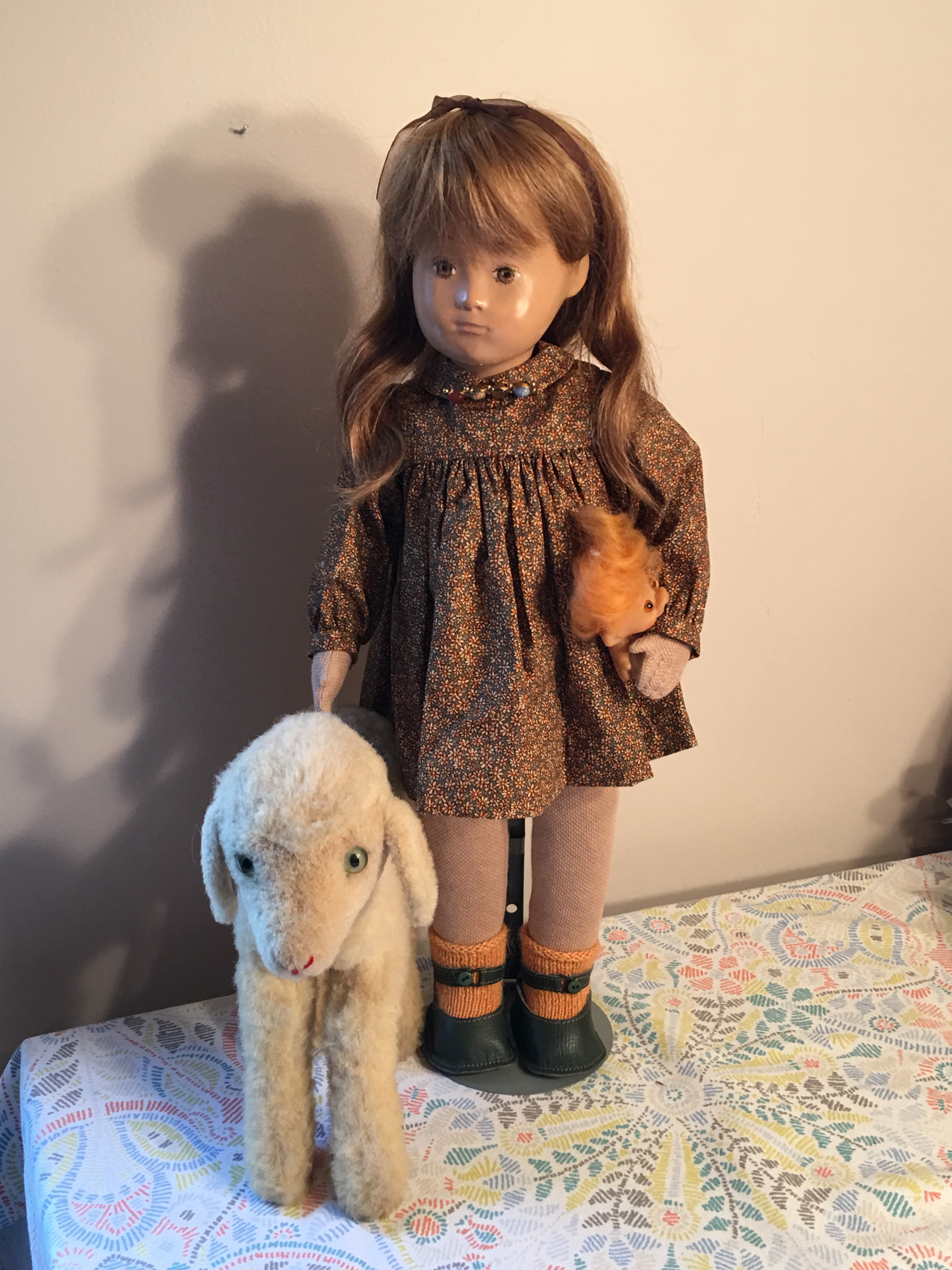 She loves this dear little troll doll which is my sole remaining childhood doll and this sweet Steiff lamb just happily follows her around. 🐑