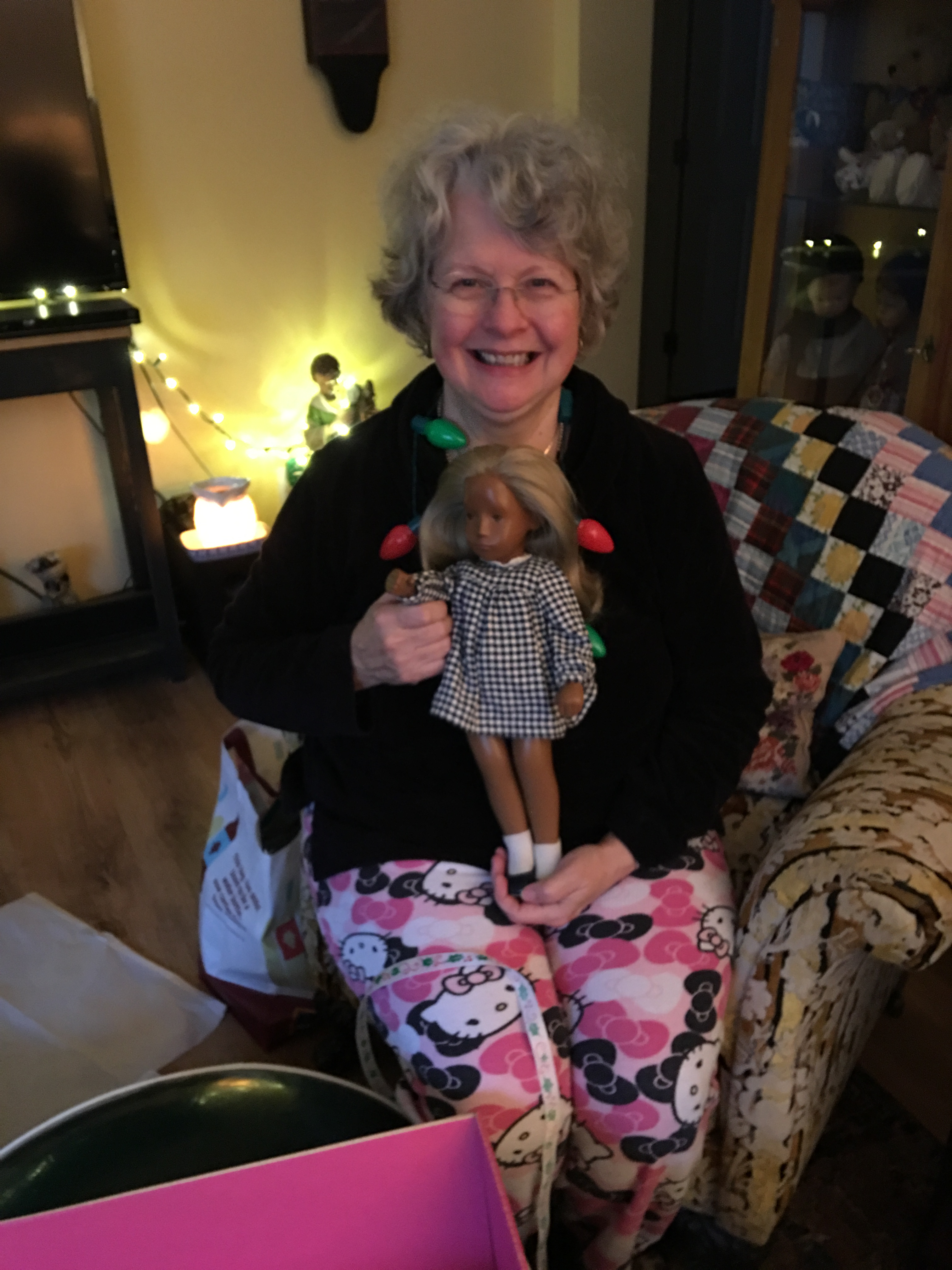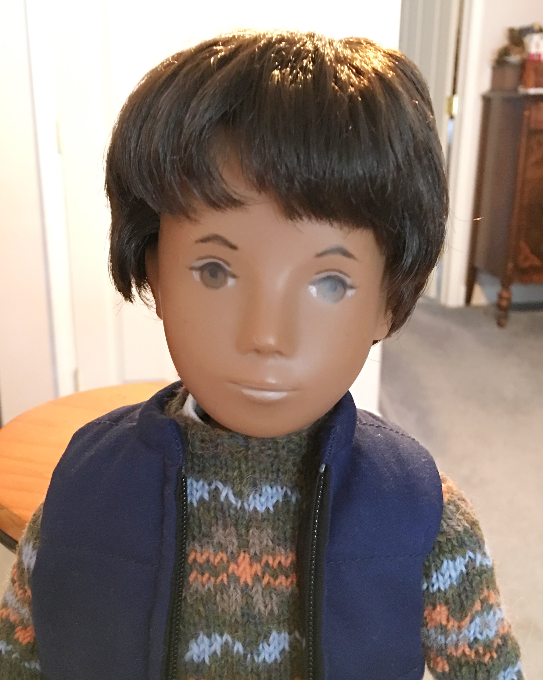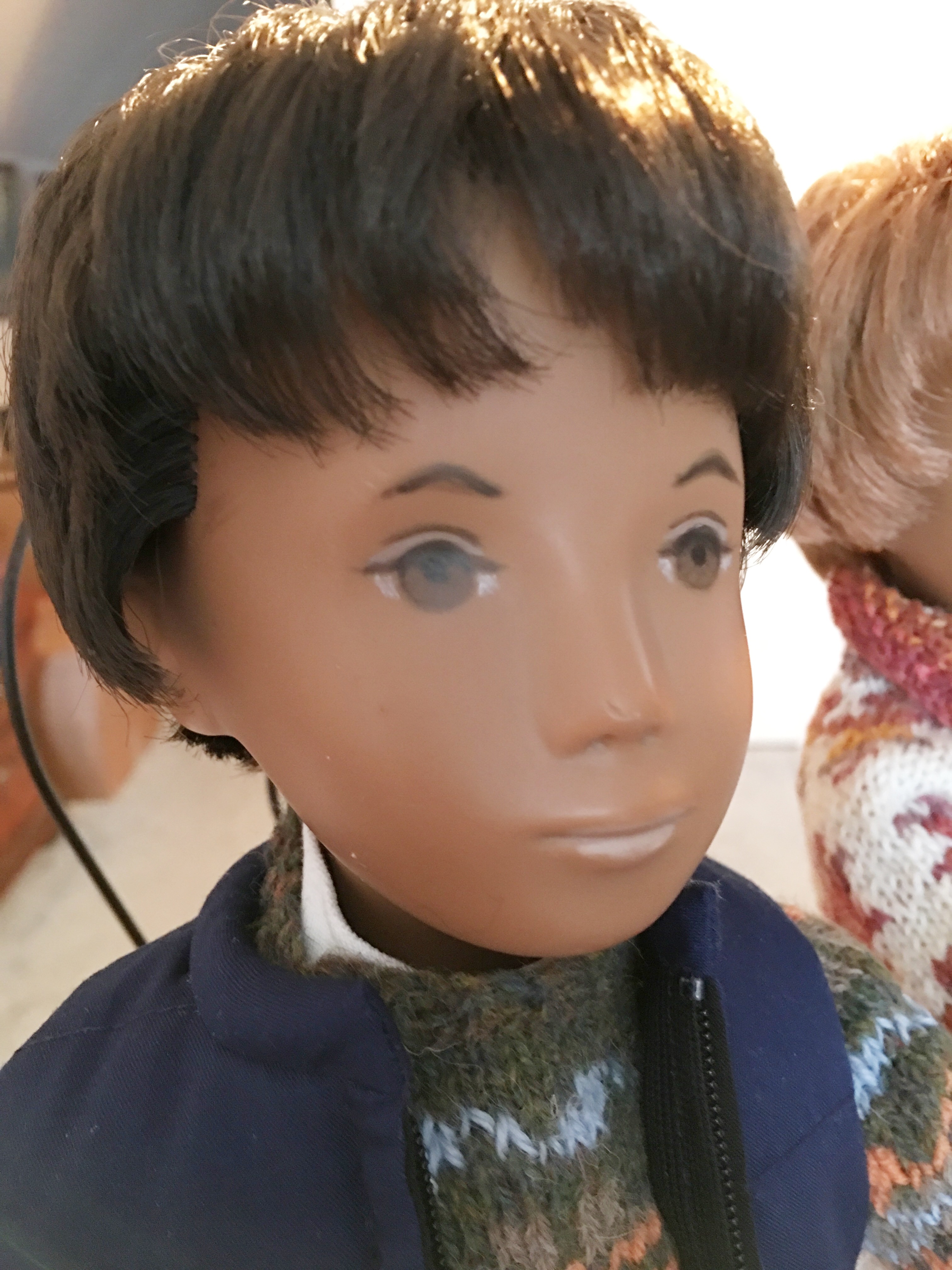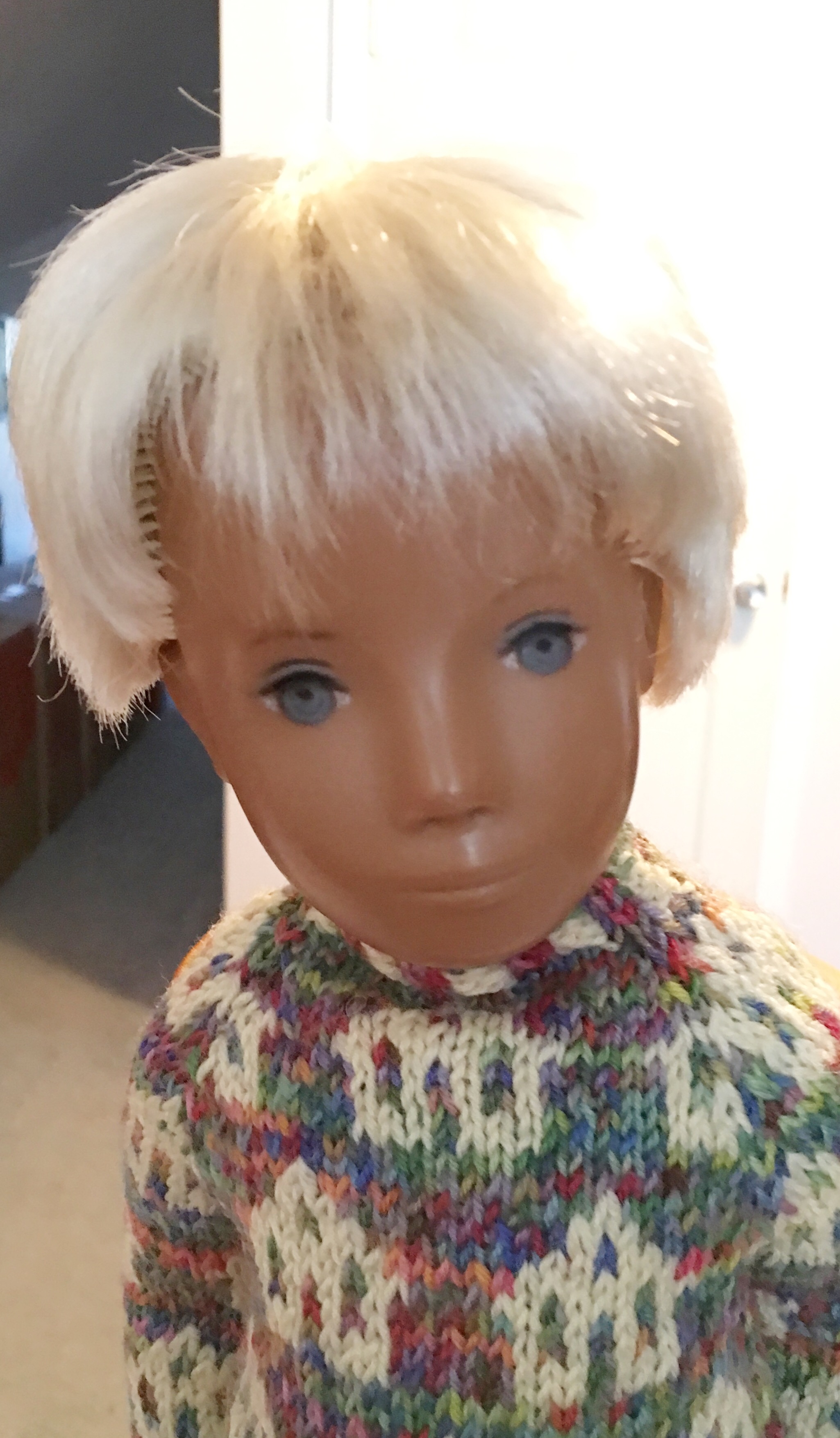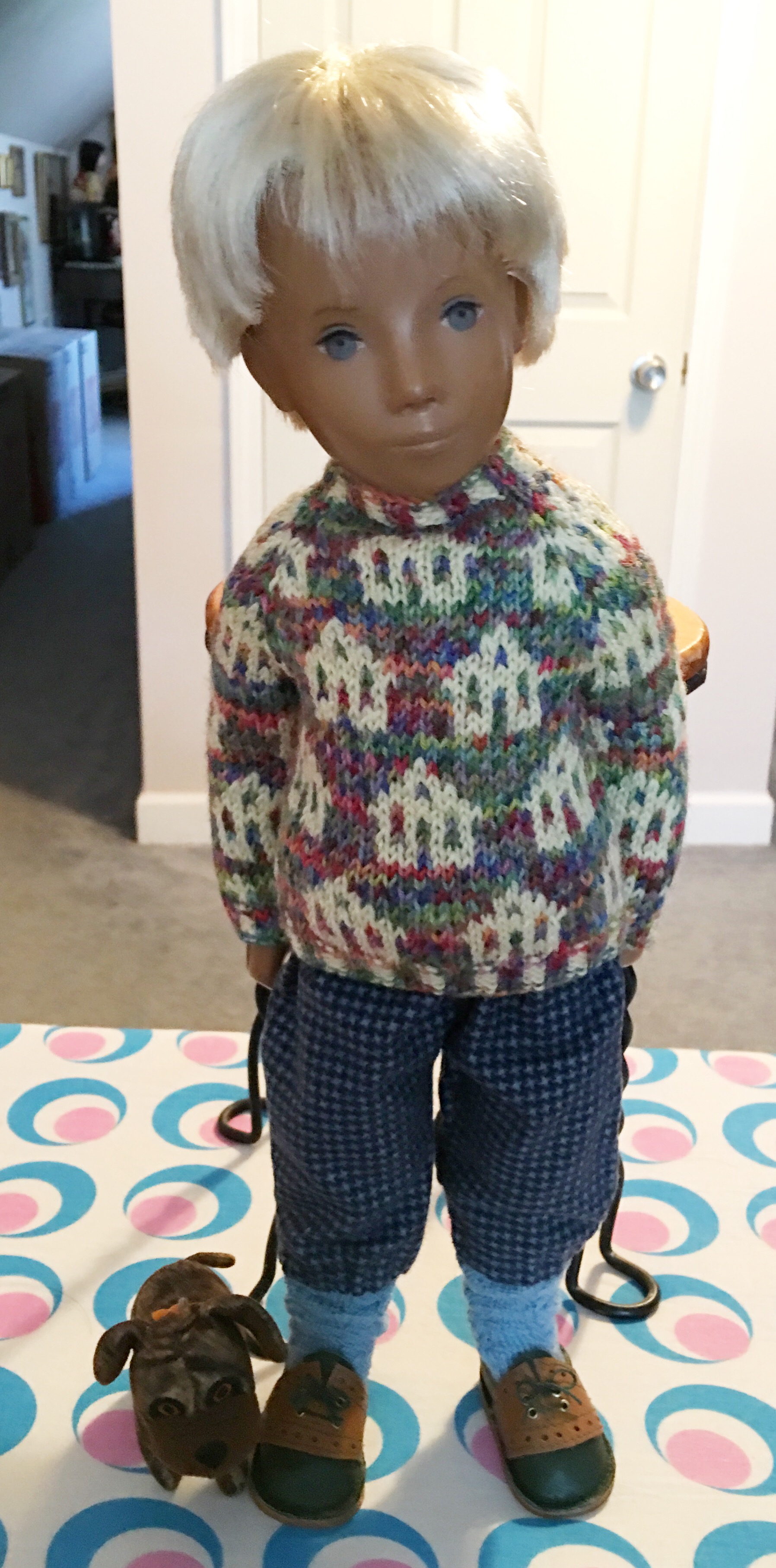 Ferris is wearing a knitted sweater, maker unknown and Ruthsdolls denim dungarees.