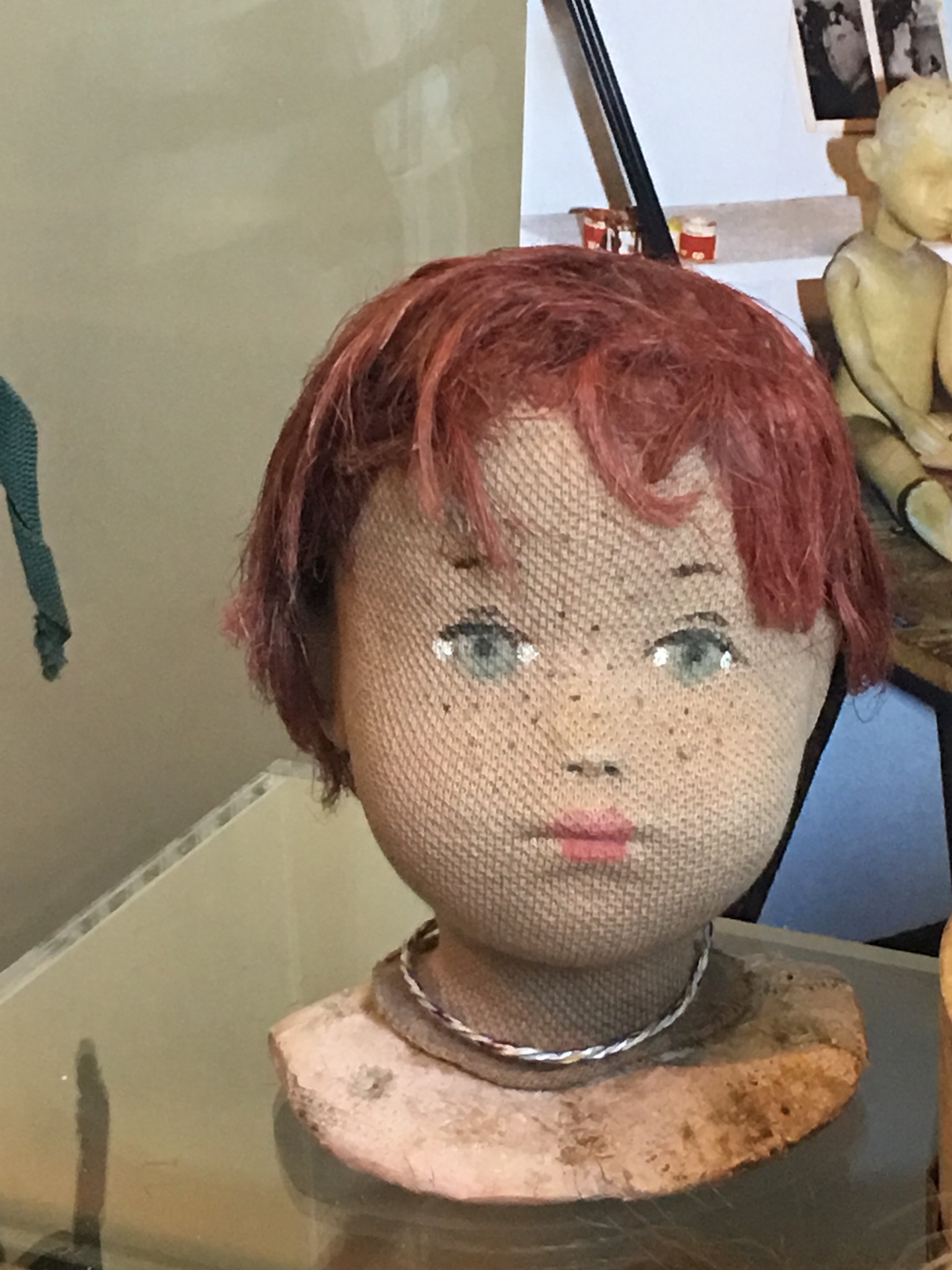 A beautiful head painted by Sasha and would be an A-I studio doll if joined to the proper body. Such beautiful painting on this tricot covered mold and lovely red hemp wig.