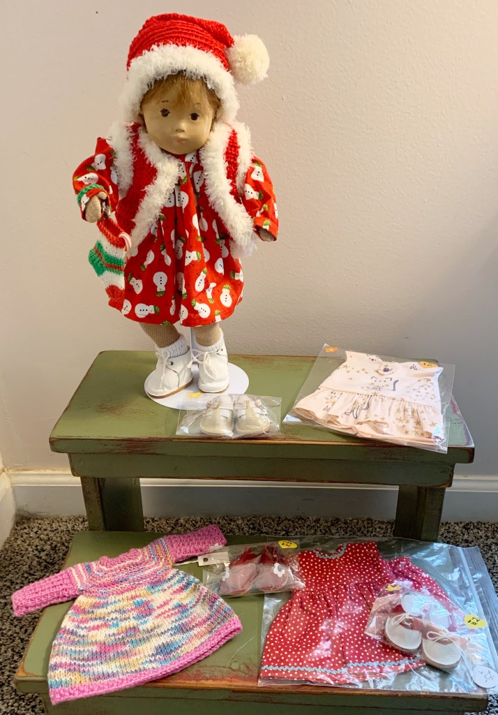 This sweet knitted outfit for a Sasha baby was my win in the gift exchange.