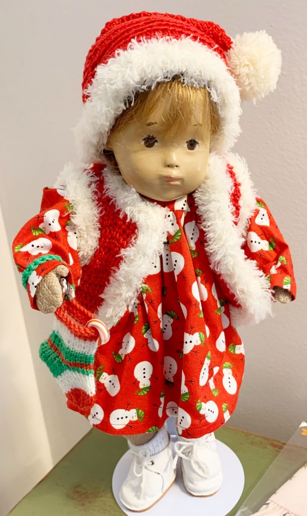 I brought this sweet baby girl to sell. I already have a quirky browed girl named Pixie and thought I would adopt this sweet girl to a new family. She was wearing a beige crocheted outfit that sold in the sales room to an admirer. No one wanted the baby. So I bought this outfit for her and it is perfect! It was made by Janet Myhill Dabbs.