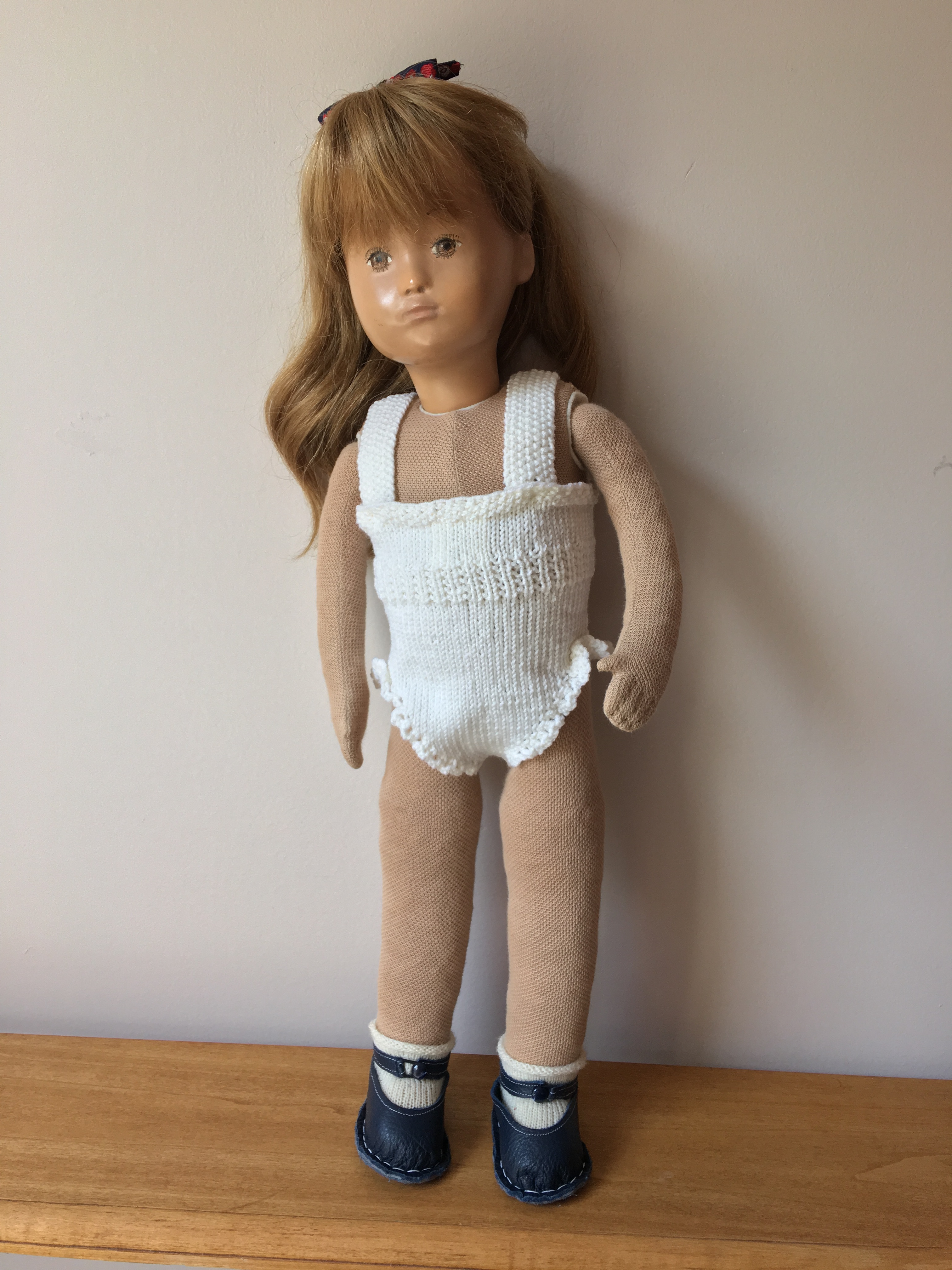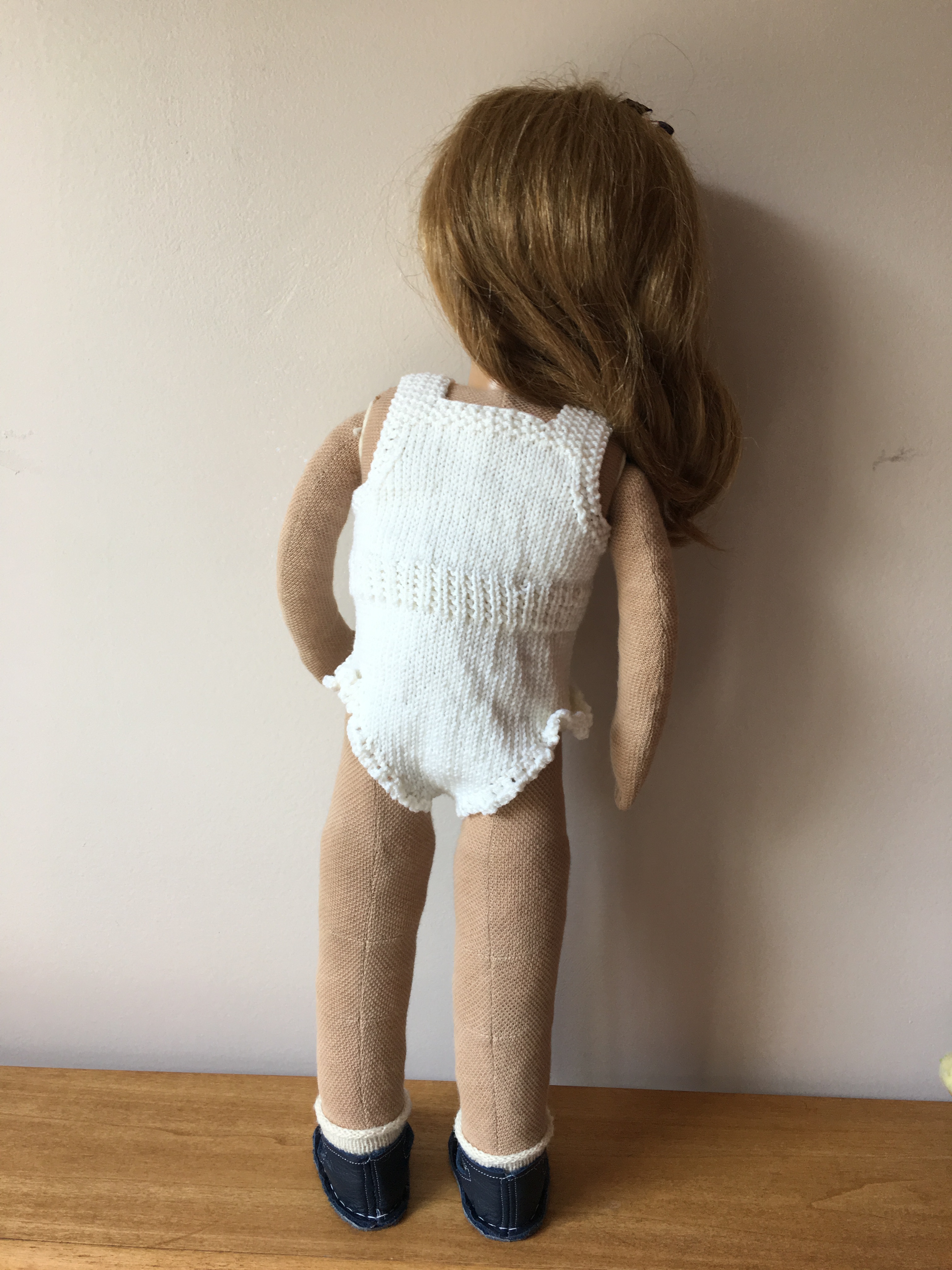 My onesie was knitted by Rosie Laird. Mommy saw on Facebook that Rosie knitted a onesie for the 16 inch vinyl Sasha dolls. So she wrote to Rosie and asked her if she would knit a larger version for a studio doll like me! Rosie said yes, Mommy provided measurements, and look at the beautiful knitting I now have! Thank you Rosie! 🌹