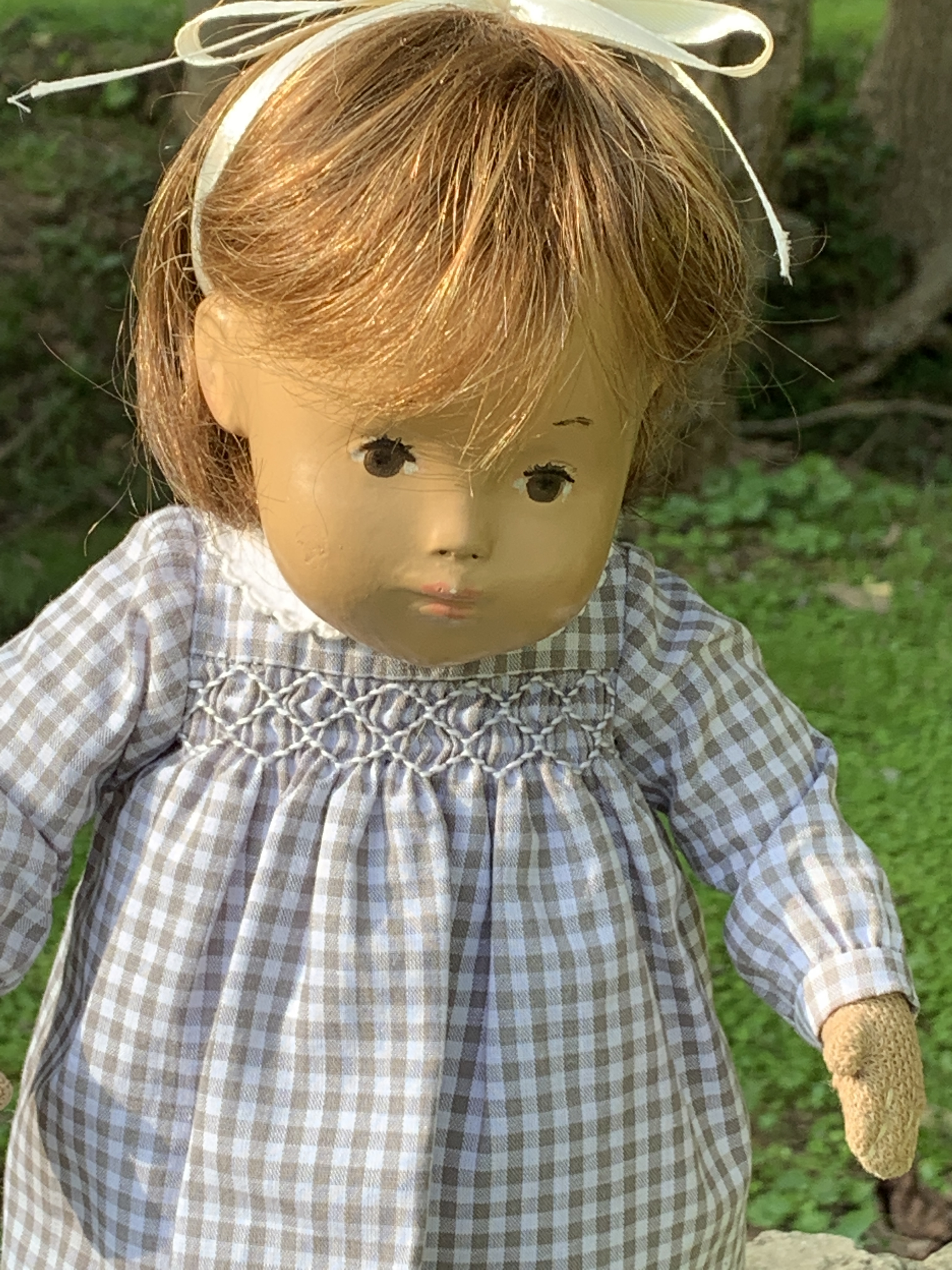 Evie is wearing a beautiful smocked dress made by Thu Cuc Faes in Switzerland. I love the fabric.  Her red leather shoes were made by Ruthsdolls.  That is Chloe next to her.  She is a 1966 brunette NP.